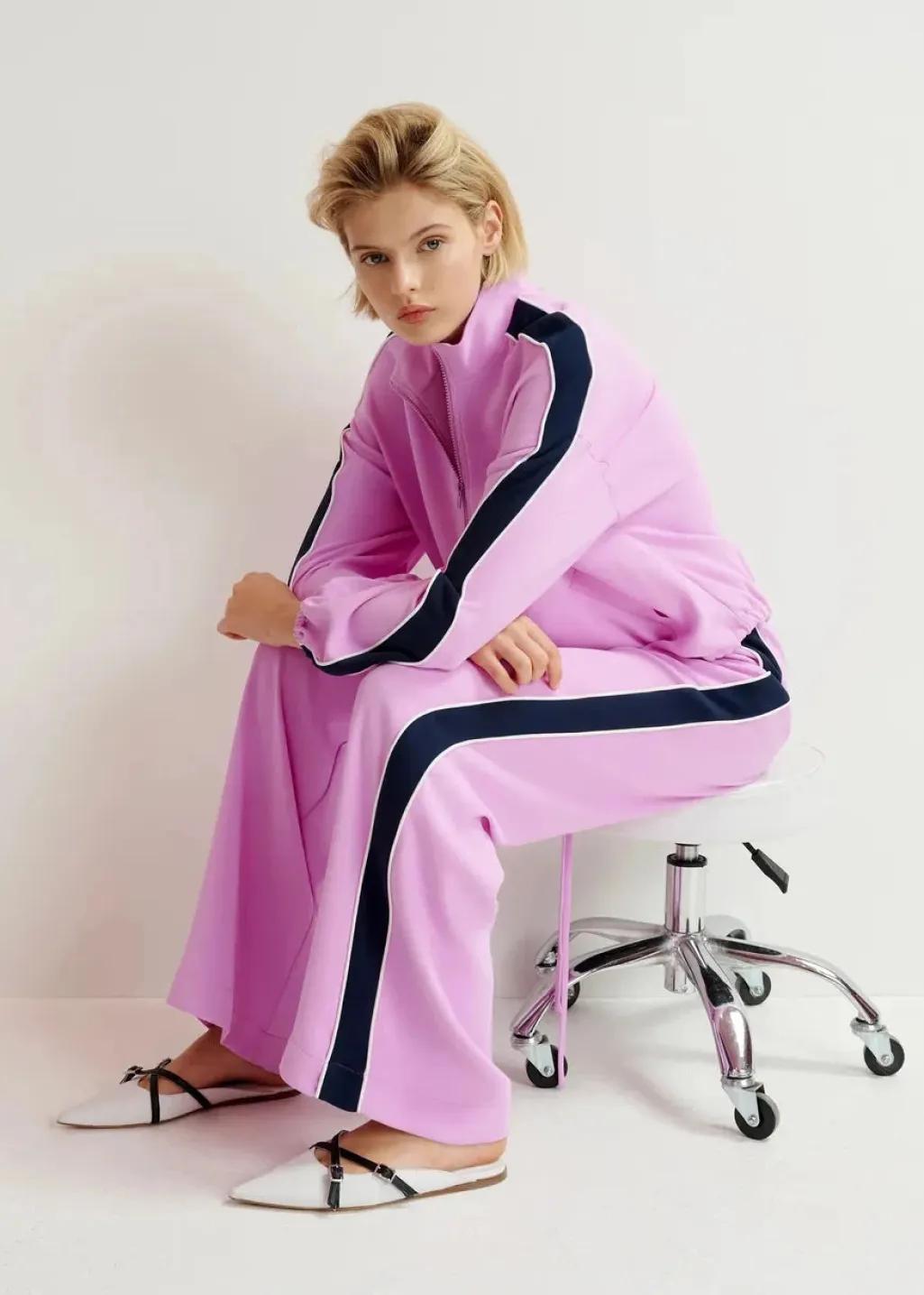 Sportsjakke fra Essentiel Antwerp i pink lavendel med høj krave og lynlås. Jakken har marineblå striber langs ærmerne og bindebåndsdetaljer, der giver et sporty udtryk.