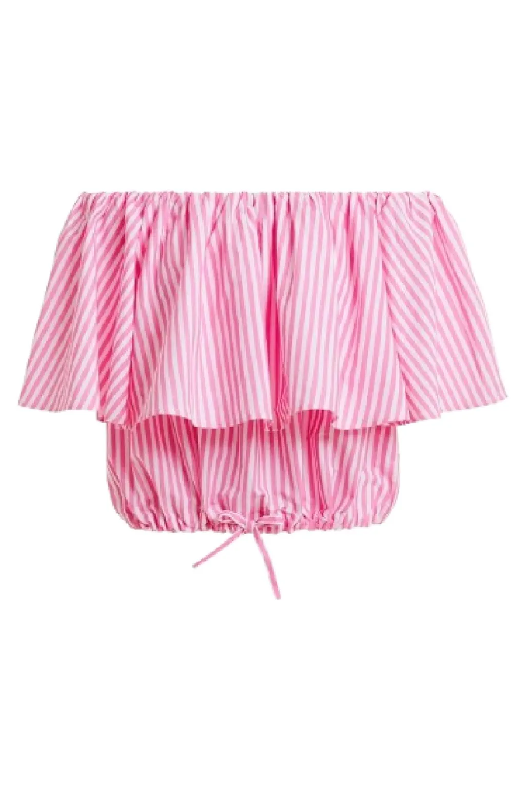 Off-shoulder top fra Essentiel Antwerp med pink og hvide striber. Toppen har flæser øverst og en løs pasform med elastik forneden.
