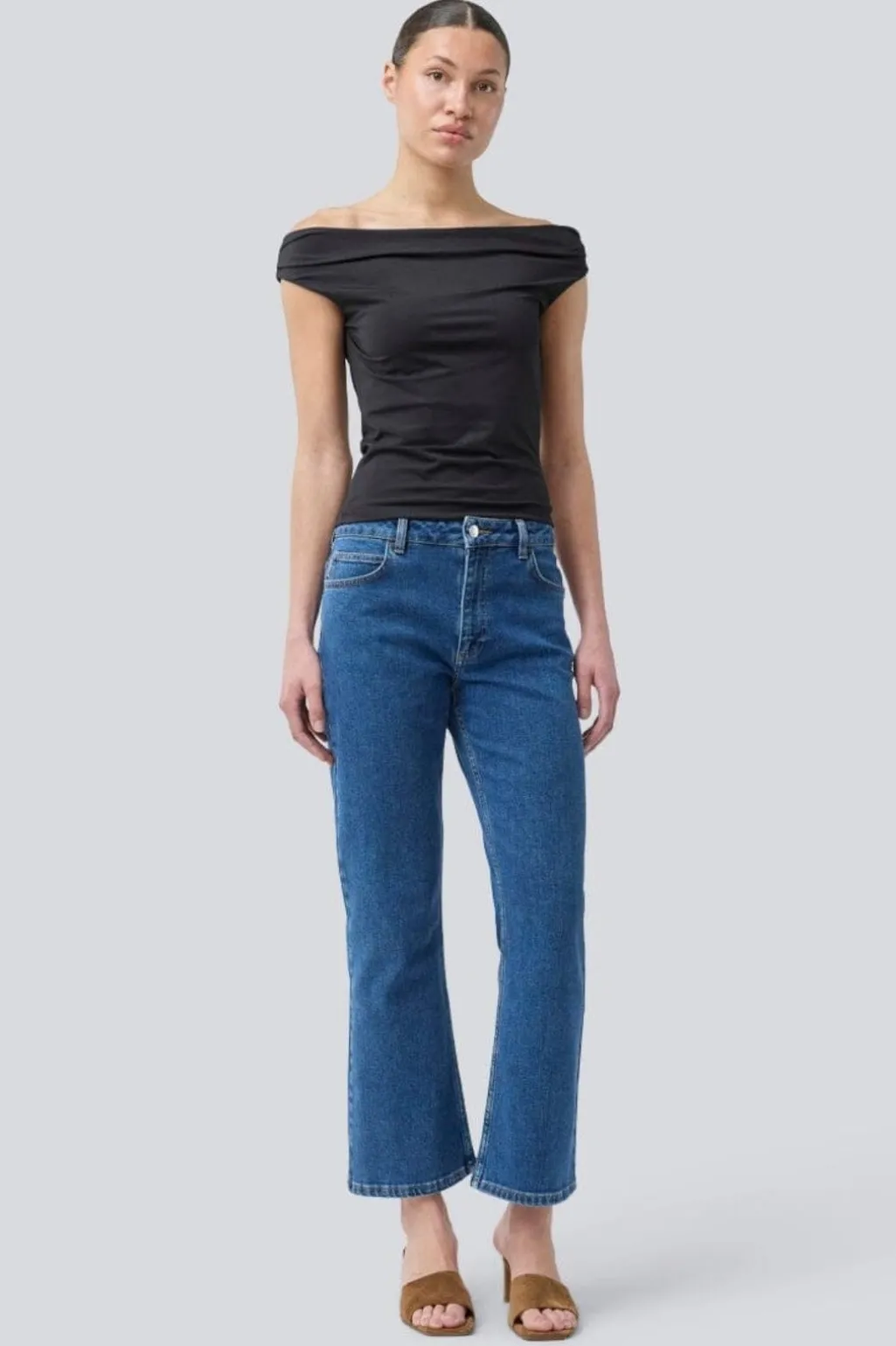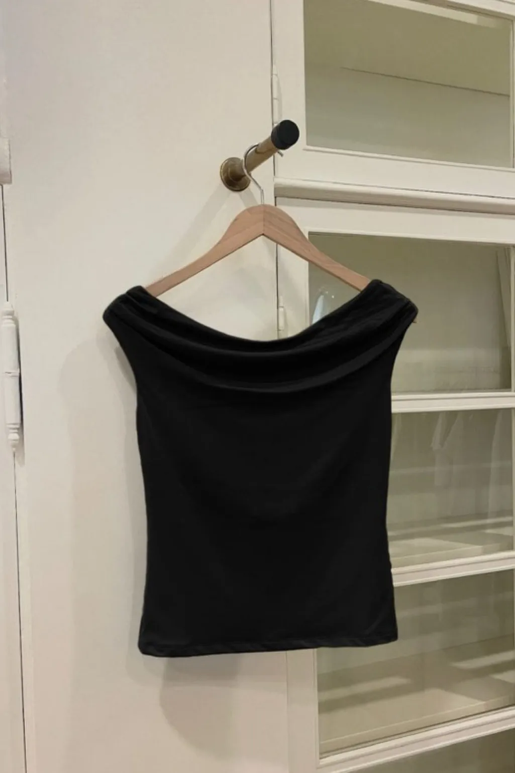 Sort off-shoulder top fra Modström med tætsiddende silhuet. Toppen er fremstillet af blødt og elastisk materiale, der giver god bevægelighed.