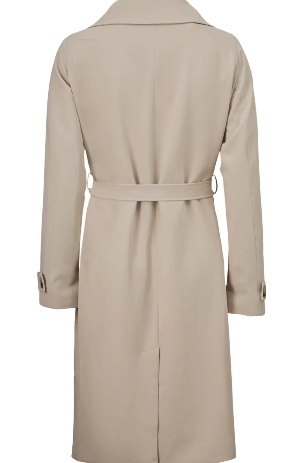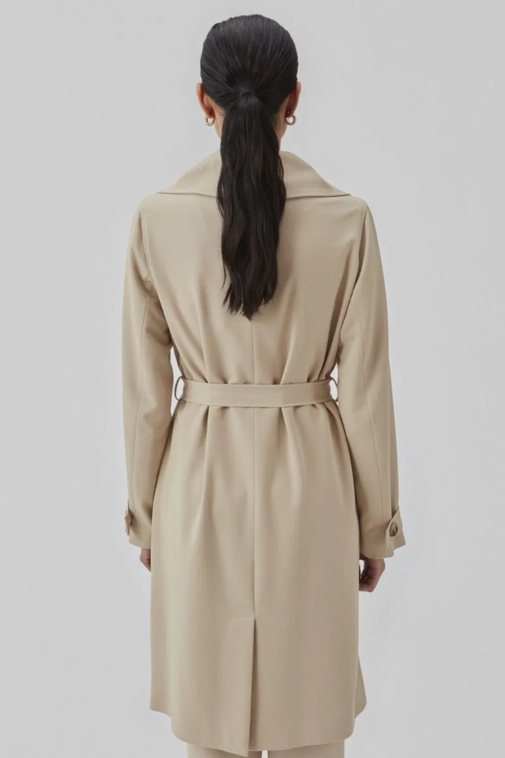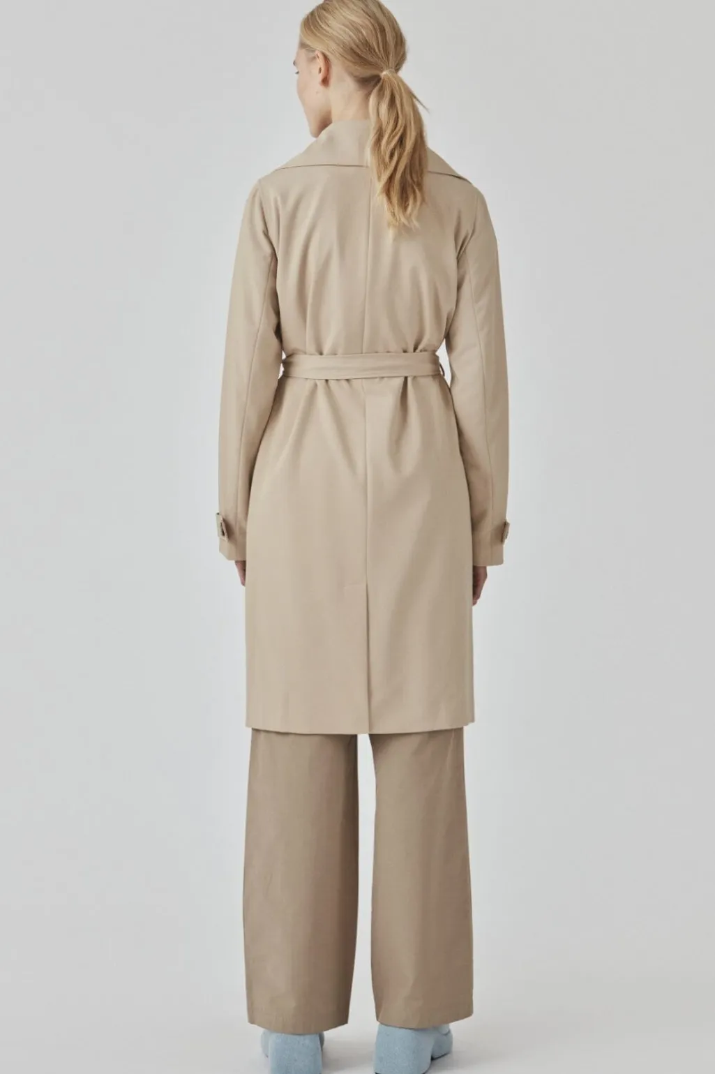 Beige jakke fra Modström med løs pasform. Den har en bred krave og dobbeltknaplukning foran. Et bælte i taljen giver mulighed for at tilpasse jakkens form.