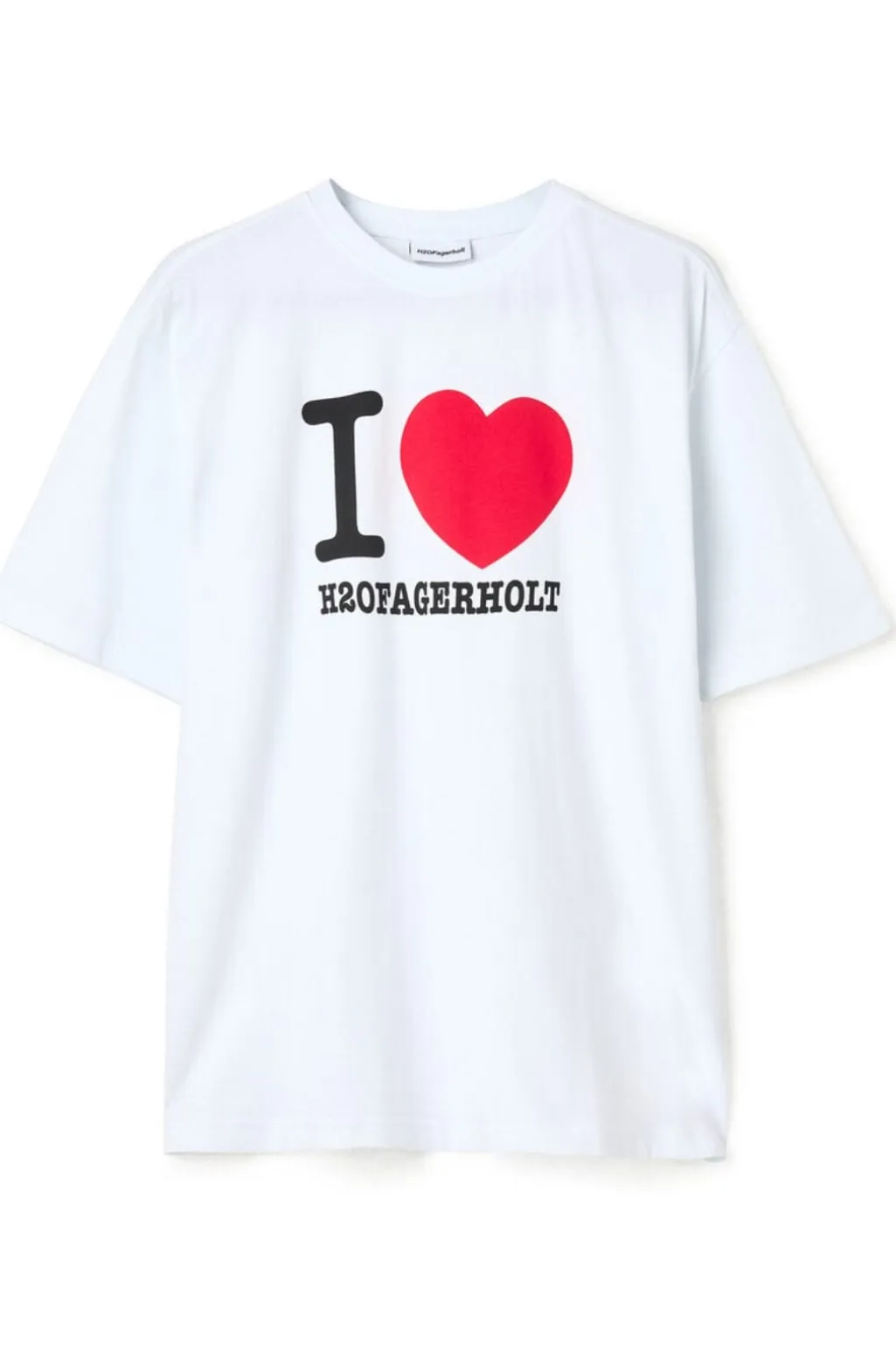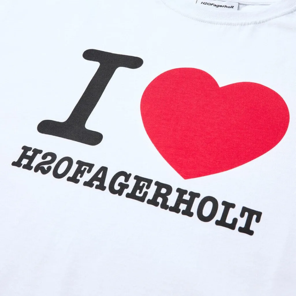Hvid t-shirt fra H2O Fagerholt med et stort print på fronten. T-shirten har en oversized pasform og korte ærmer. Det grafiske design består af teksten I ♥ H2O FAGERHOLT i sort og rød.