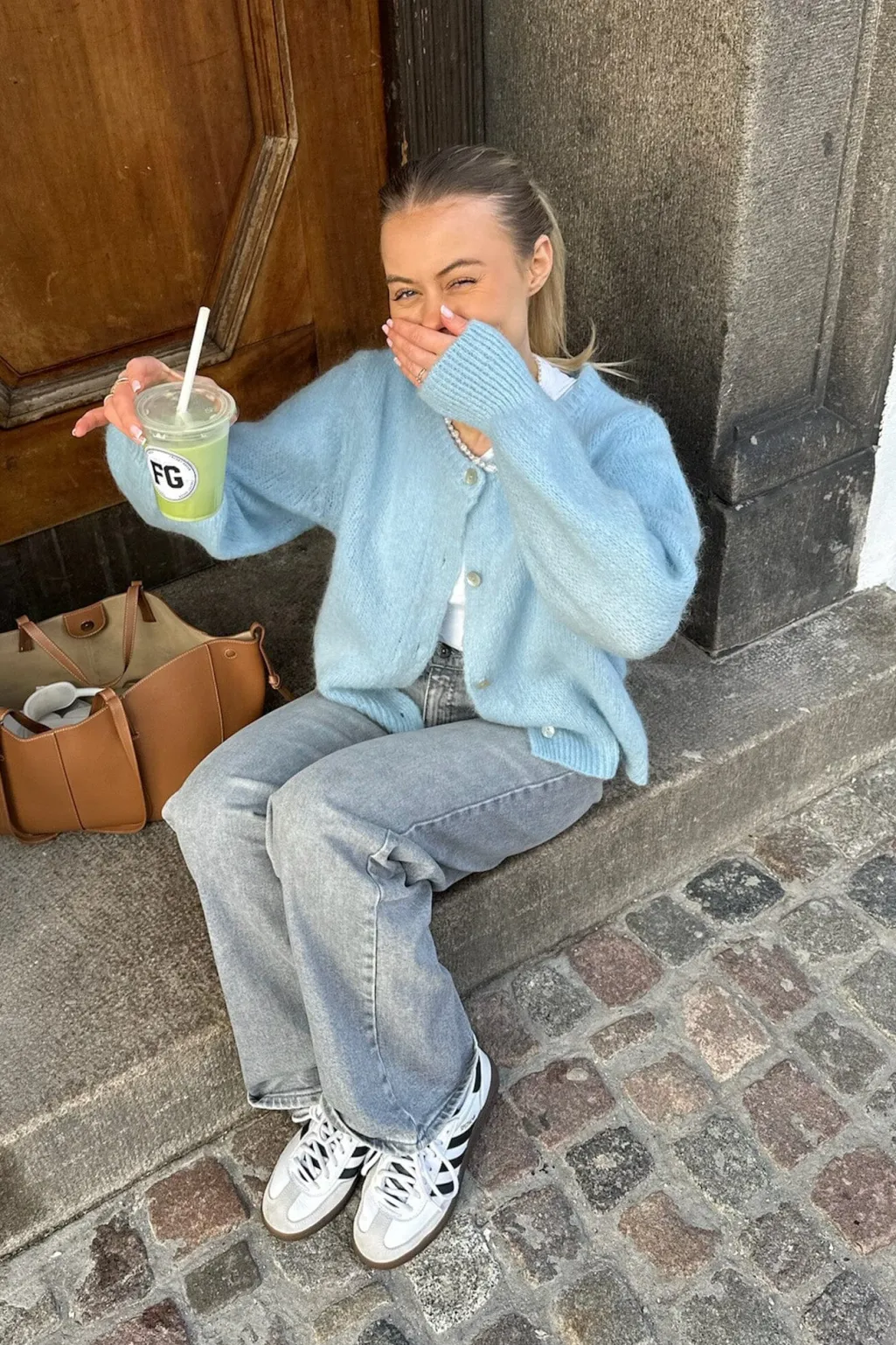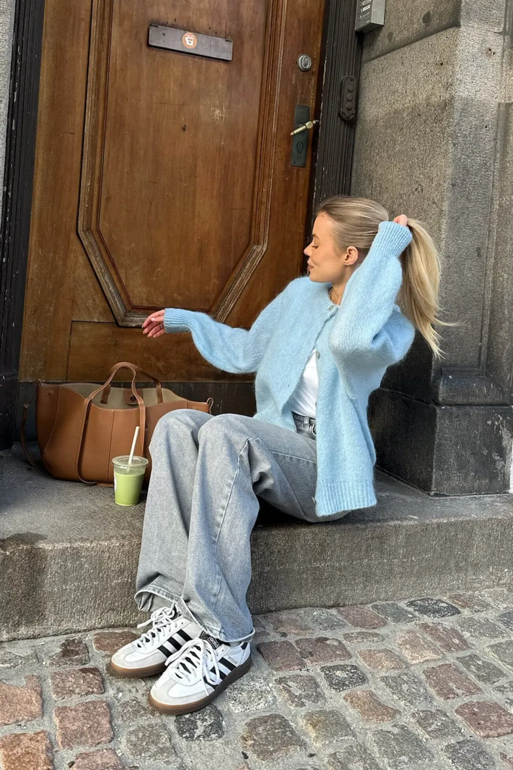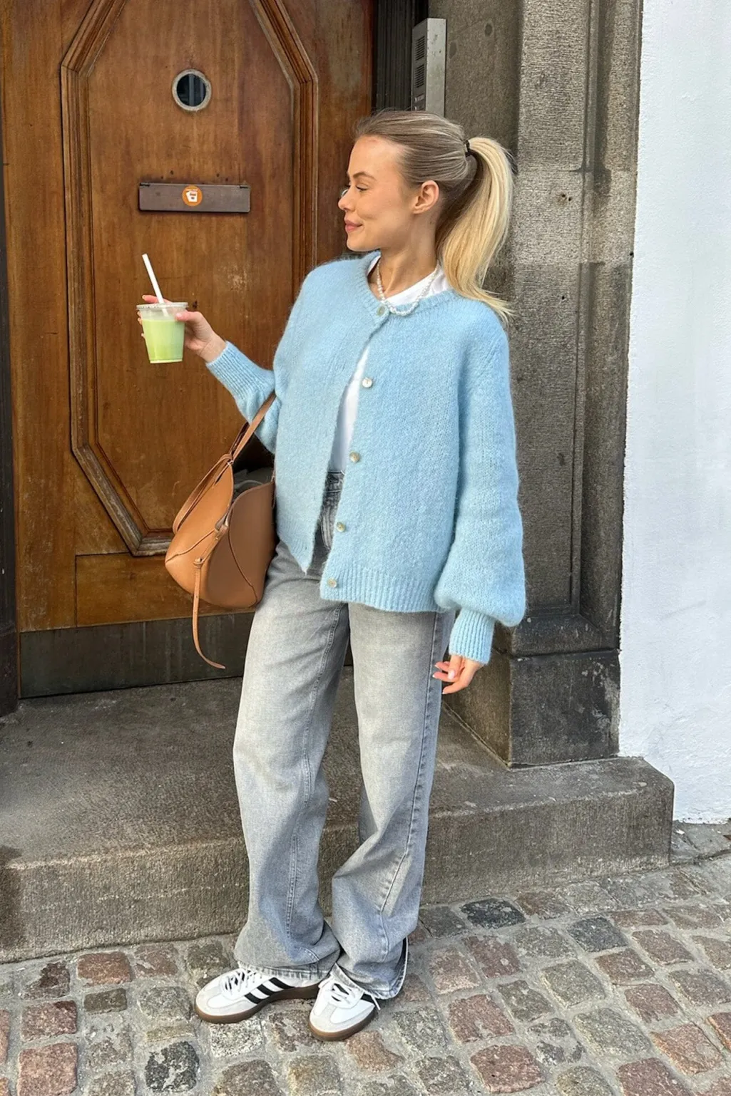 Lys blå cardigan fra BYIC med rund hals og knaplukning. Den bløde strik har voluminøse ærmer og perlemorsknapper, der giver et stilrent udtryk.