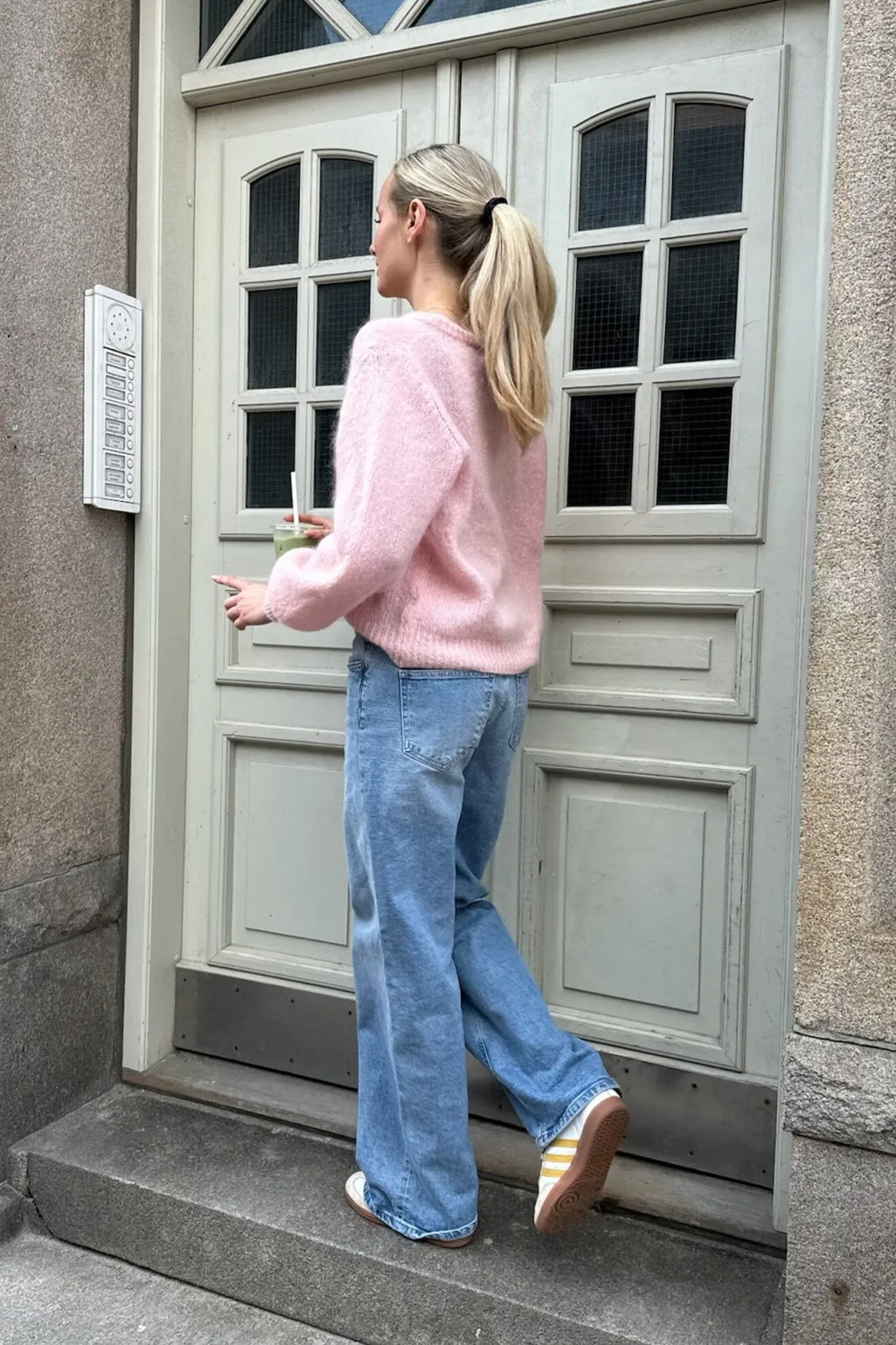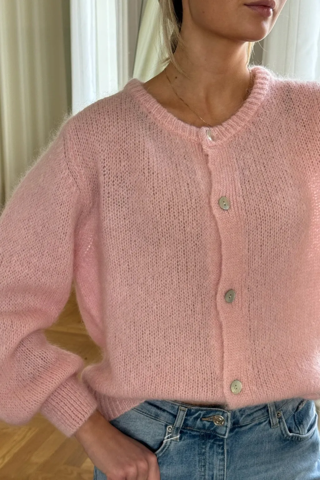 Lys pink cardigan fra BYIC med rund halsudskæring. Den bløde strik har perlemorslignende knapper og voluminøse lange ærmer med ribkant.