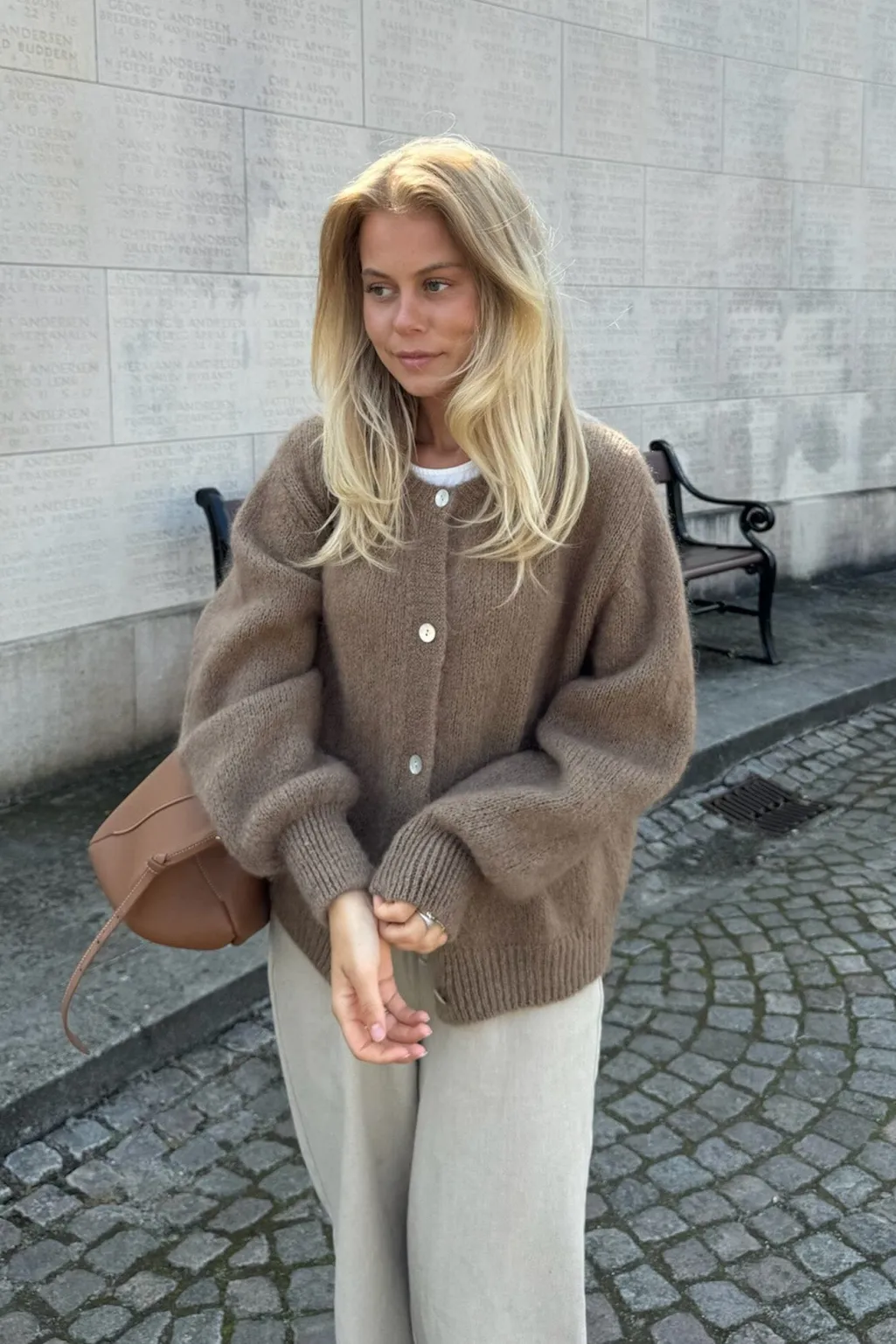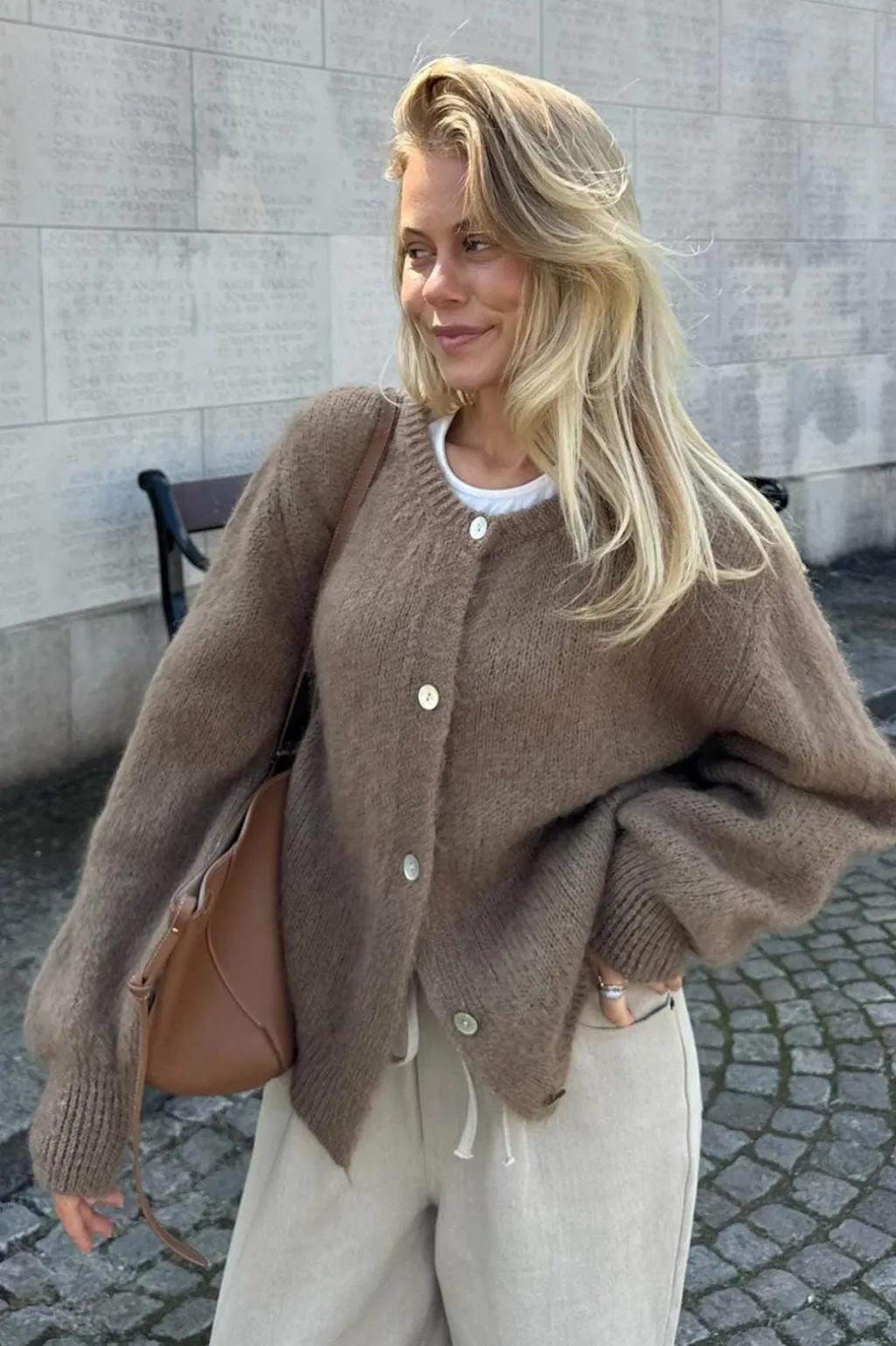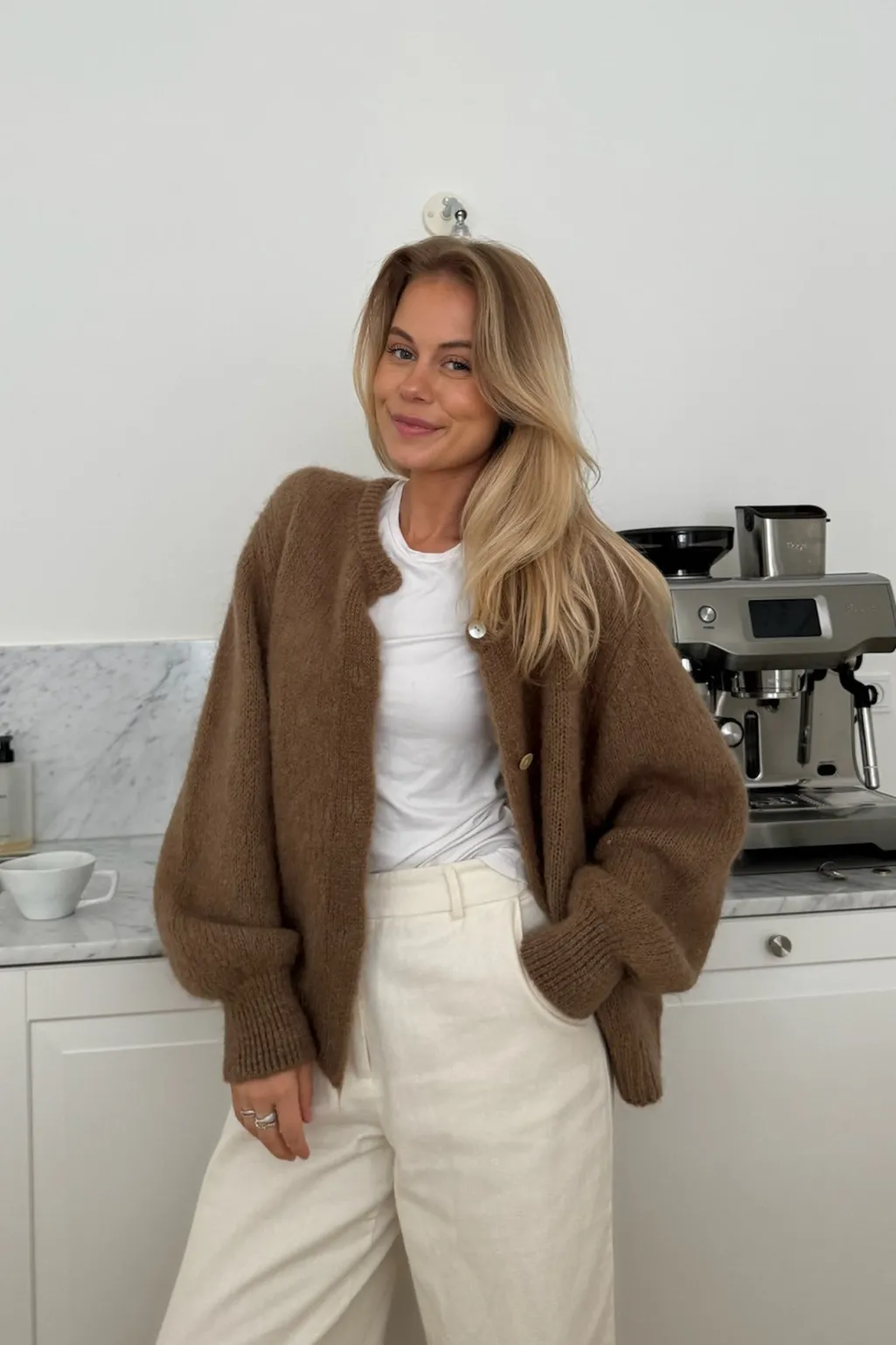 Brun cardigan fra BYIC med store knapper. Den er strikket i en blød blanding af mohair og uld, som giver en luftig og varm fornemmelse mod huden.