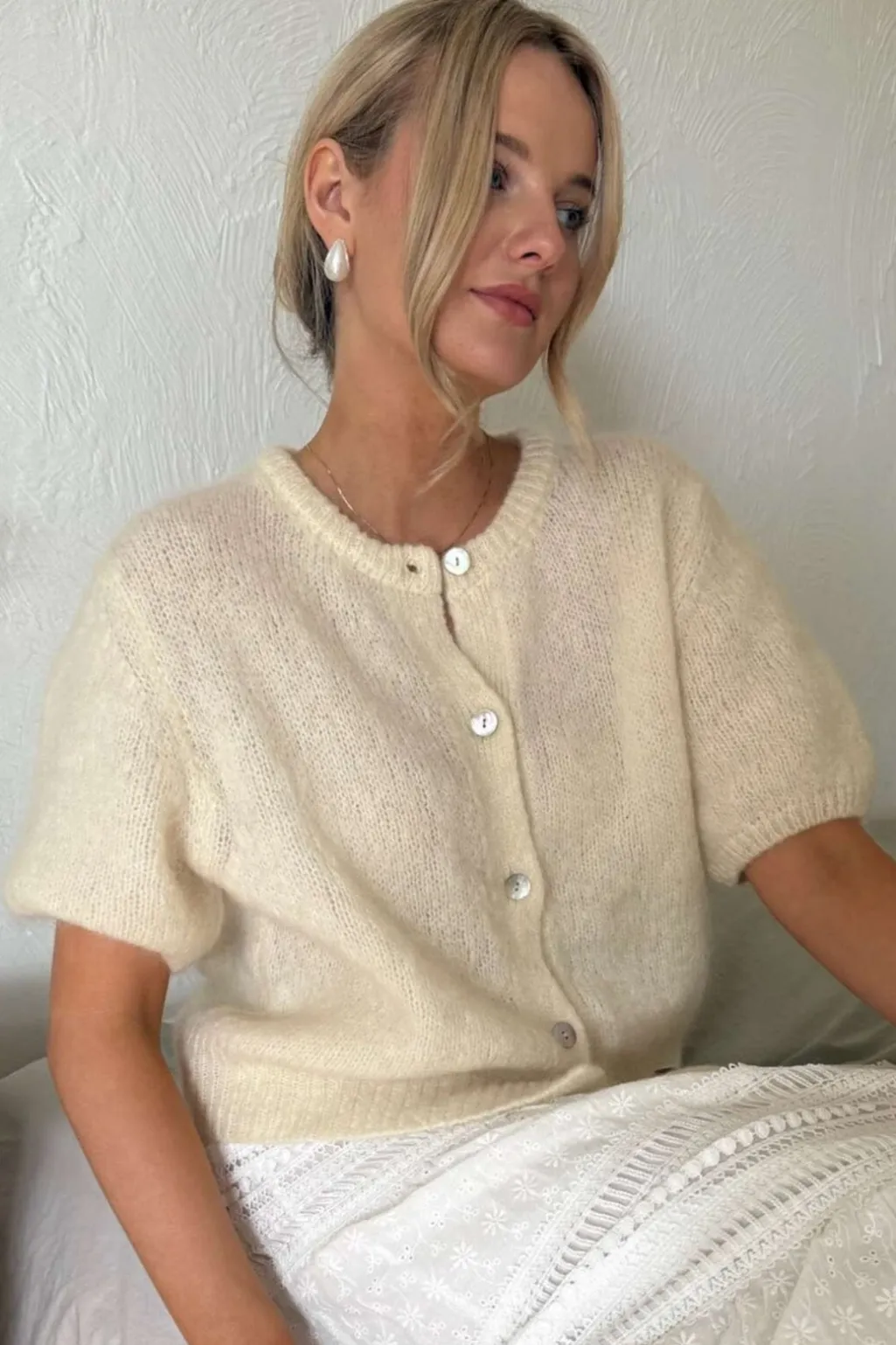 Fuzzy mohair cardigan med lange, voluminøse korte ærmer, ribdetaljer og knapper med perlemorslook. True to size.