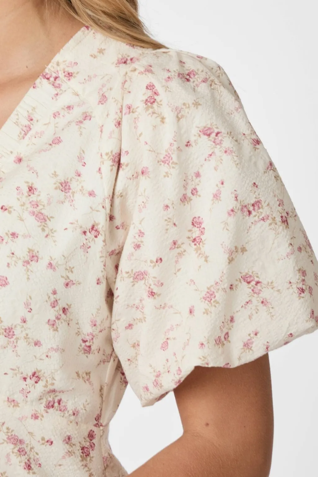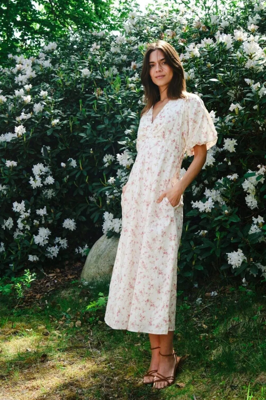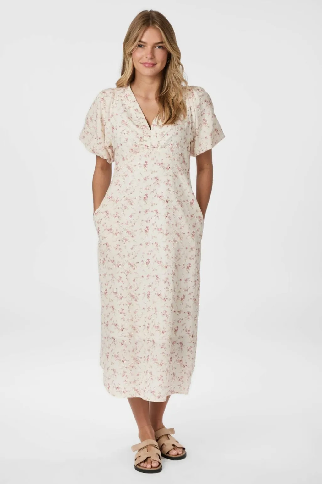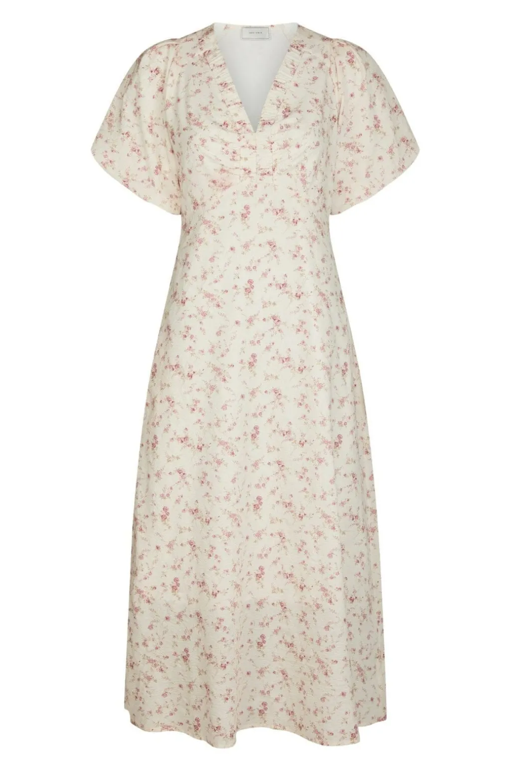Blomstret kjole fra Neo Noir i dusty rose. Den har V-halsudskæring, korte pufærmer og sidelommer. Kjolen går til midt på læggen og har et let og luftigt snit.