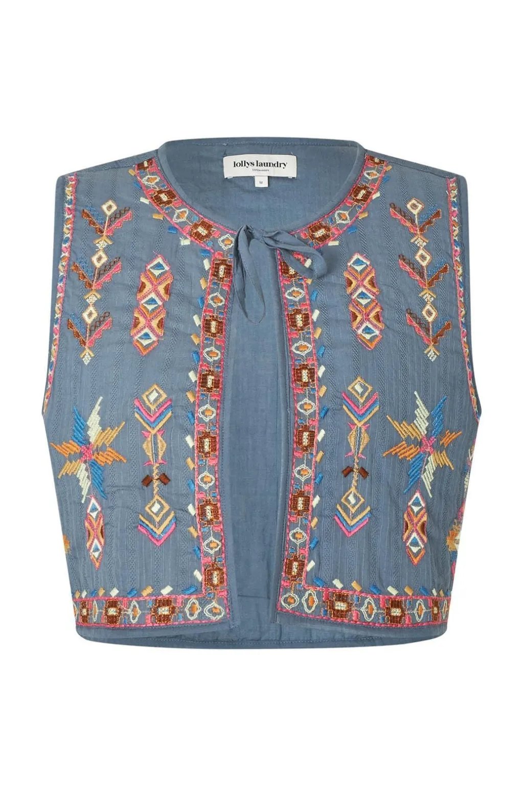 Støvet blå vest fra Lollys Laundry med farverigt broderi. Vesten har en rund hals med bindebånd og er fremstillet i bomuld med detaljerede mønstre langs kanterne.