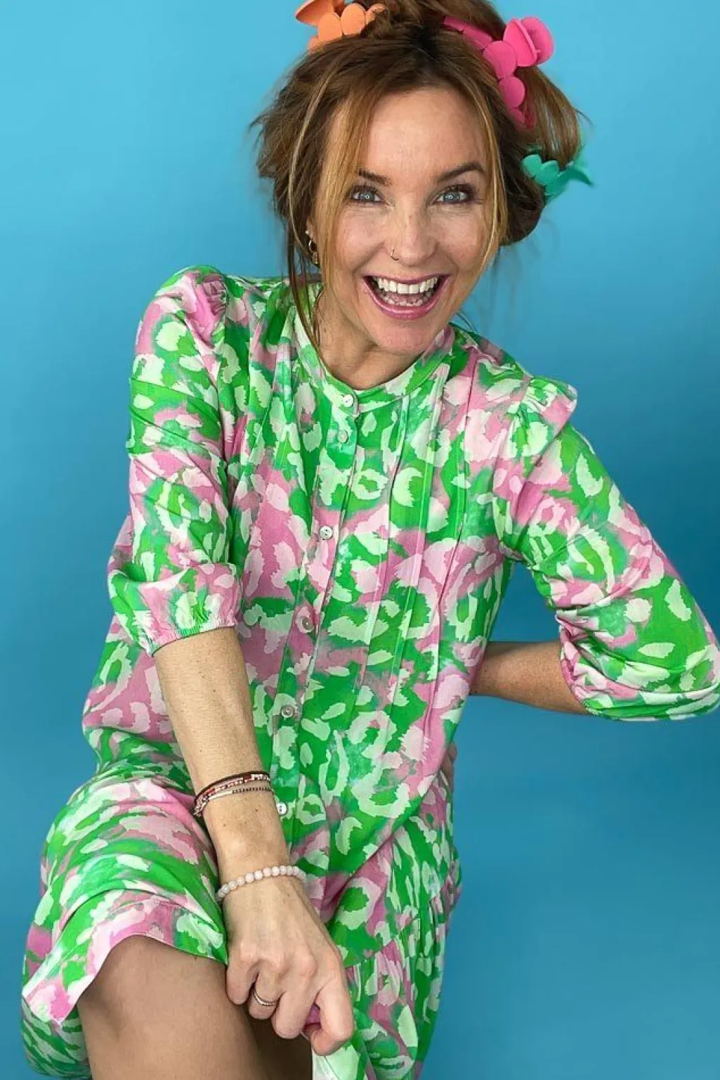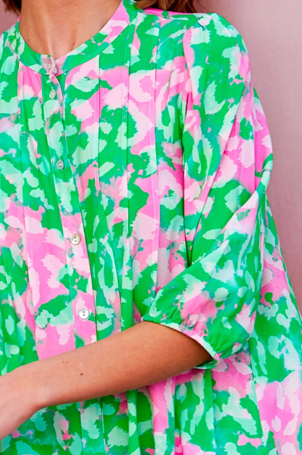 Skjortekjole fra Noella i grøn og pink med et abstrakt camouflage-mønster. Kjolen har knaplukning foran og en skjortekrave med 3/4 ærmer.