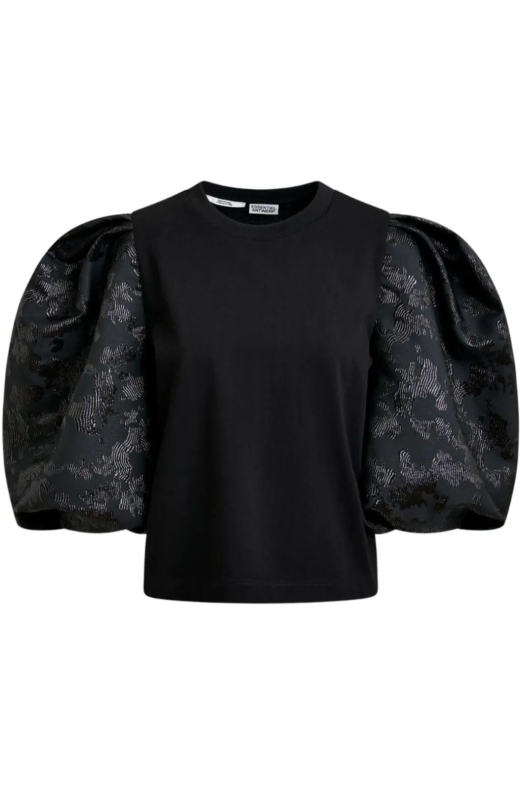 Jersey-kjole fra Essentiel Antwerp med trykt blomstermønster på sort baggrund. Kjolen er lavet af jersey-materiale med elastan.