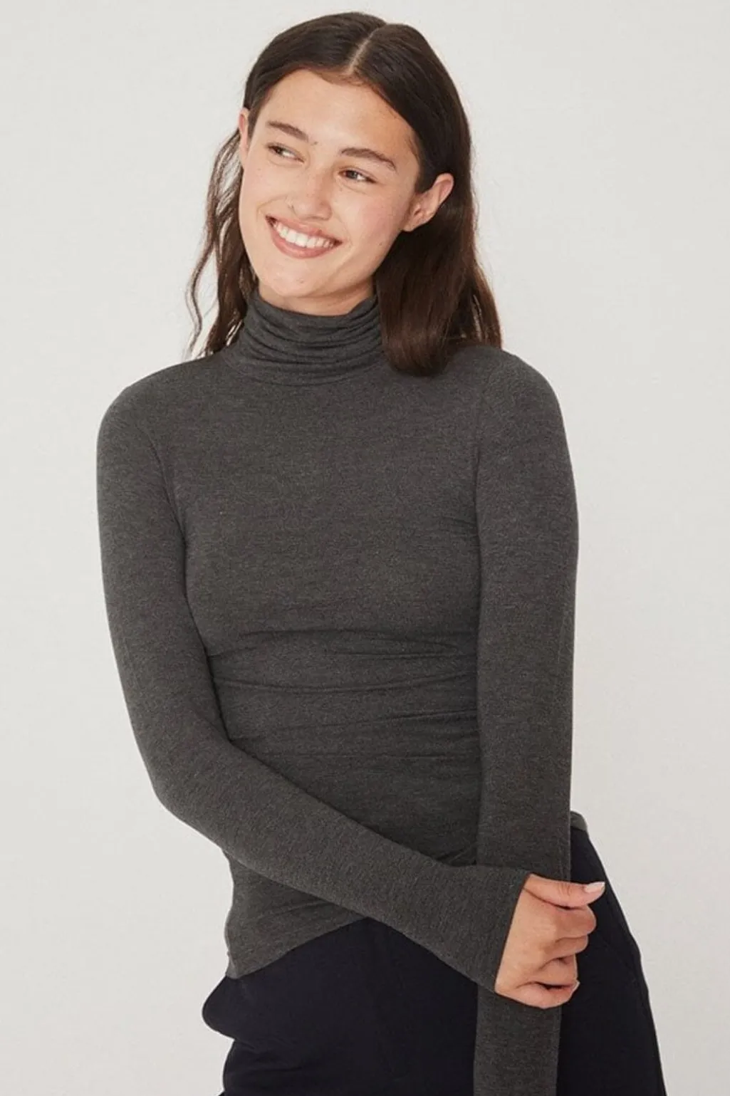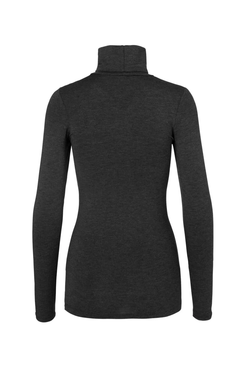 Mørkegrå rullekravebluse fra MbyM med lange ærmer. Blusen har en blød og behagelig kvalitet med en meleret overflade, der giver dybde til materialet.