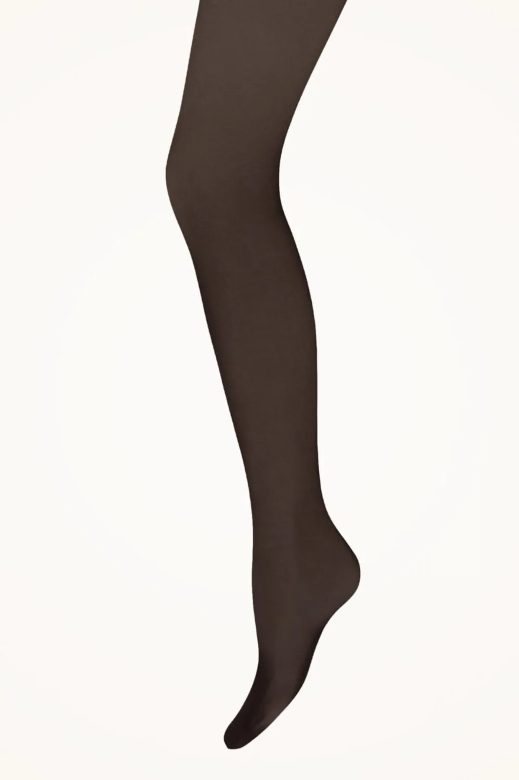 Sorte strømpebukser fra Wolford med strikket taljebånd og formgivende effekt. Strømpebukserne har en transparens på 10 denier og et mat udseende.