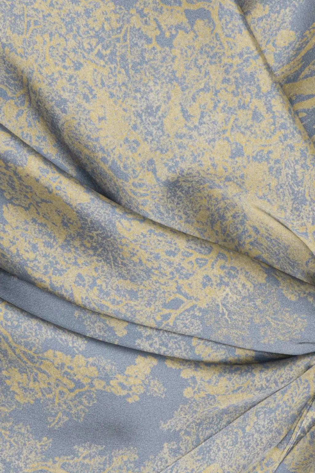 Slå-om-bluse fra Karmamia i satin med blomstermønster i lyseblå og gul. Blusen har V-hals, lange ærmer og bindedetalje i siden.