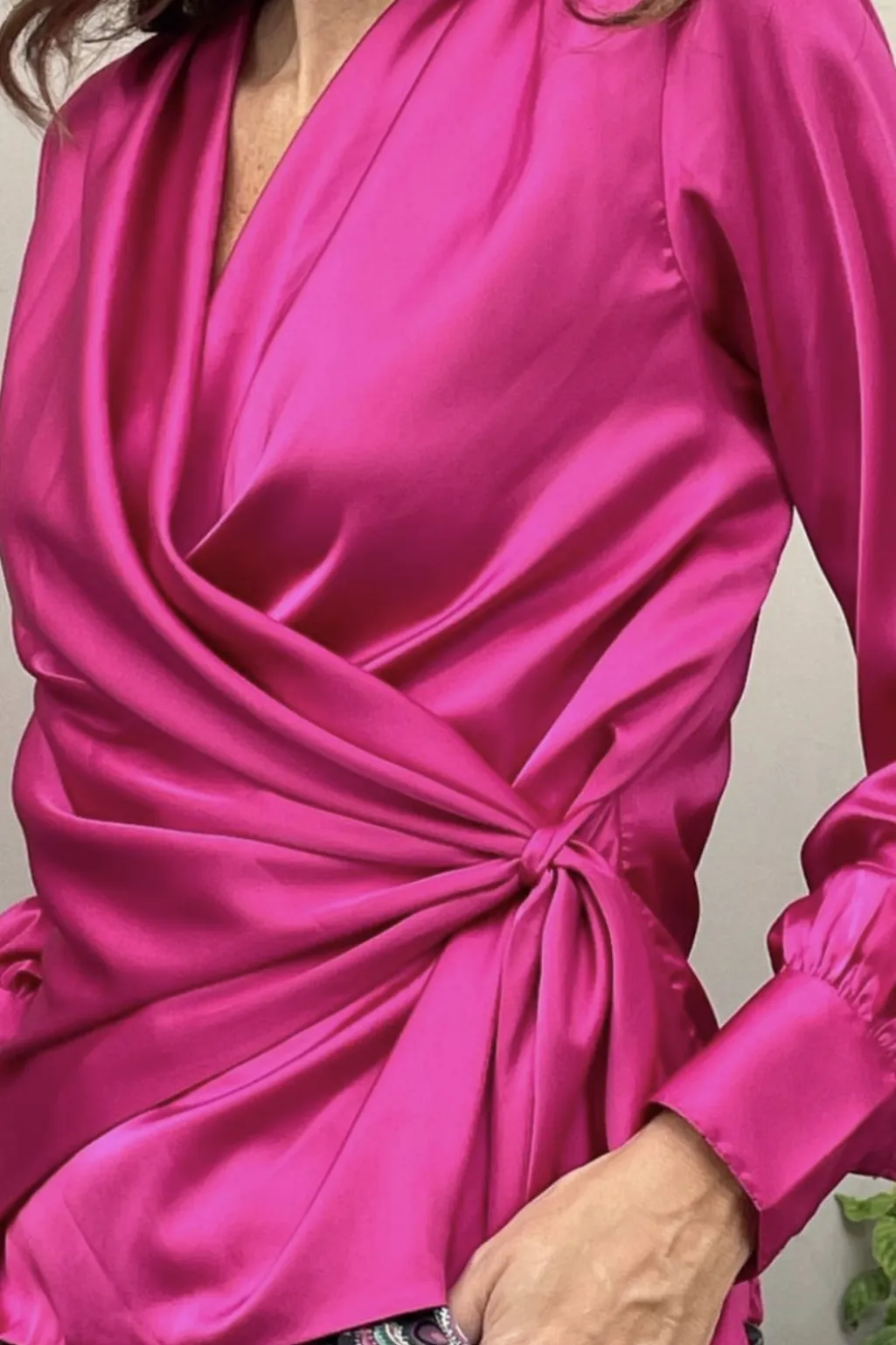 Pink bluse fra Karmamia i satin terylen med draperet front og knyttet detalje i siden. V-halsudskæring og lange ærmer giver blusen et rent og enkelt udtryk.