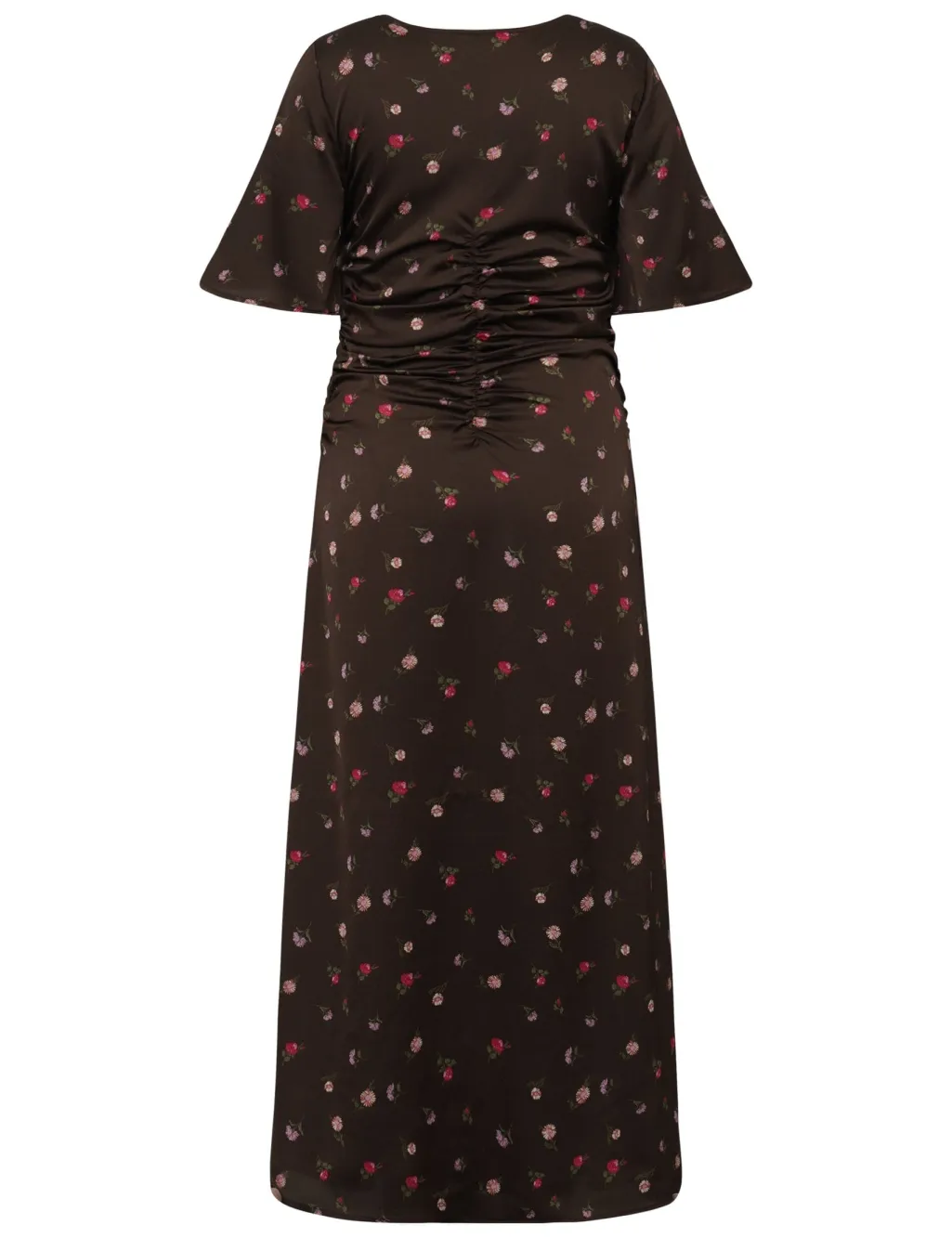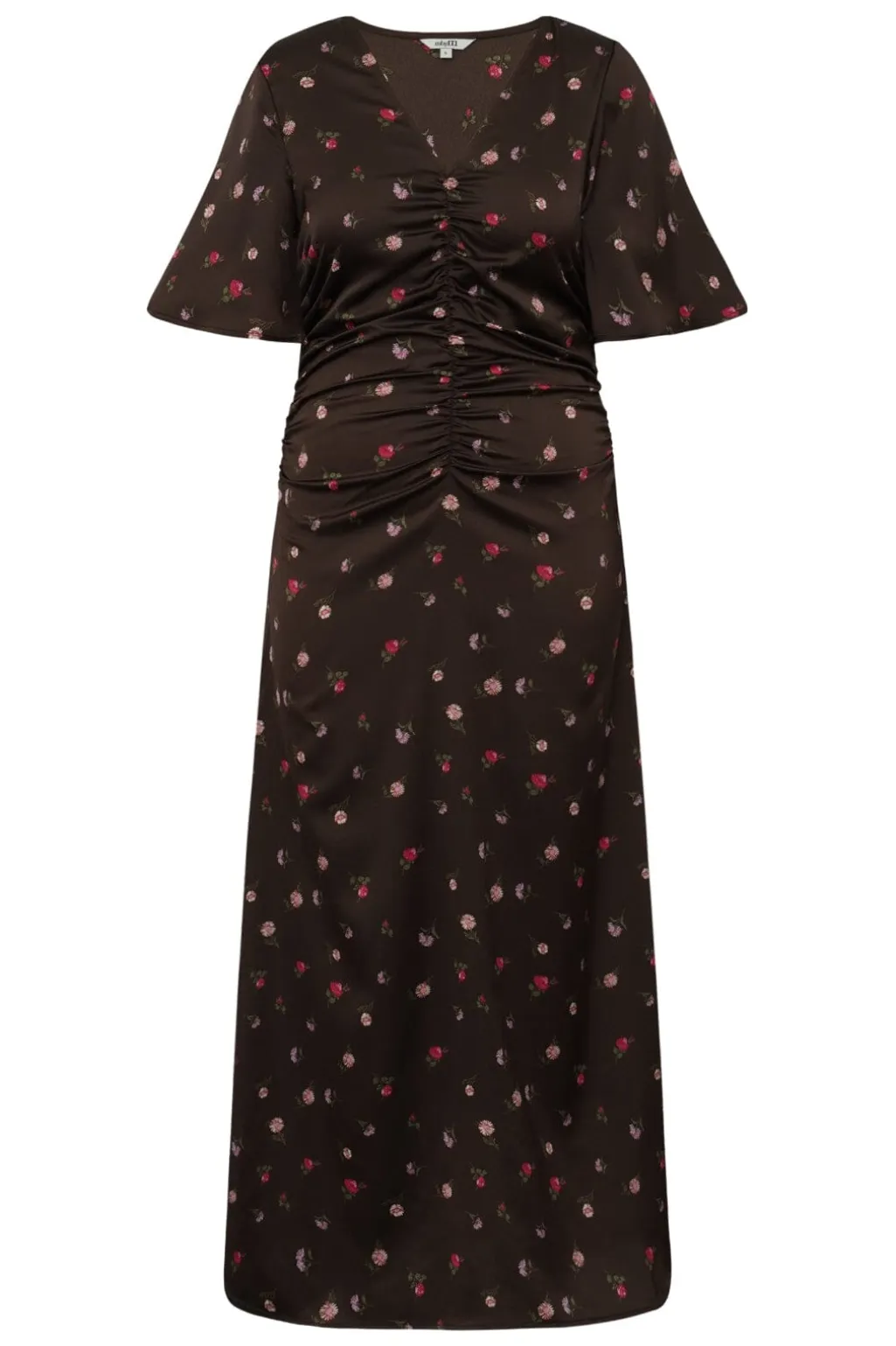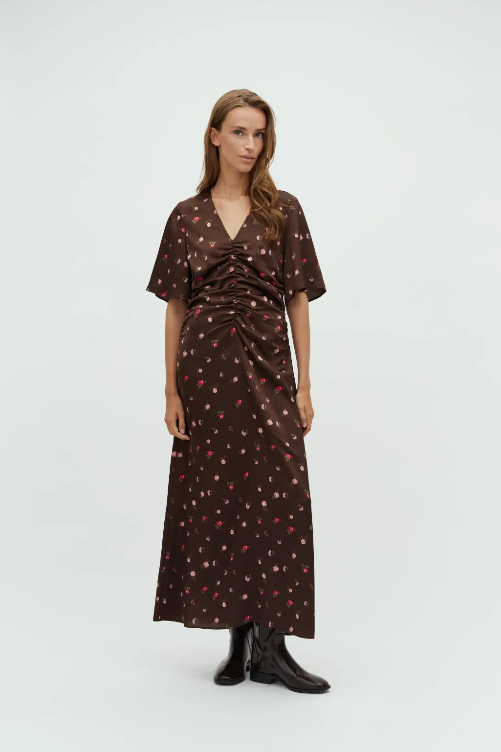 Ankellang kjole fra MbyM med blomsterprint på mørk bund. Kjolen har korte ærmer og en V-hals med rynker foran.