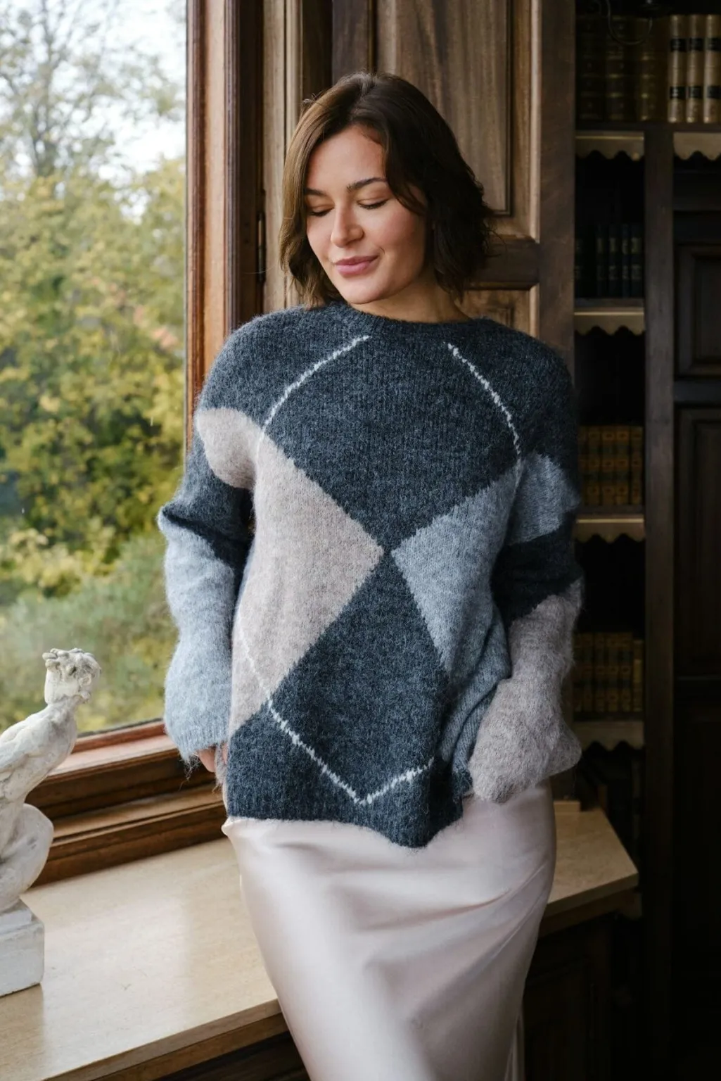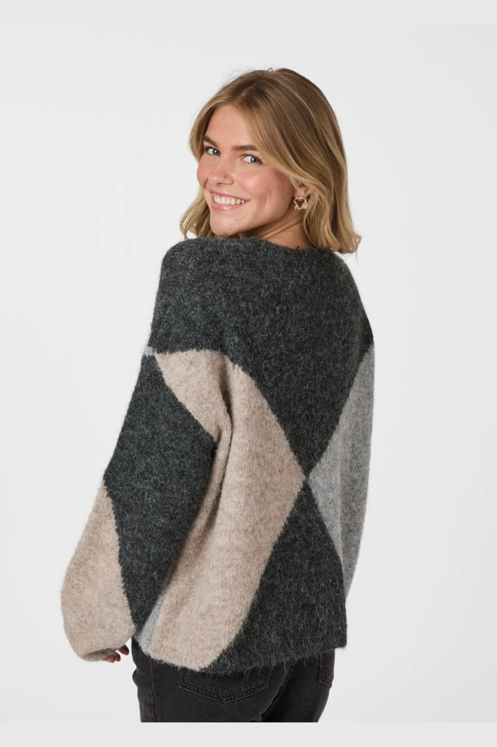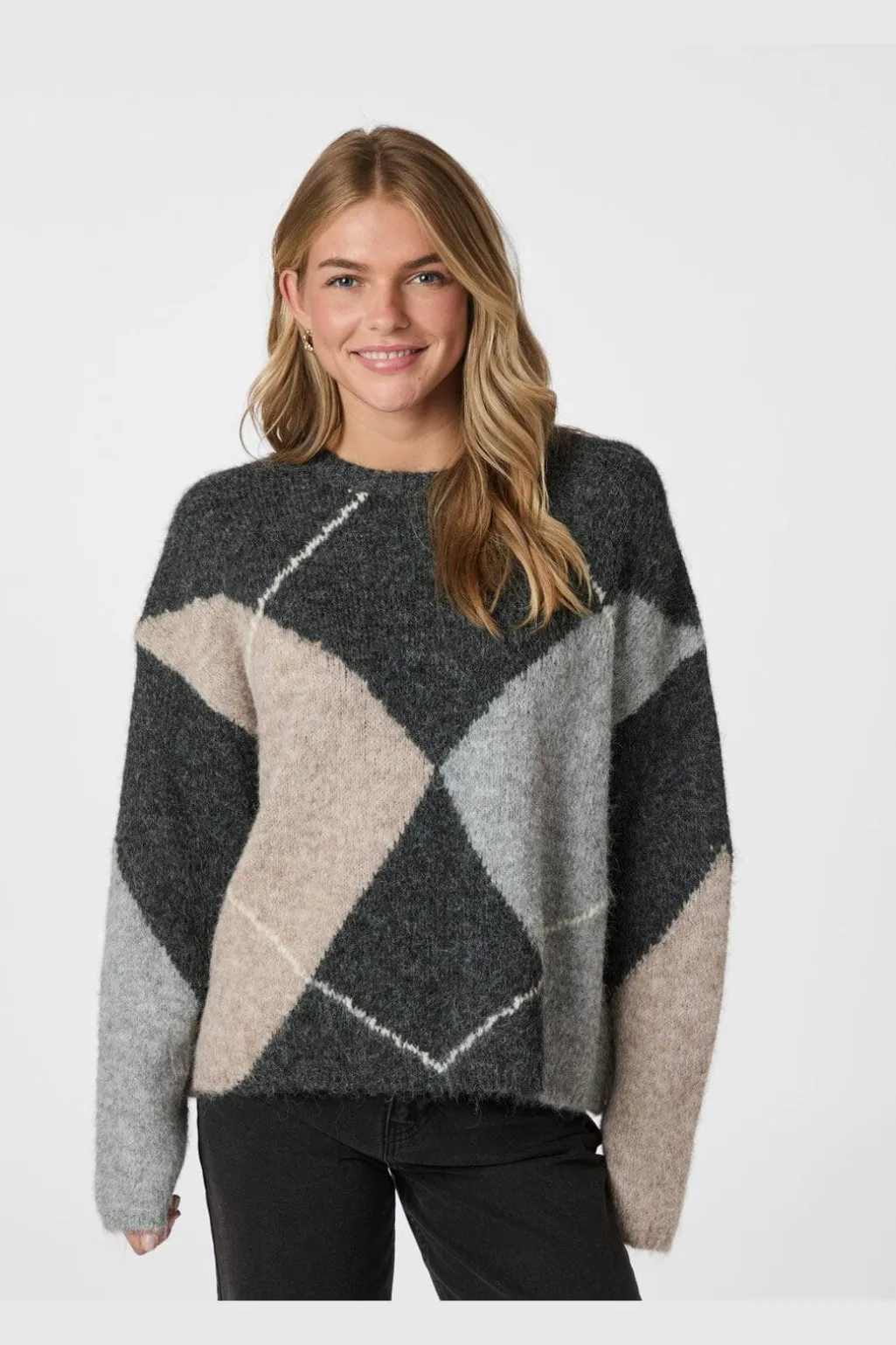 Strikbluse fra Neo Noir med et geometrisk mønster i grå, beige og sorte nuancer. Den fluffy strikbluse har en oversize pasform og rund halsudskæring.