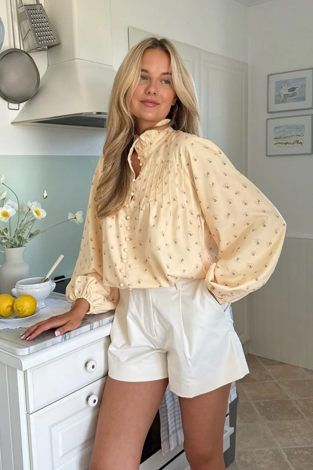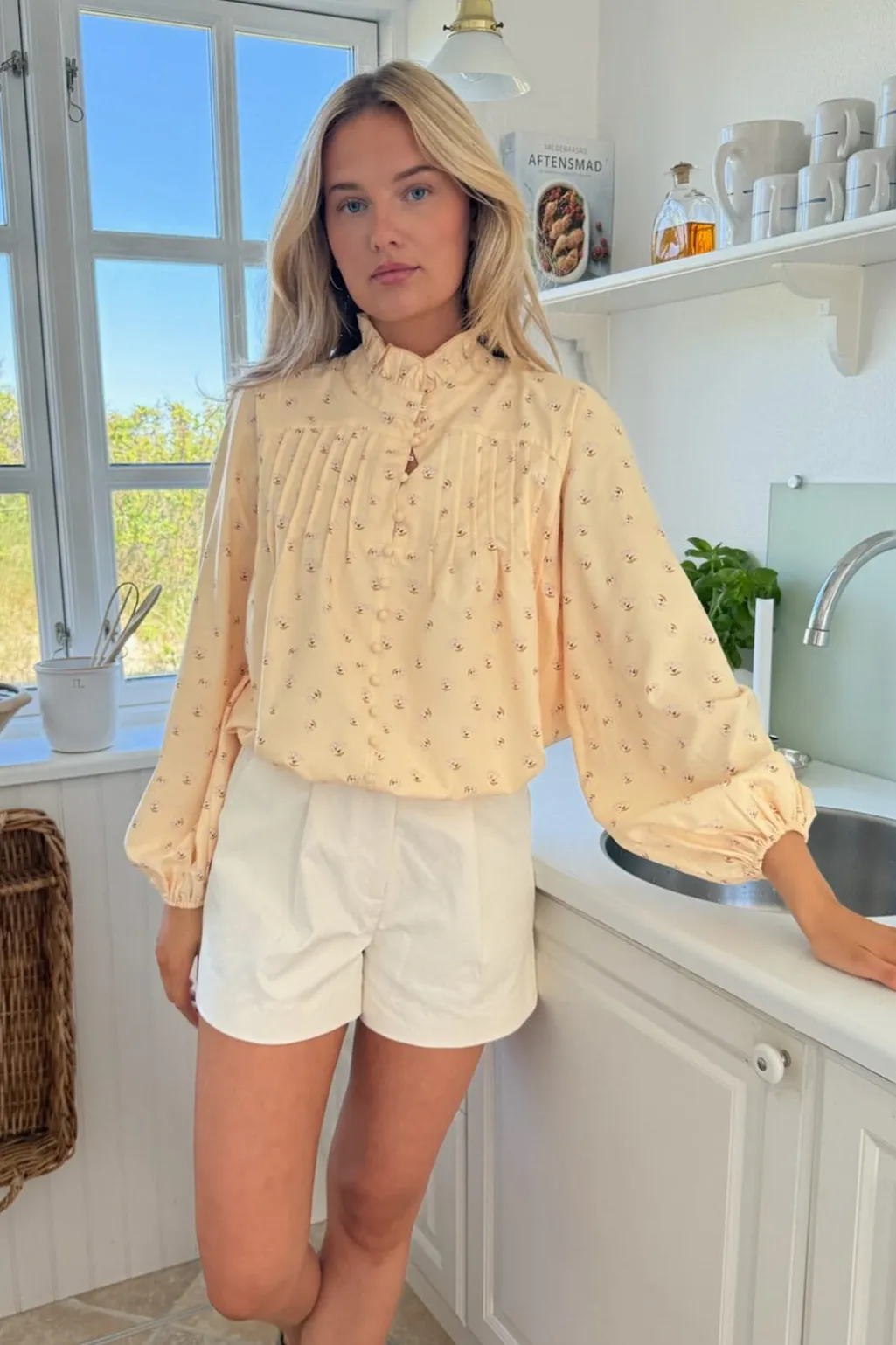 Skjorte i lysegul med blomsterprint. Skjorten har en løs pasform og store, voluminøse ærmer med elastik ved manchetterne og forneden. Den har en høj flæsekrave og plisserede detaljer over brystet. Elegante knapper løber hele vejen ned foran til lukning. True to size.