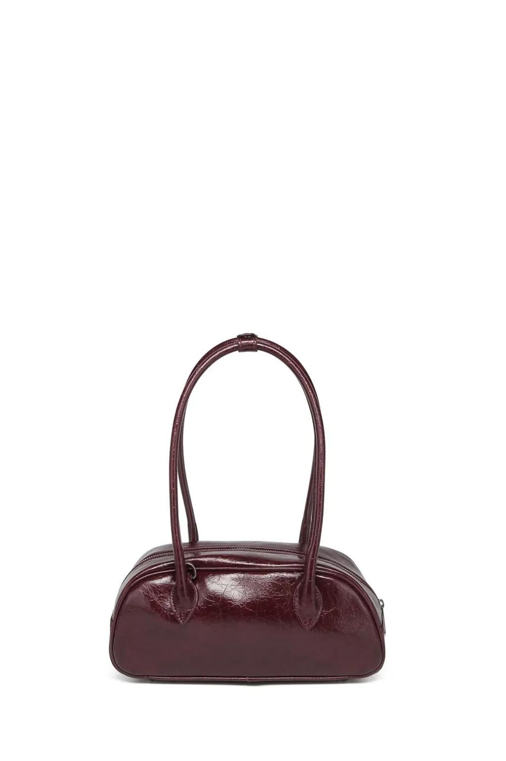 En bowlingtaske fra Noella i en mørkerød bordeauxfarve. Tasken har et distressed læderlook i 100 % polyester og to lange håndtag.