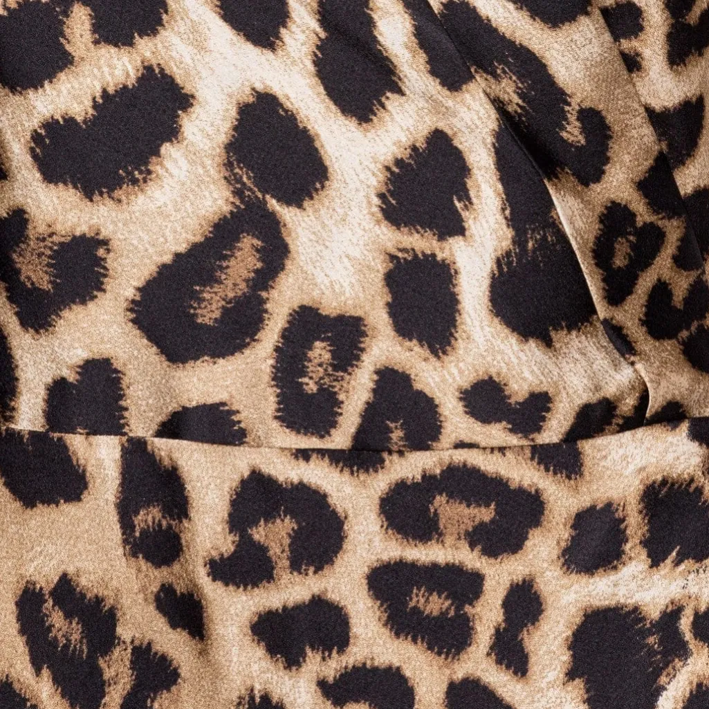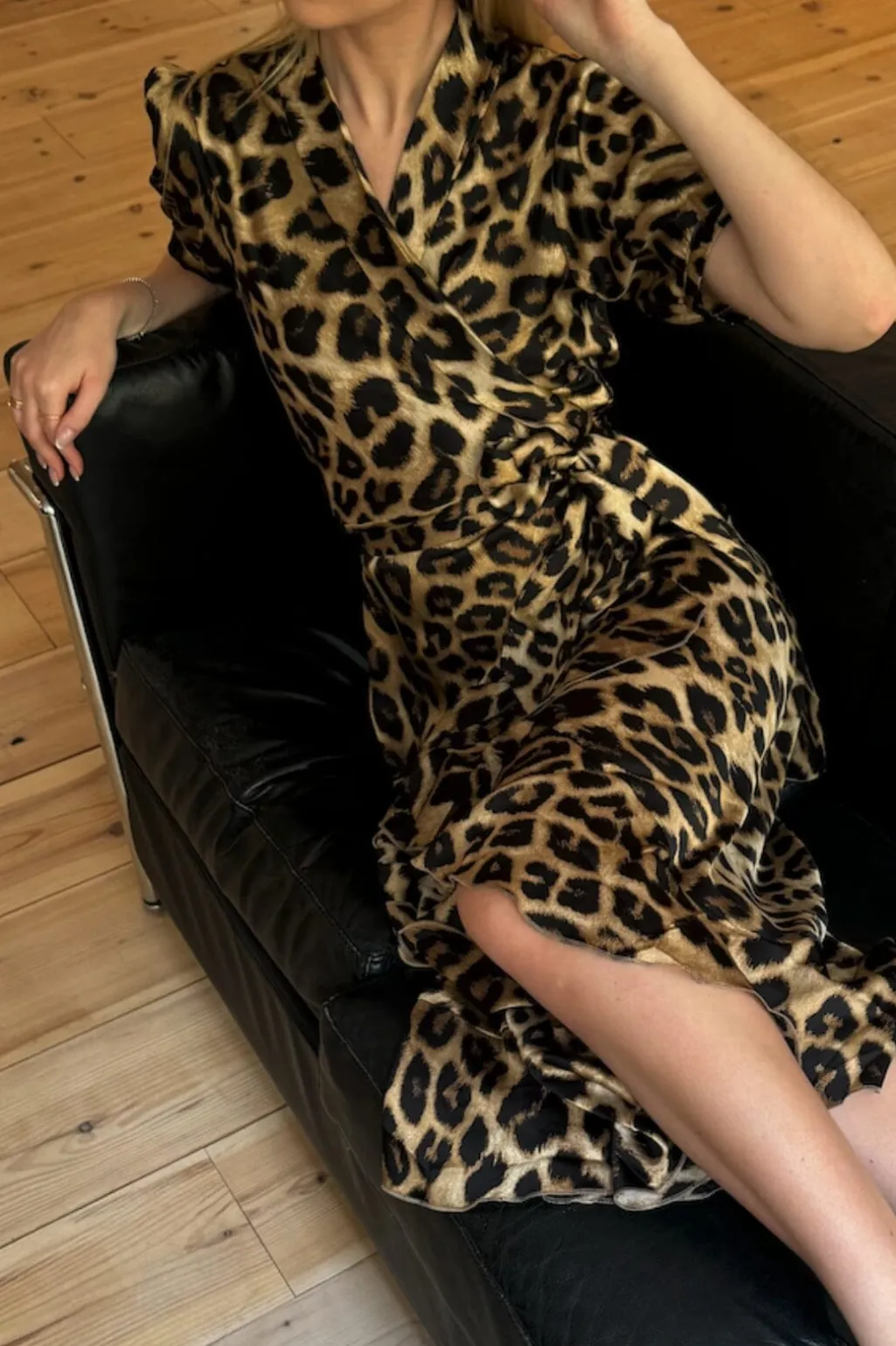Knælang kjole med leopardprint fra Karmamia. Kjolen har V-udskæring, korte ærmer og flæsedetaljer. Mønsteret har en hamret overflade, der giver printet dybde.