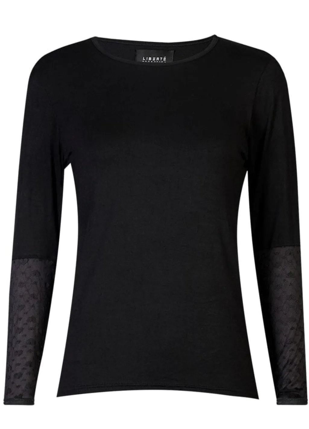 Sort bluse fra Liberte med gennemsigtige blonderærmer med hjerte-mønster. Blusen har en rund halsudskæring og en slim fit-pasform.