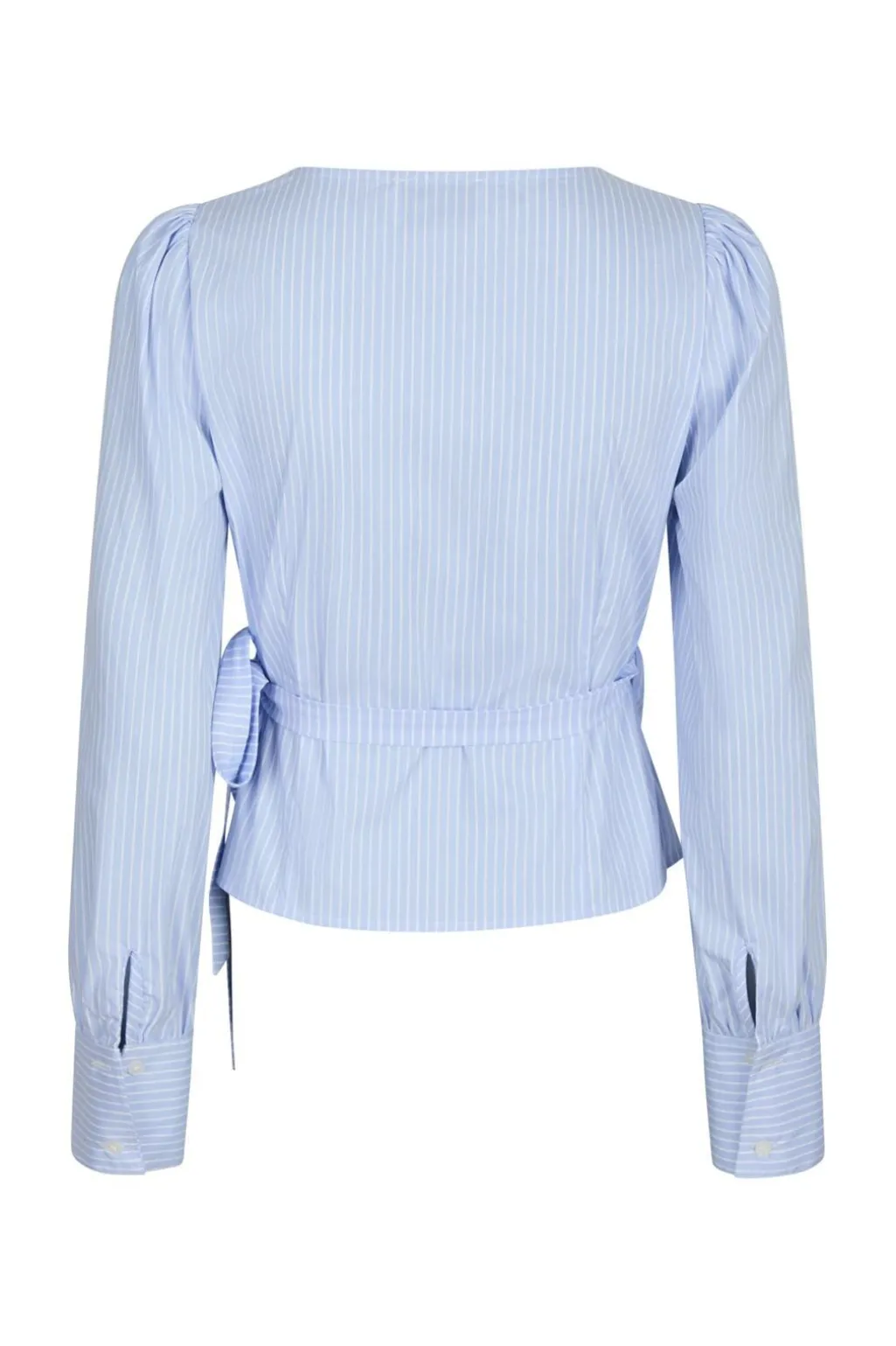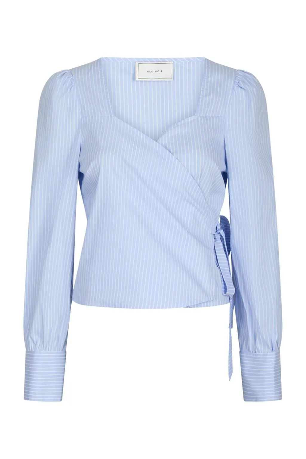 Lys blå wrap-bluse fra Neo Noir med vertikale striber. Blusen har pufærmer med manchetter og bindebånd i taljen. V-halsudskæring og et klassisk snit giver blusen et rent udtryk.