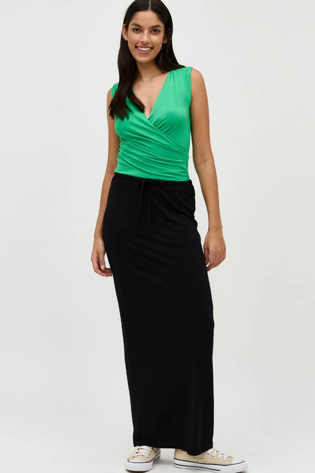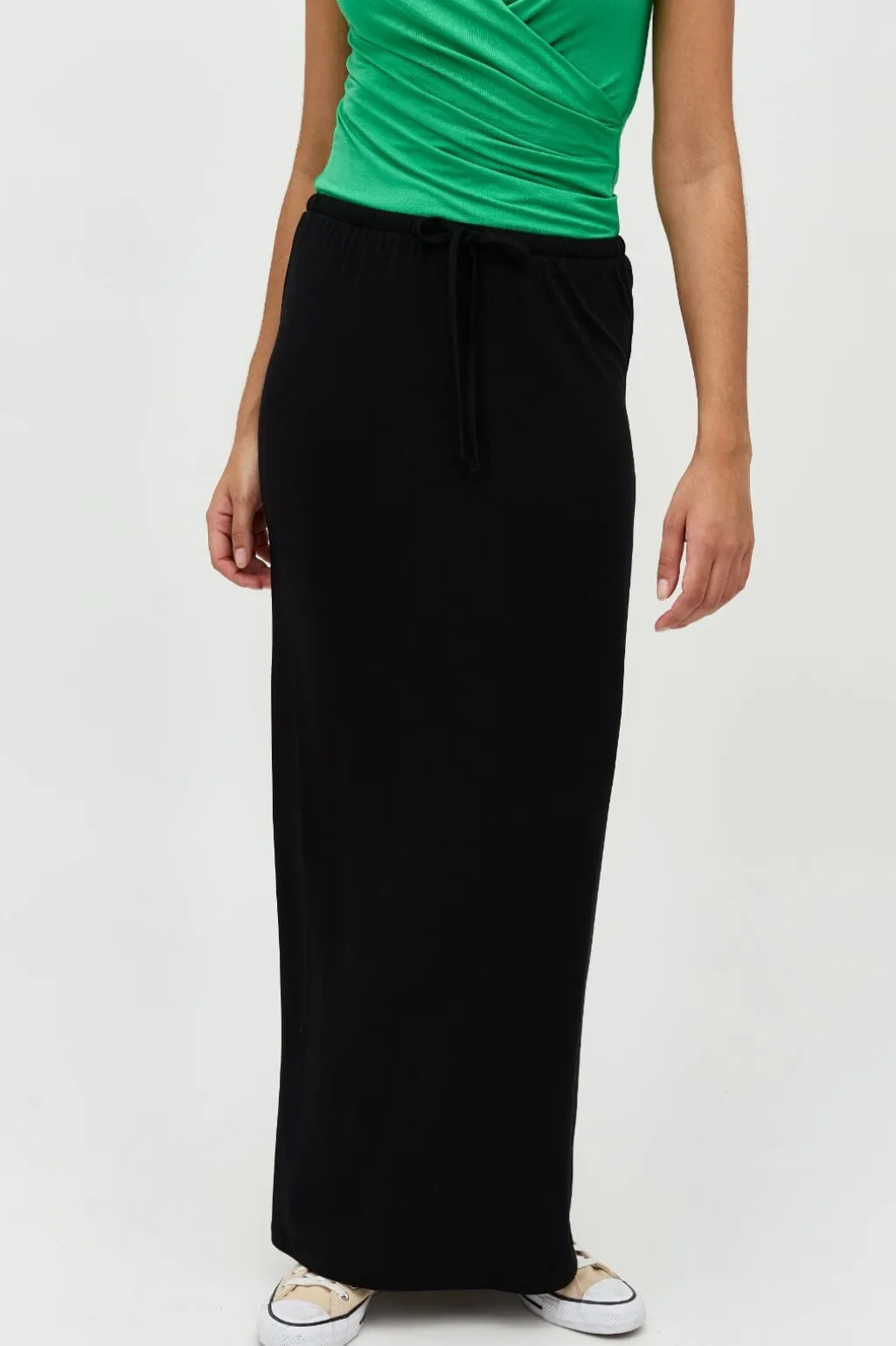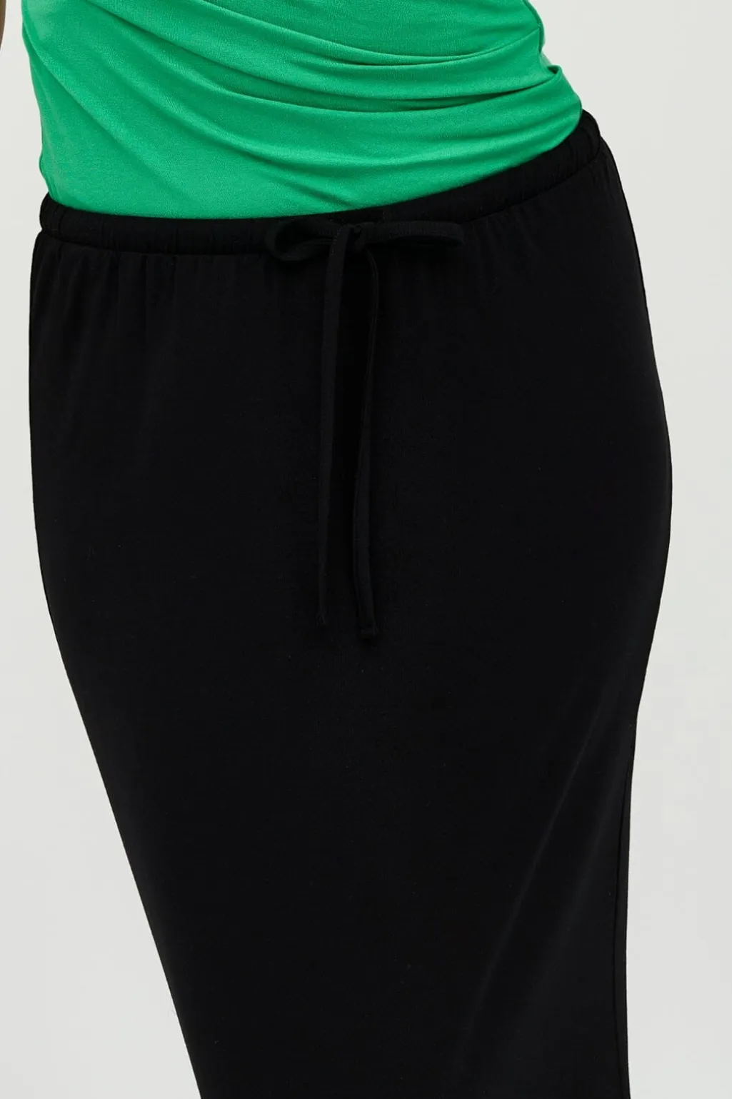 Sort nederdel fra MbyM i ankellængde med snøredetalje i taljen. Nederdelen er lavet af et blødt og åndbart materiale med god stræk.