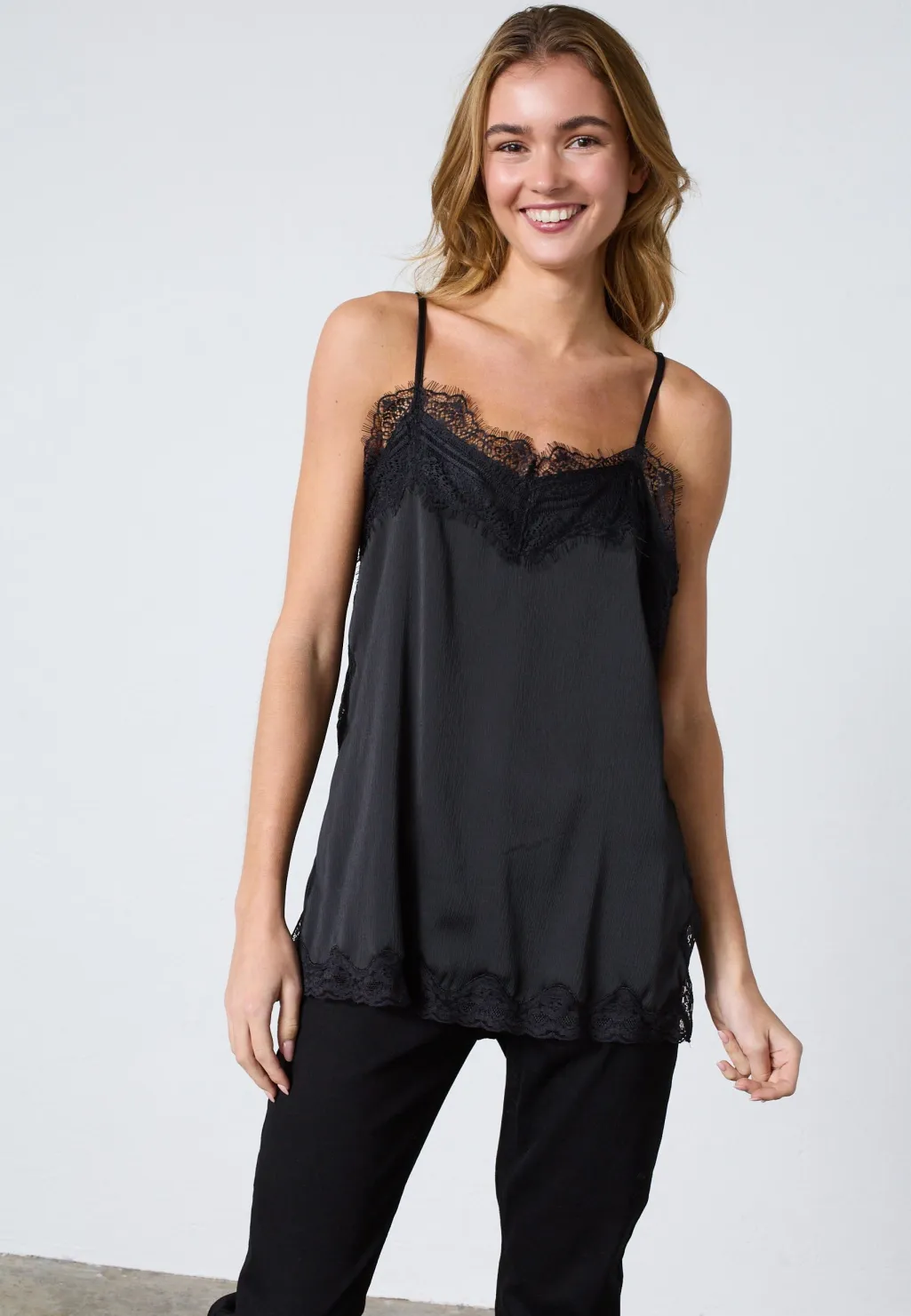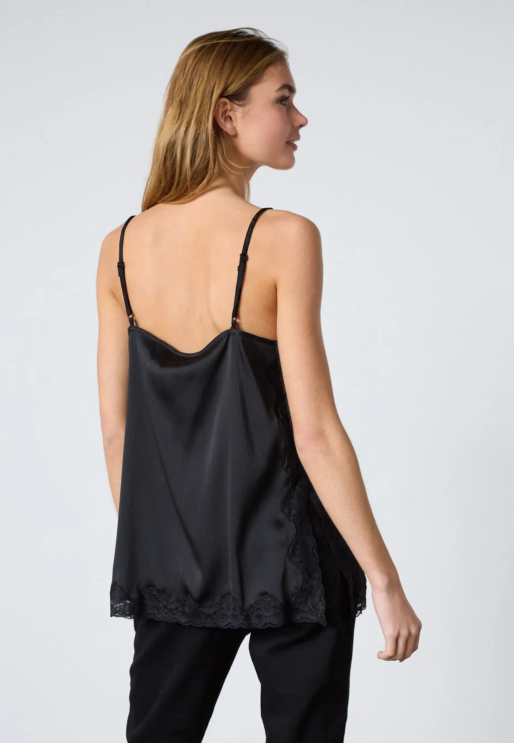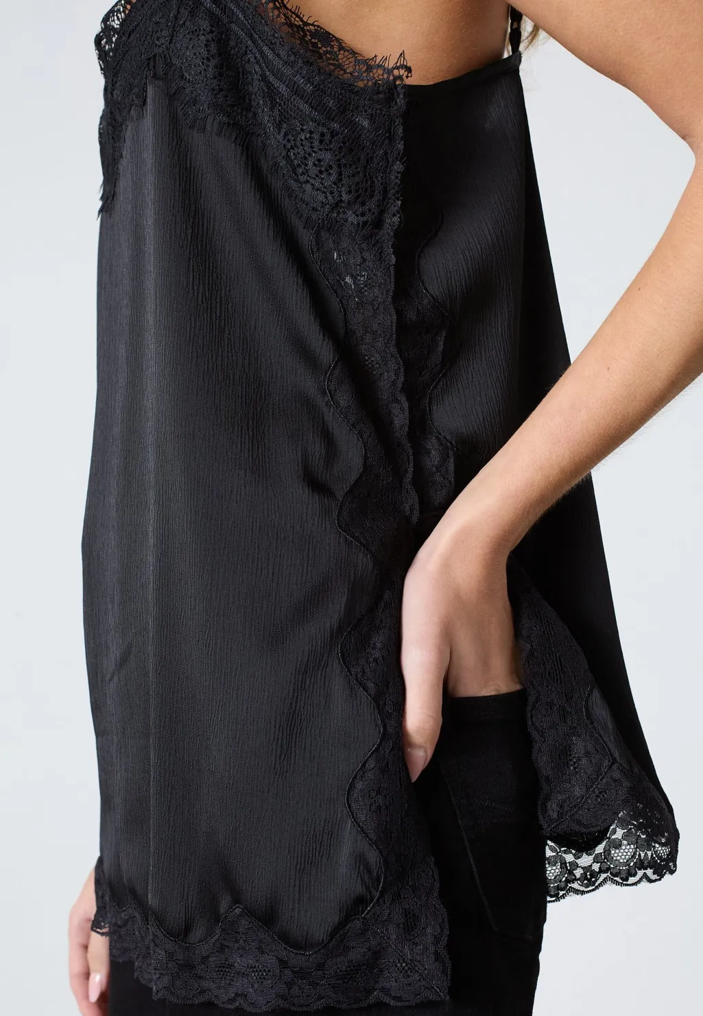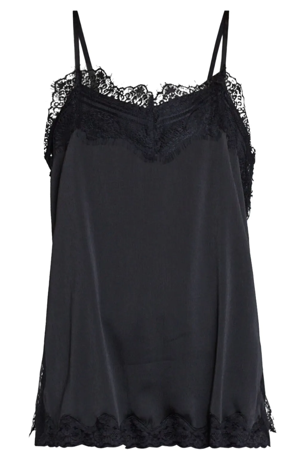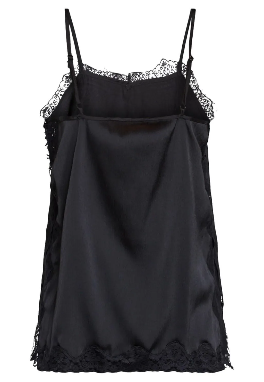 Sort top fra Sisters Point, lavet af satin med blondekanter. Toppen har tynde spaghettistropper og en V-udskæring med blonder.