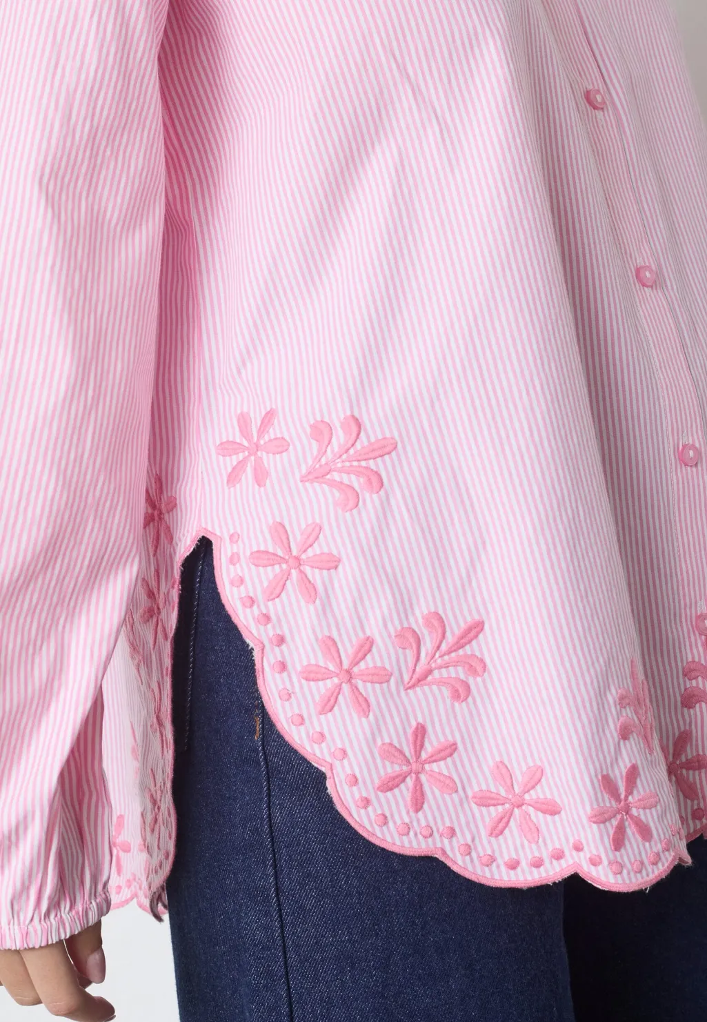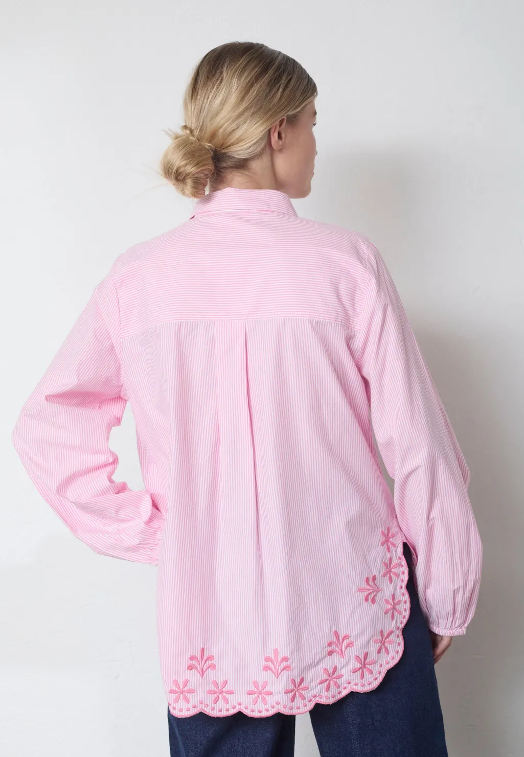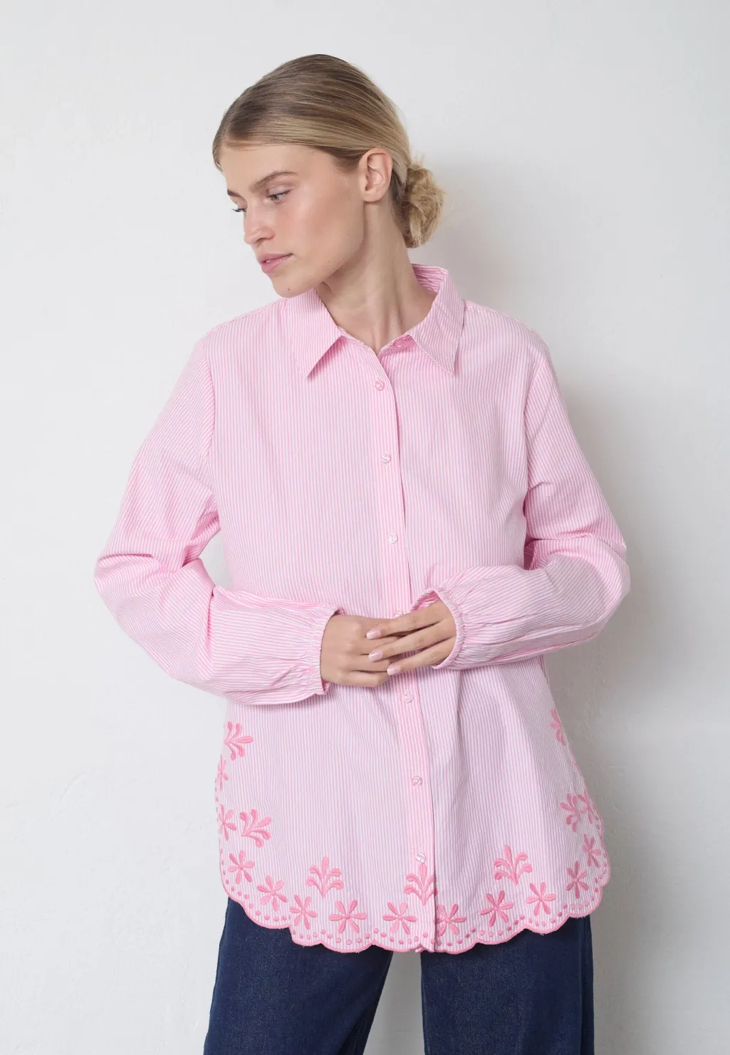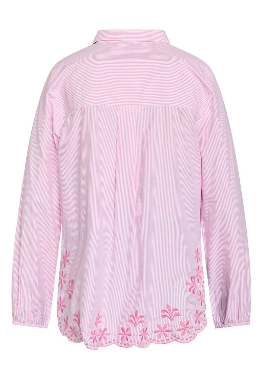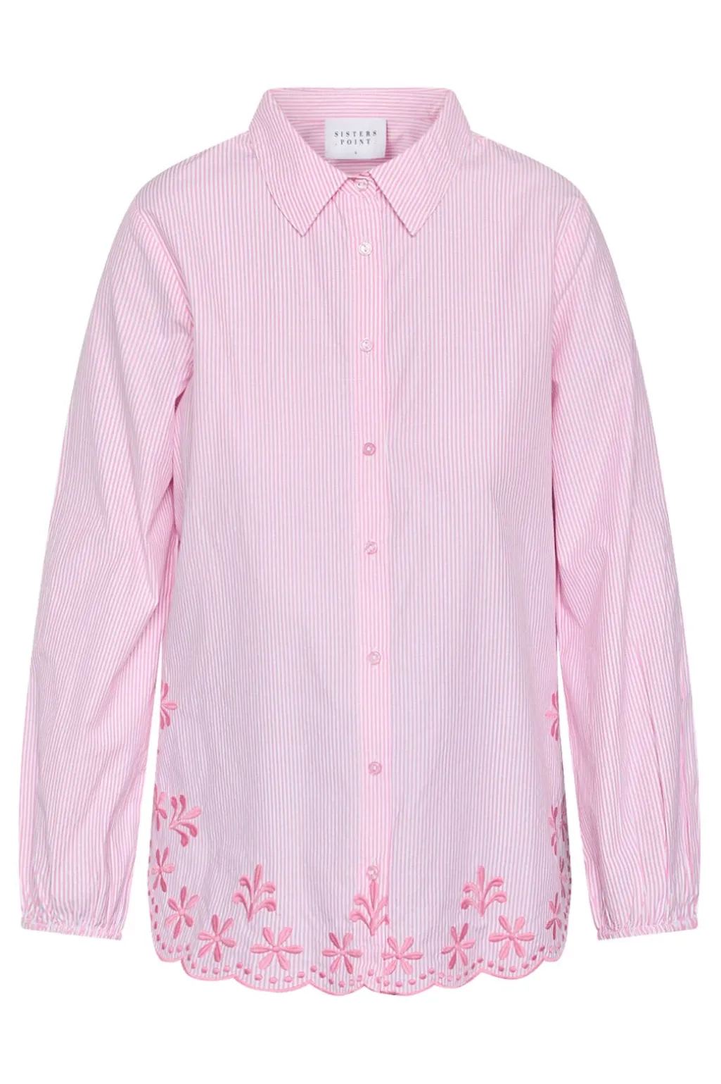 Stribet skjorte fra Sisters Point i lyserøde og hvide striber. Skjorten har blomsterbroderi langs nederste kant og klassisk krave med knaplukning.