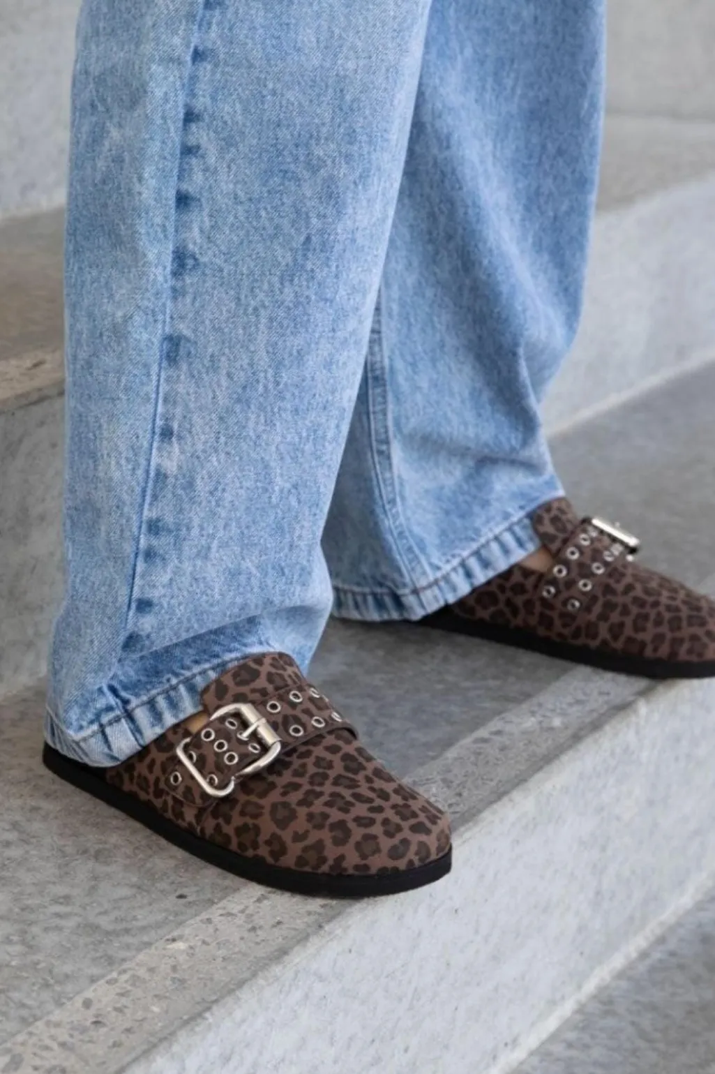 Ruskindloafers fra Copenhagen Shoes med brunt leopardprint. Skoen har en lav hæl og rund tå, der sammen med spændelukningen skaber en praktisk hverdagssko.