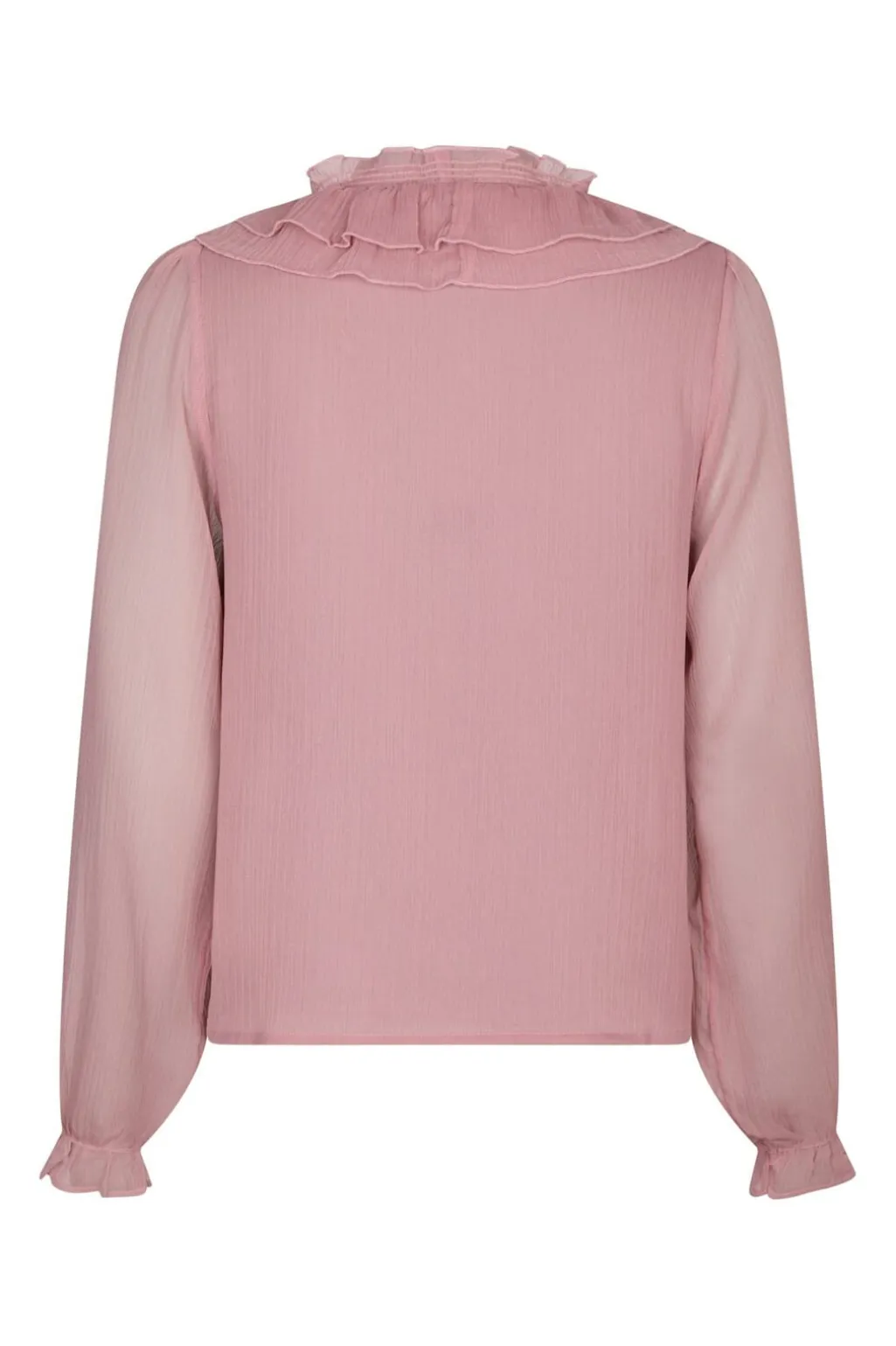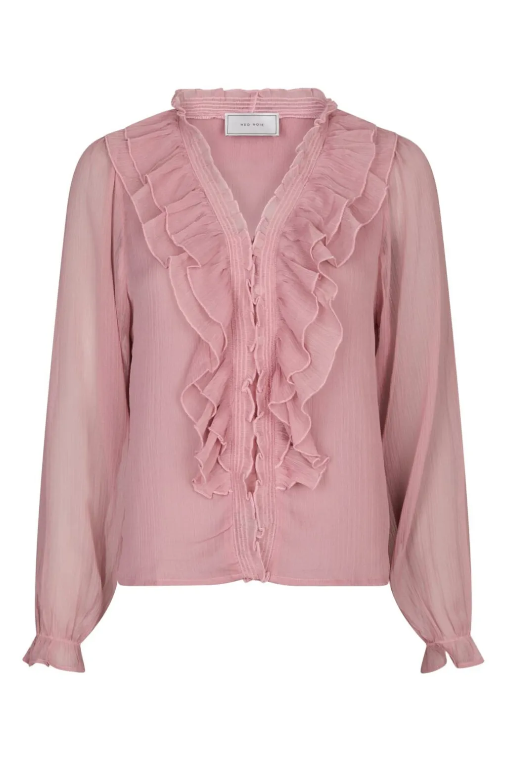 Rosa bluse fra Neo Noir med flæser og smockdetaljer. Blusen har V-hals, knapper foran og lange ærmer med rynkede manchetter. Den bløde chiffon giver et let fald.
