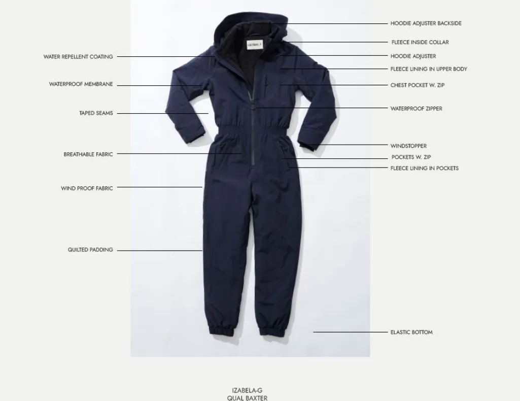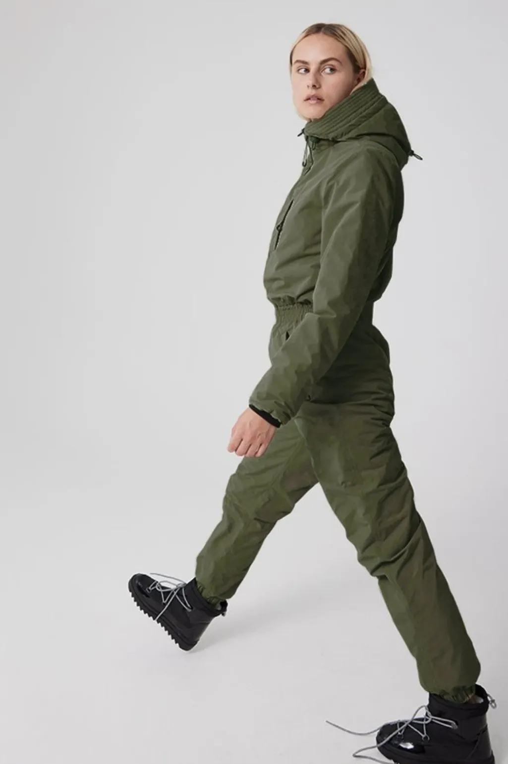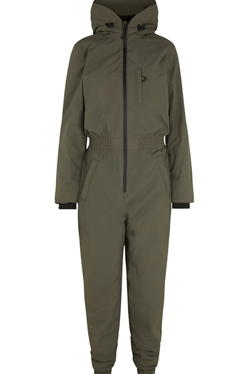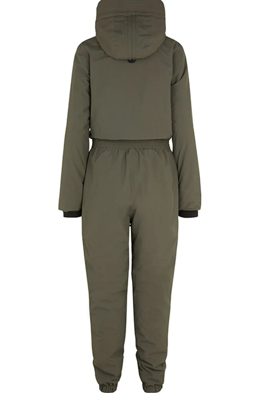 Olivengrøn flyverdragt fra Global Funk med vandafvisende egenskaber. Den har fleecefor i overkroppen og hætten samt polyesterfyld i arme og ben for god varme.