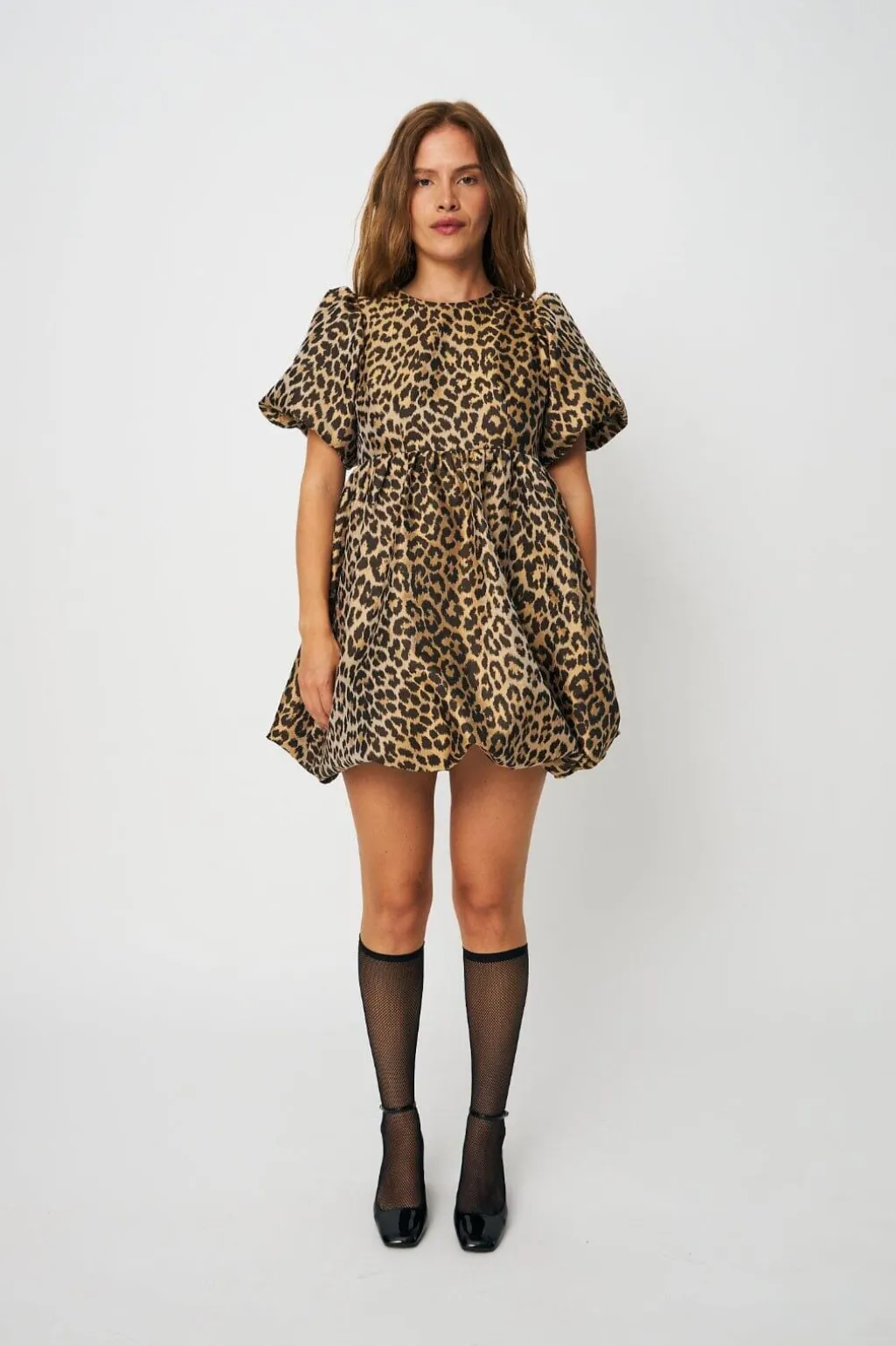 Kort kjole fra Cras med brunt leopardprint. Den har en oversize pasform med pufærmer og flæsedetaljer. Kjolen går til midt på låret og har en rund halsudskæring.