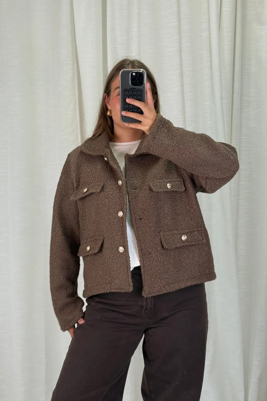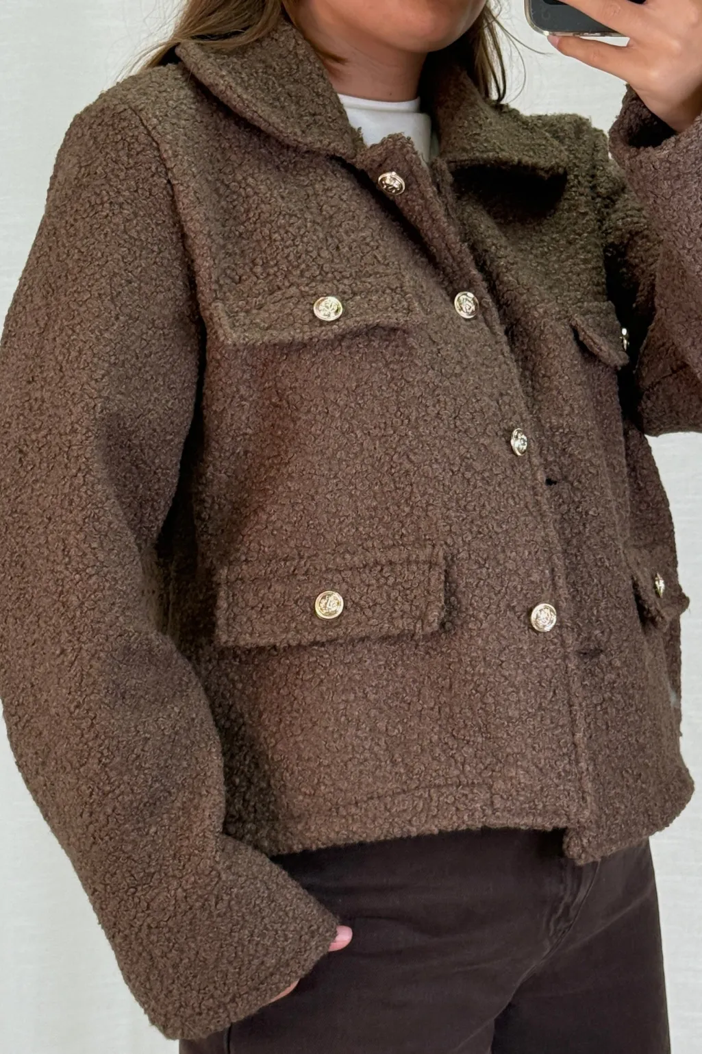 Mørkebrun jakke fra A-bee i en blanding af bomuld og polyester. Jakken har lange ærmer og en skjortekrave med knaplukning.