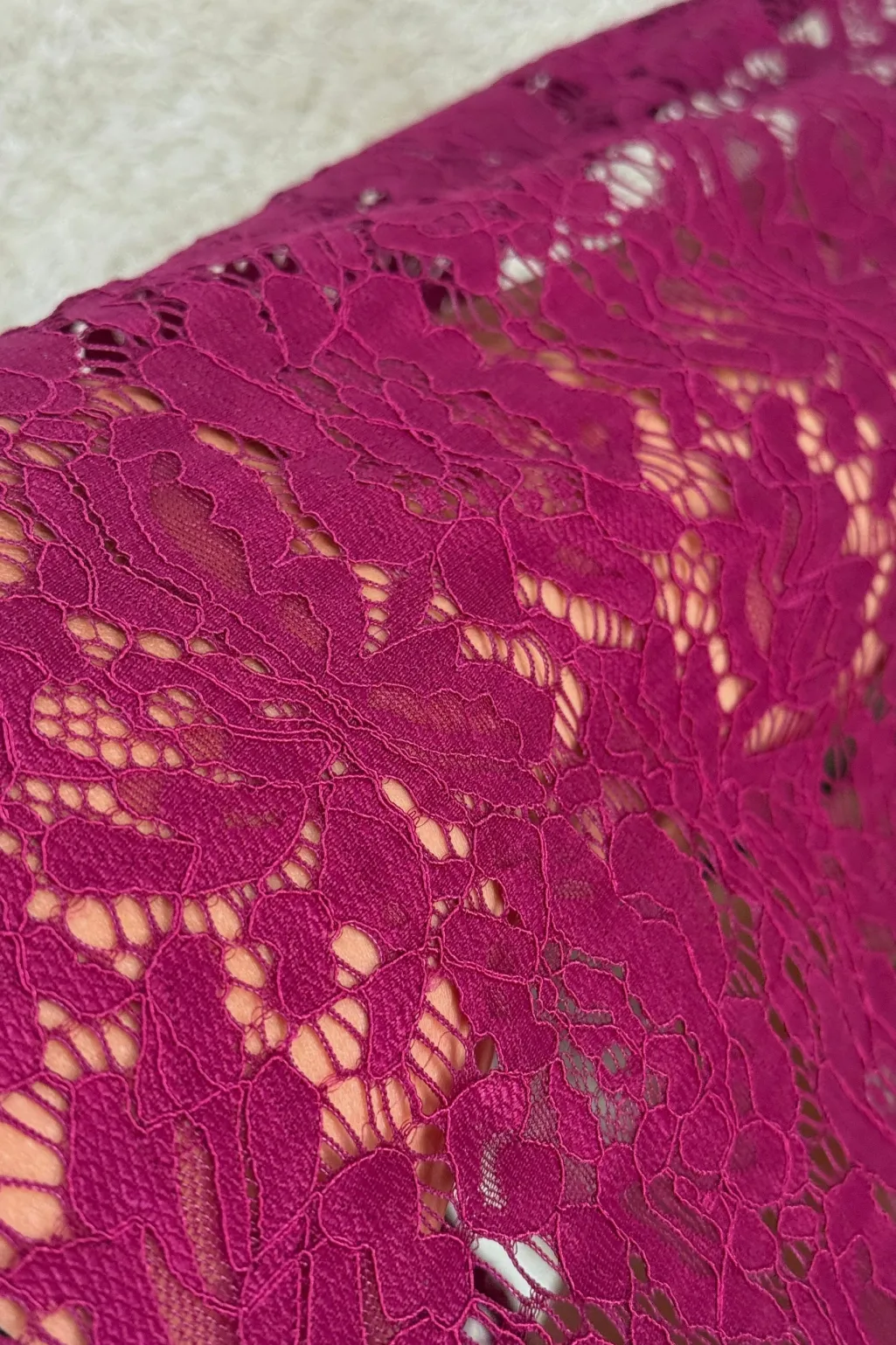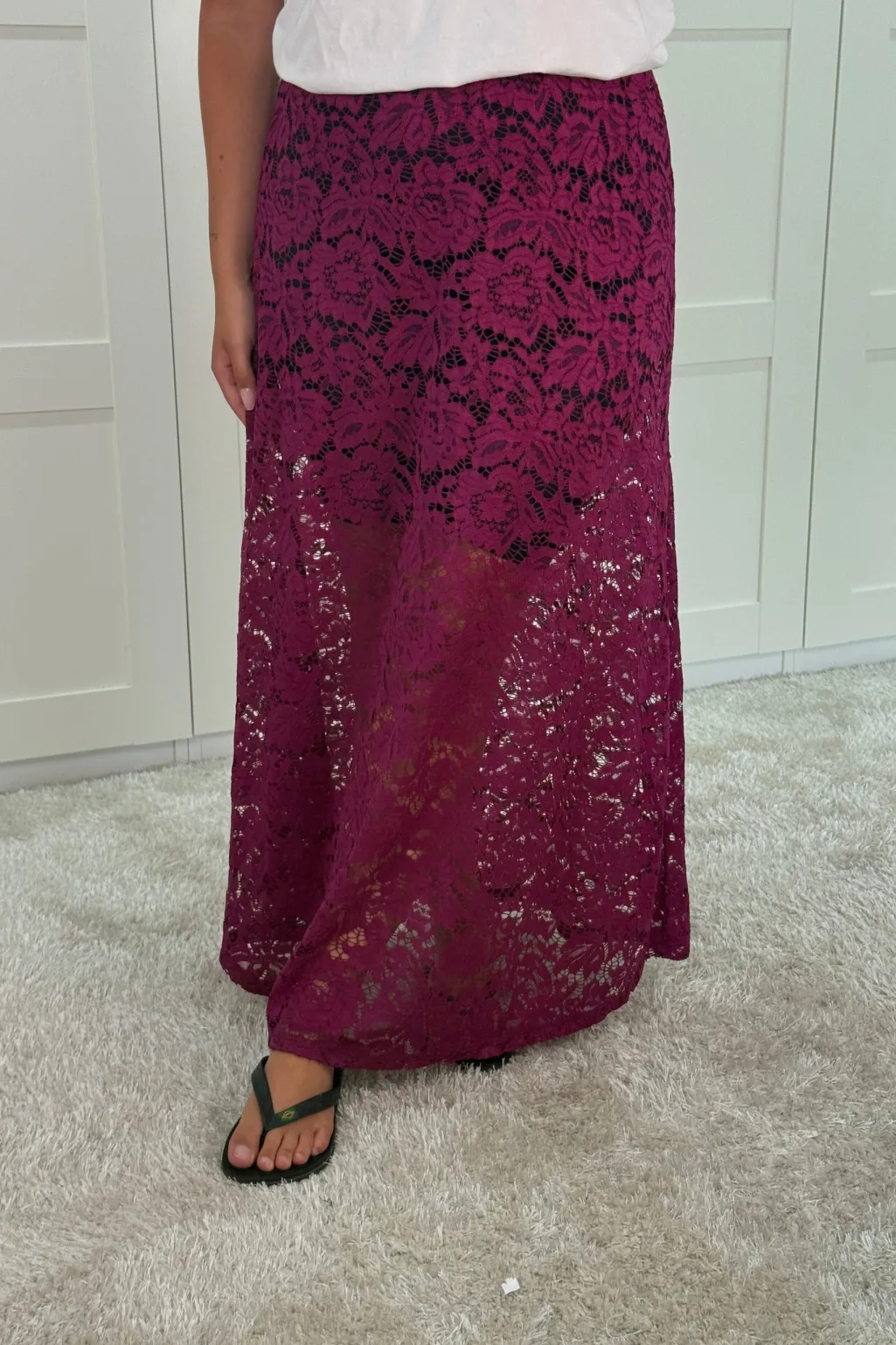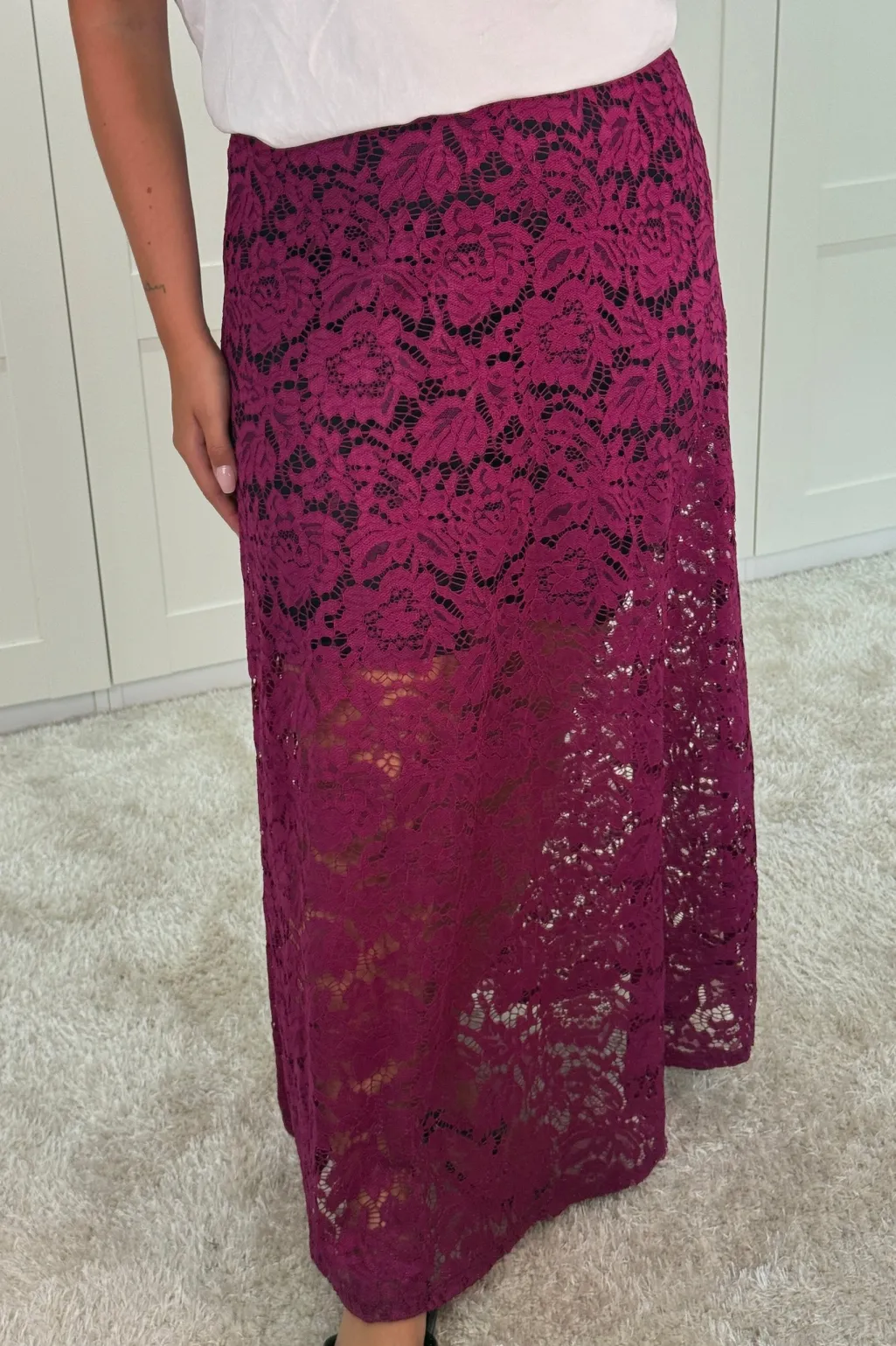 Lilla nederdel fra A-bee med blomstret blonde. Nederdelen har en normal talje og går ned til anklerne.