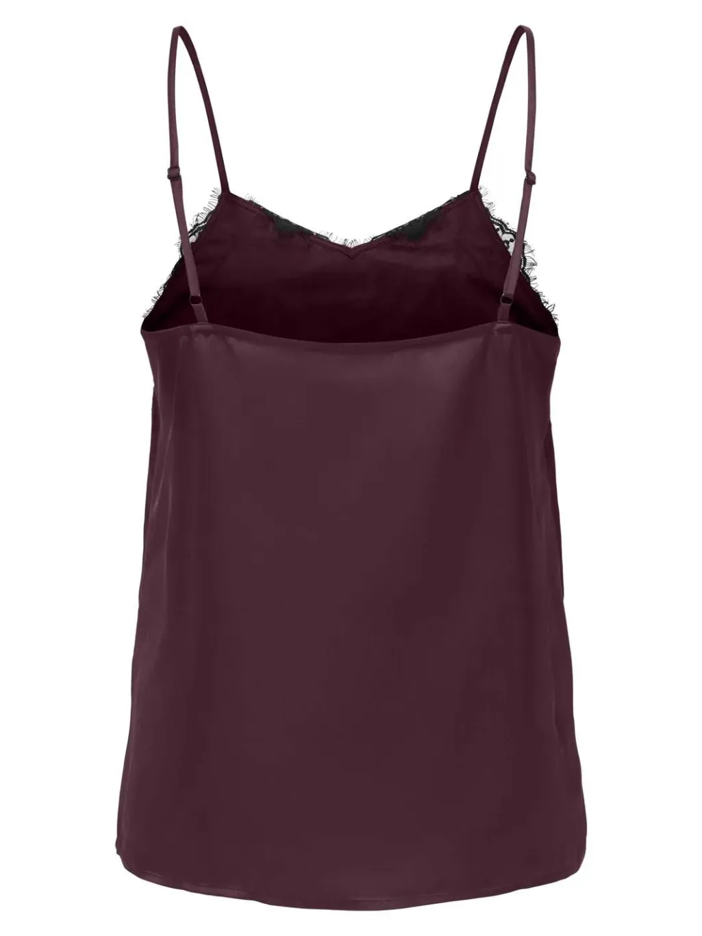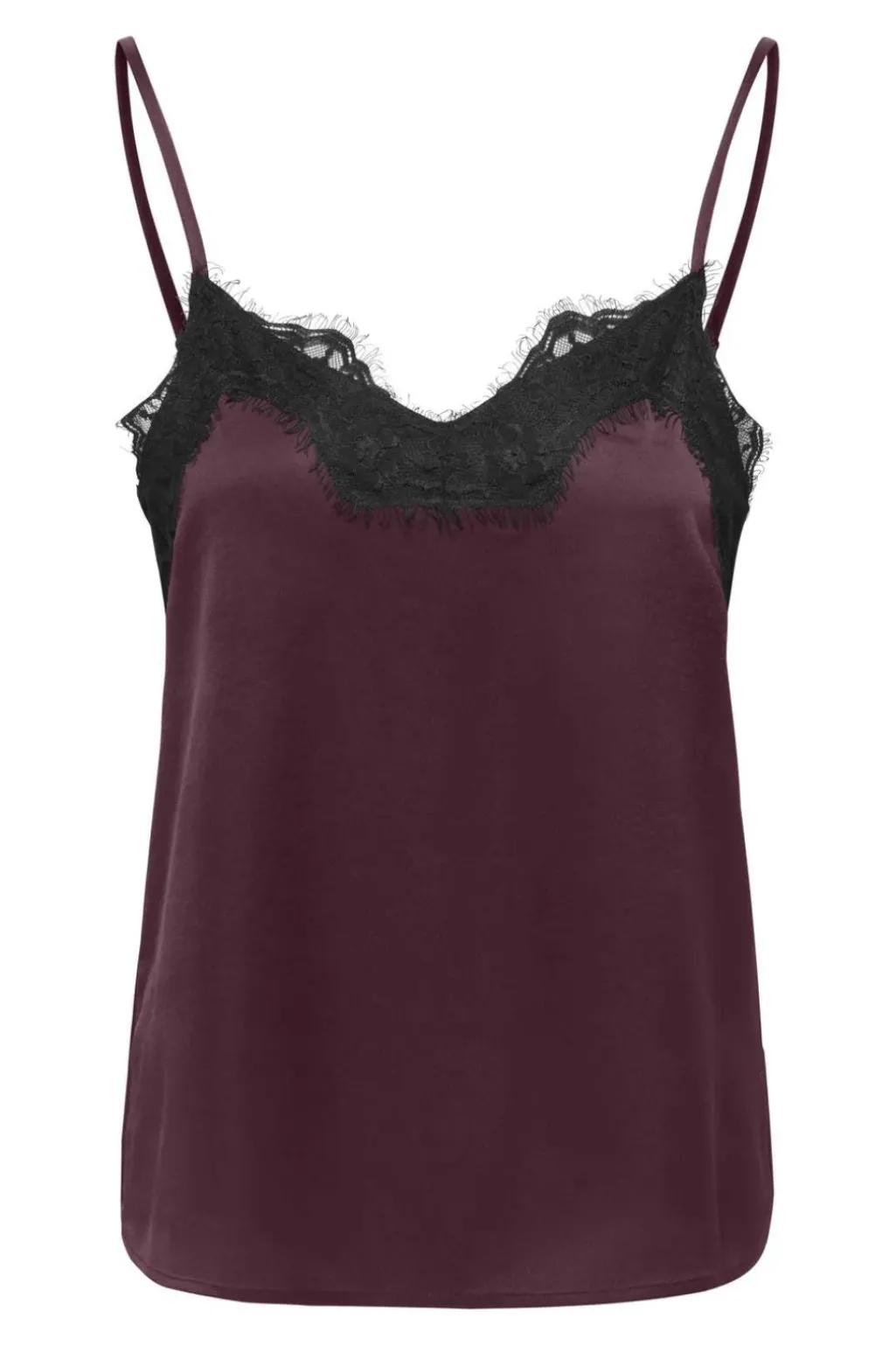 Singlet fra JDY i dyb burgunderfarve med blondedetaljer. Toppen er lavet af 100 % polyester og har tynde, justerbare stropper.