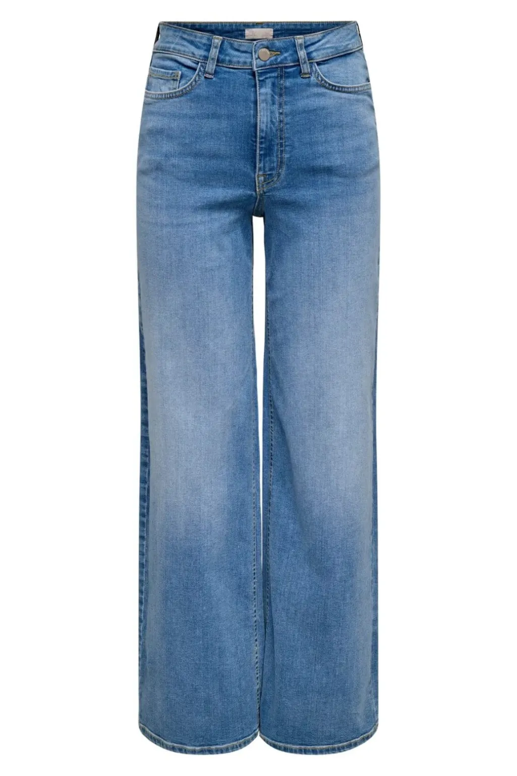 Wide-leg jeans fra JDY i mellemblå denim. Jeansene har et bredt ben, høj talje og en løs pasform med plads fra hofte til ankel.