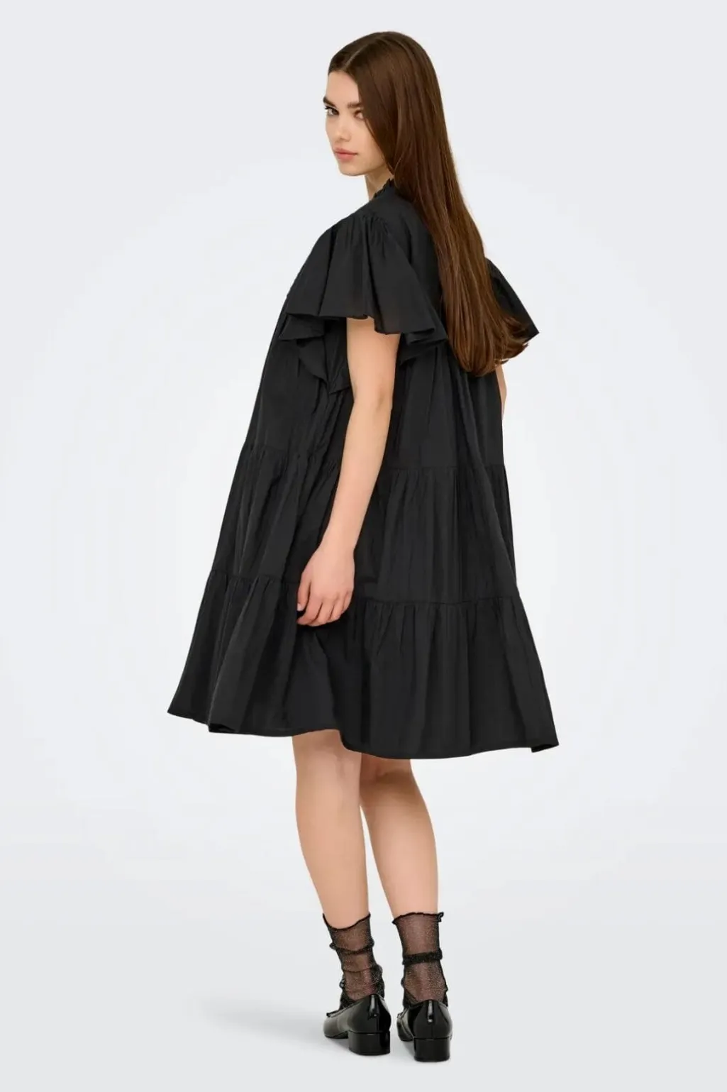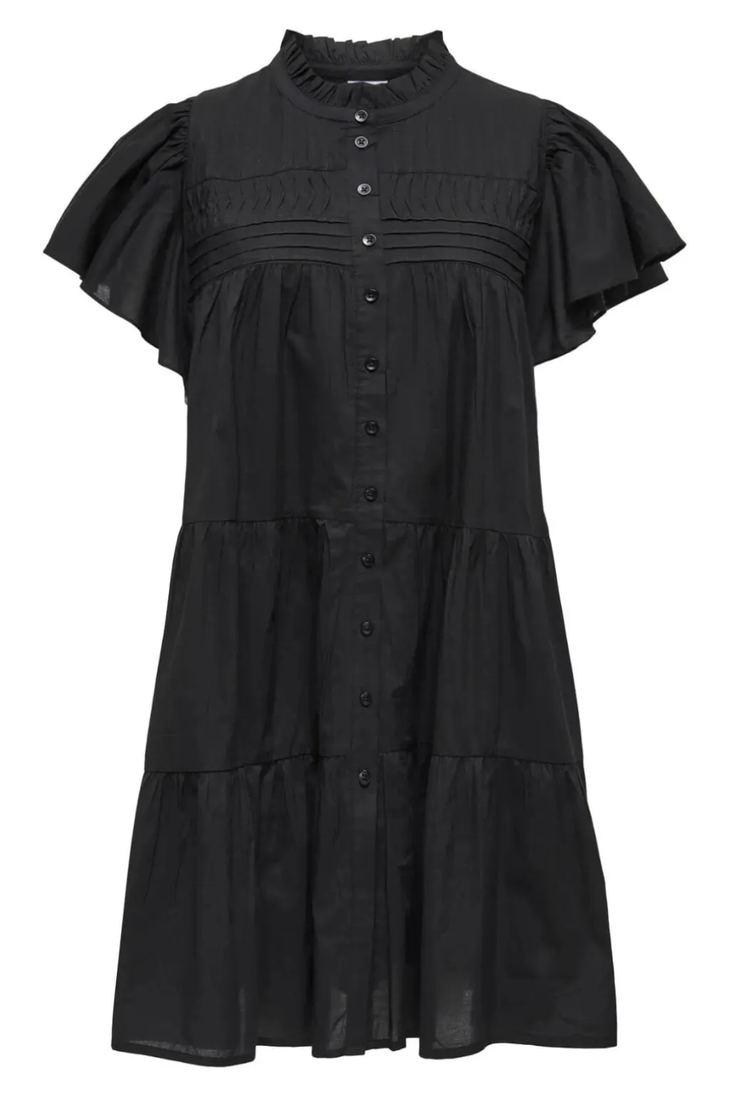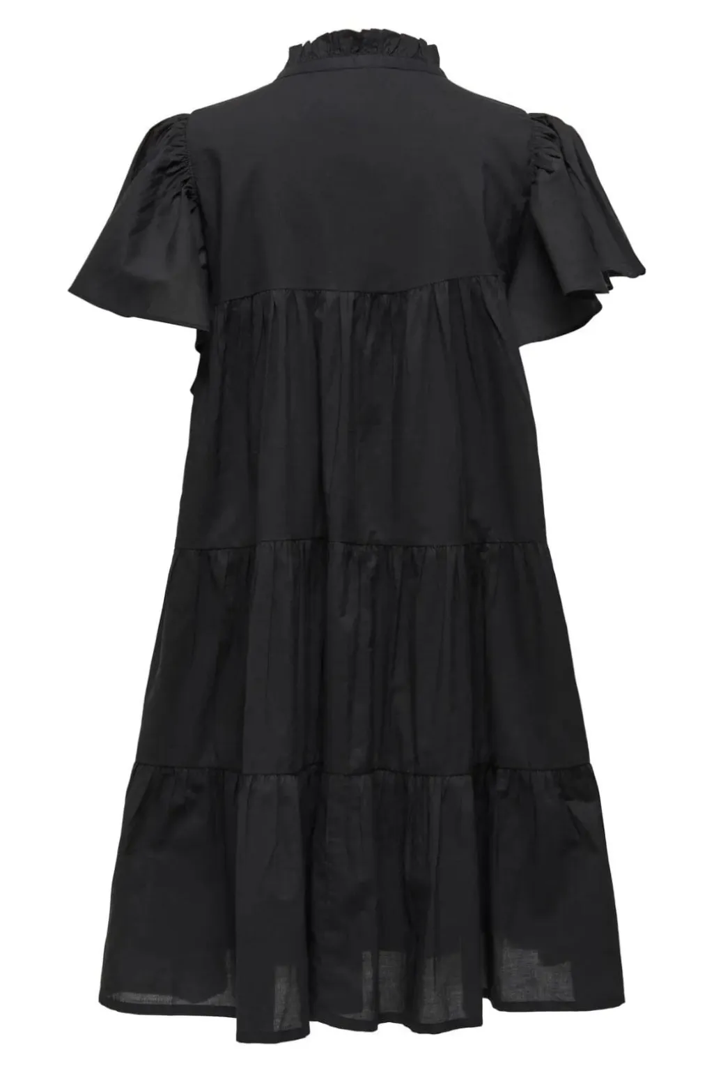 Sort skjortekjole fra JDY med korte pufærmer og høj hals med flæsekant. Kjolen har knaplukning hele vejen ned og et lagdelt design med flere flæser.