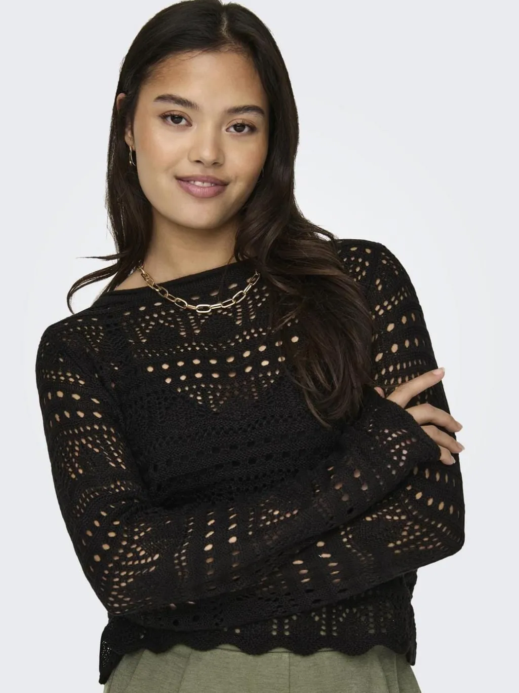 Sort striktrøje fra JDY med åbent strikmønster og bådudskæring. Trøjen har en muslingekantet detalje langs udskæringen og en bølget kant forneden.