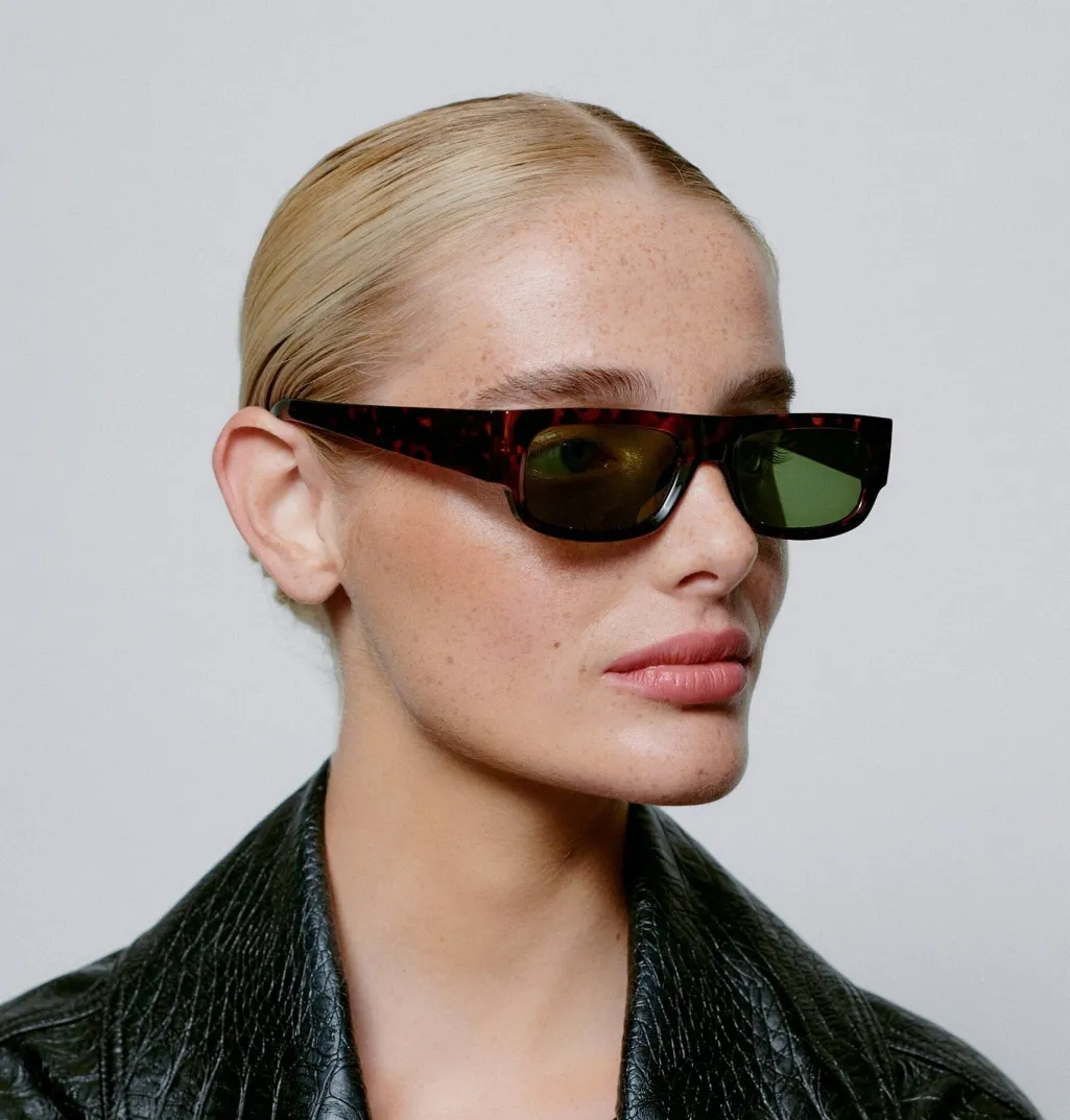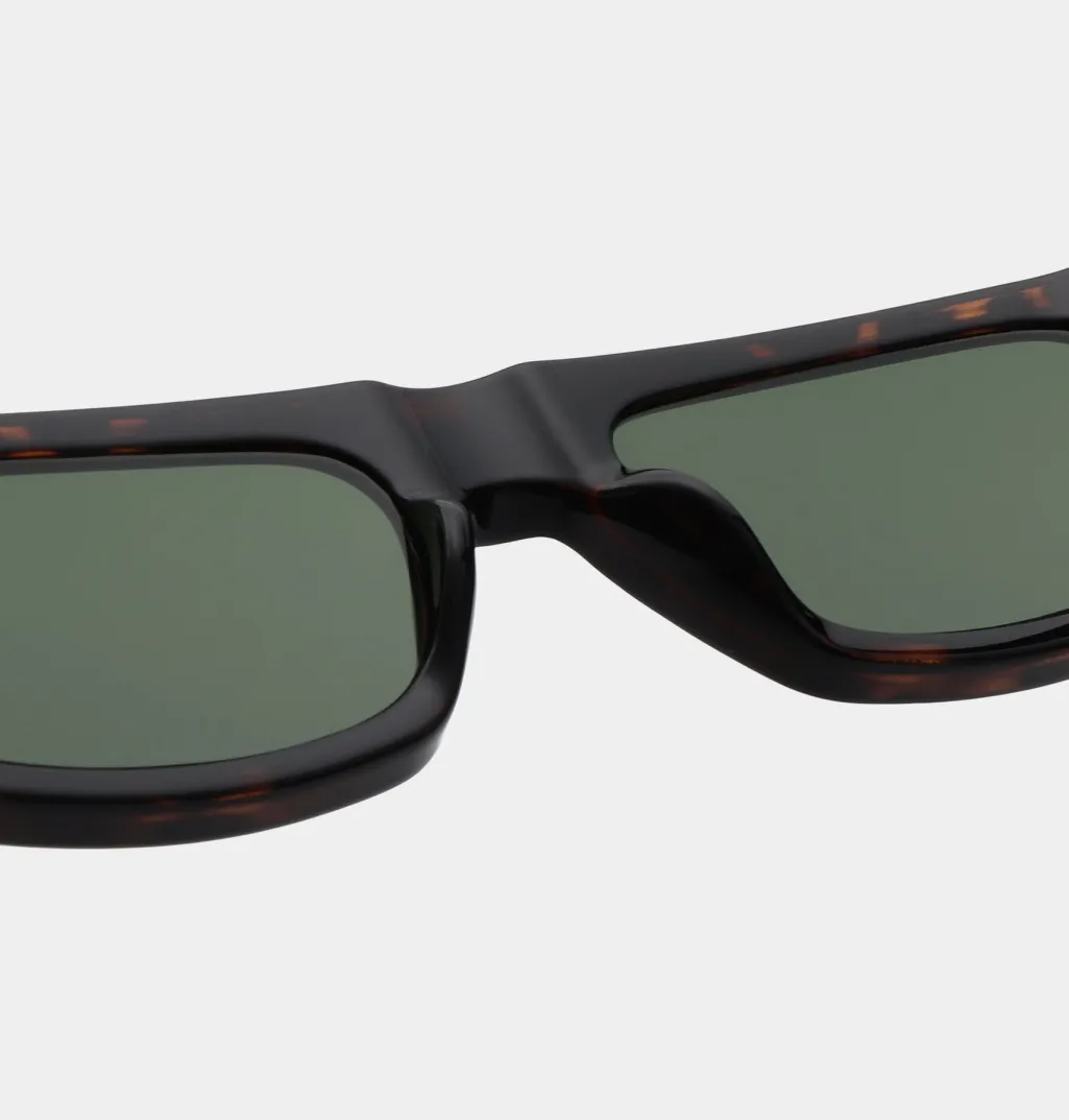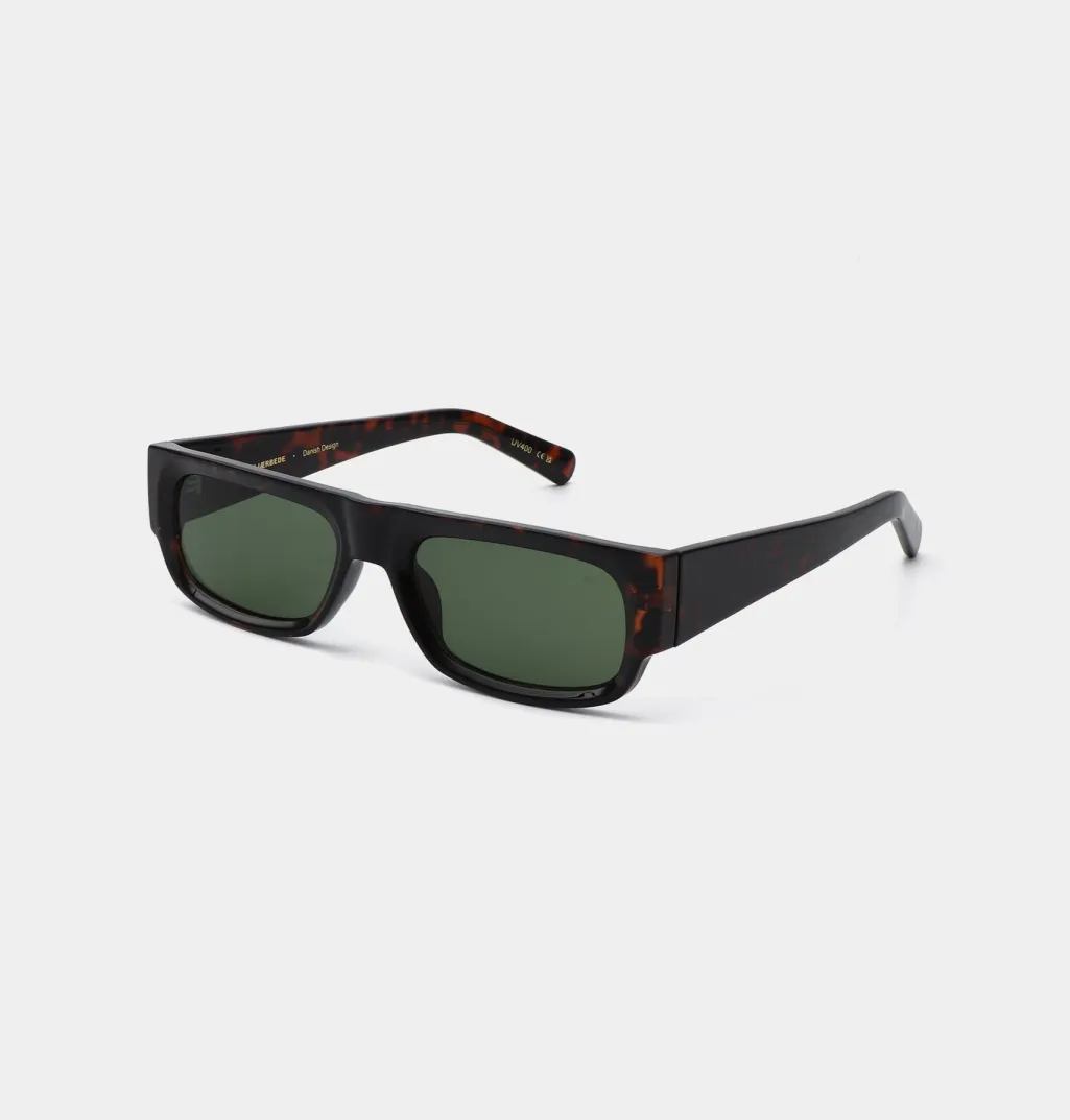 Rektangulære solbriller fra A. Kjærbede med skildpaddemønstret stel og grønne linser. Brillerne har formbare stænger og er udstyret med UV 400-beskyttelse.