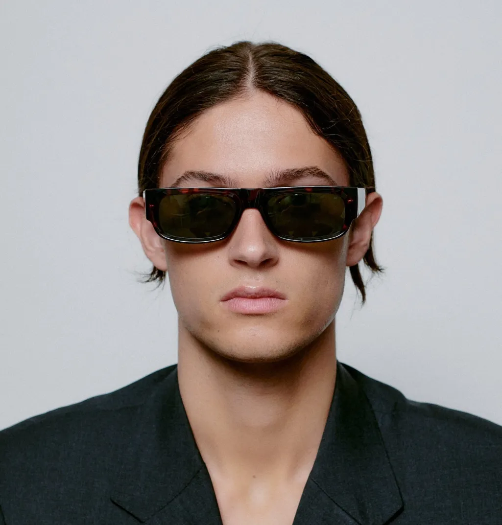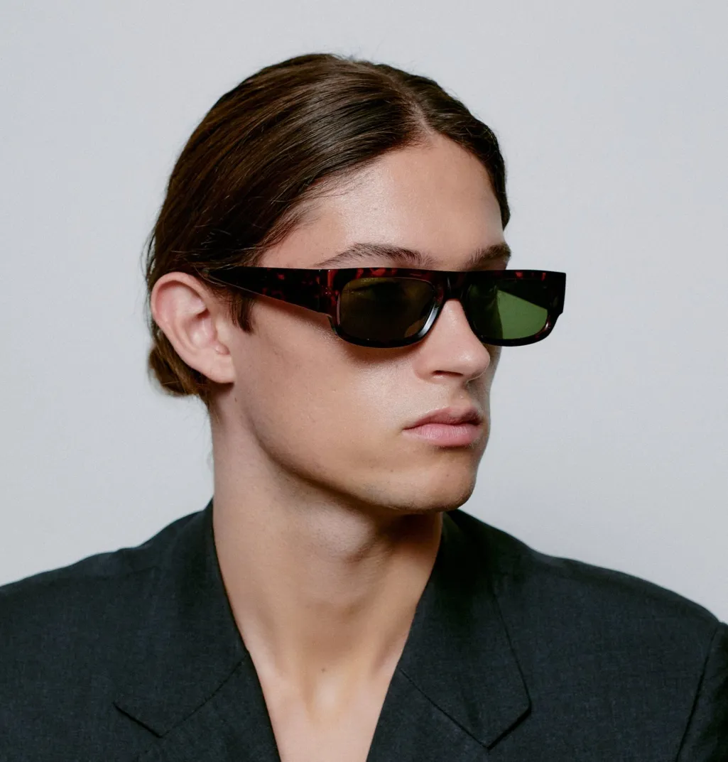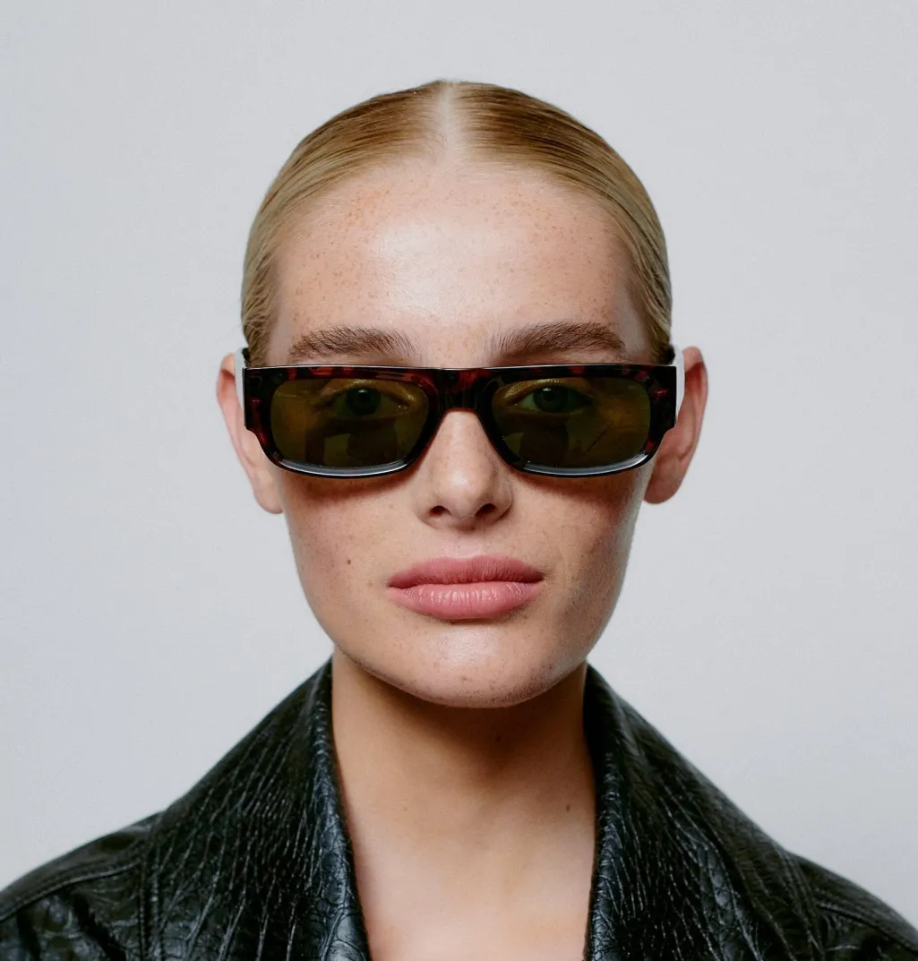 Rektangulære solbriller fra A. Kjærbede med skildpaddemønstret stel og grønne linser. Brillerne har formbare stænger og er udstyret med UV 400-beskyttelse.