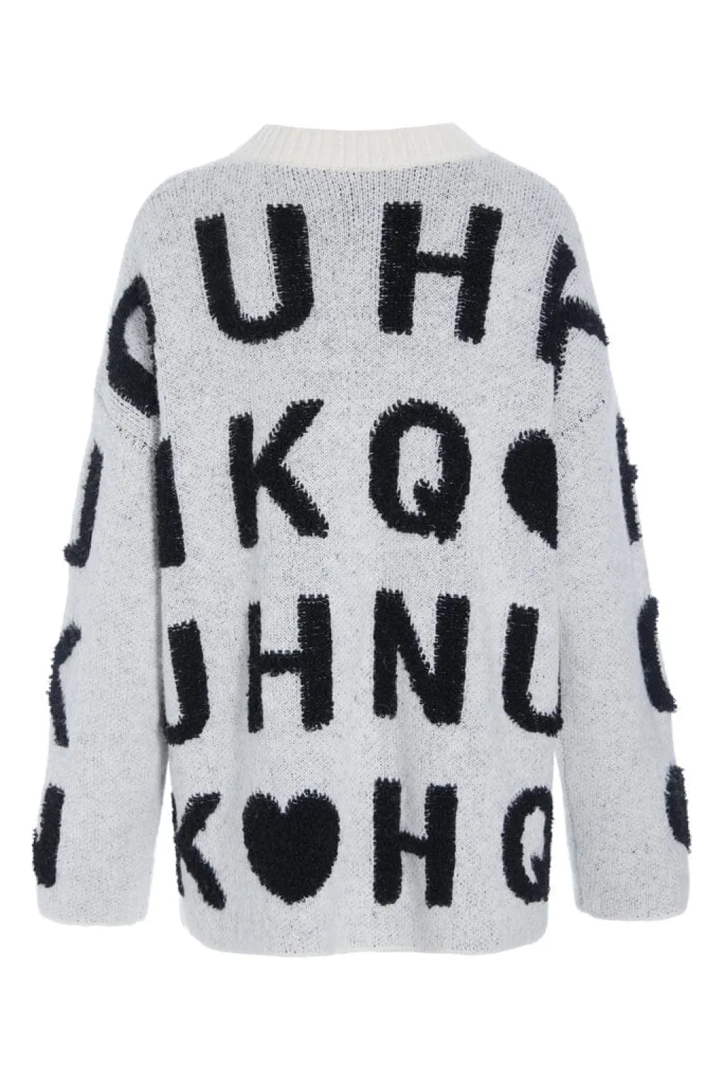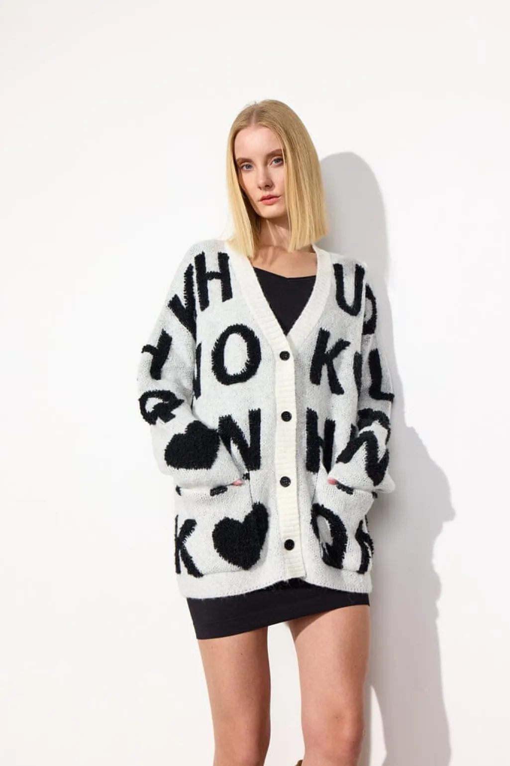 Hvid strikket cardigan fra Hunkøn med V-hals og knaplukning. Den oversized pasform og de brede ærmer skaber en afslappet silhuet. Cardiganen har to praktiske forlommer.