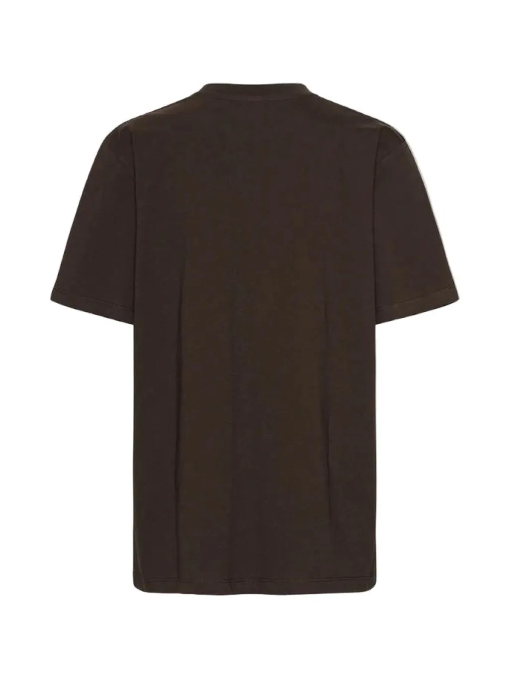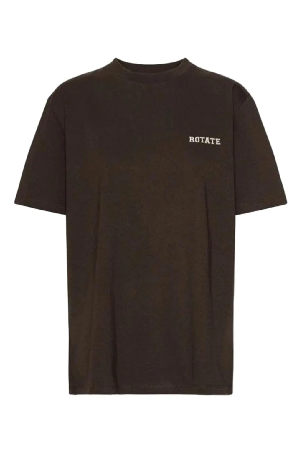 Brun jersey T-shirt fra Rotate med broderet logo på brystet. T-shirten har en oversized pasform og er lavet i en blød kvalitet med rund halsudskæring.