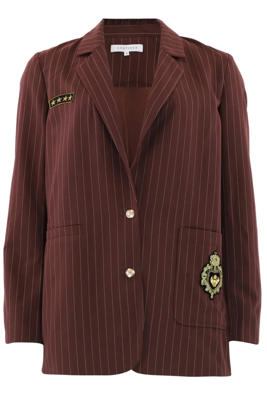 En blazer fra Continue, lavet af 70 % polyester og 30 % viskose i hvid med bordeaux striber. Blazeren har pinstripe-mønster gennem hele stoffet.