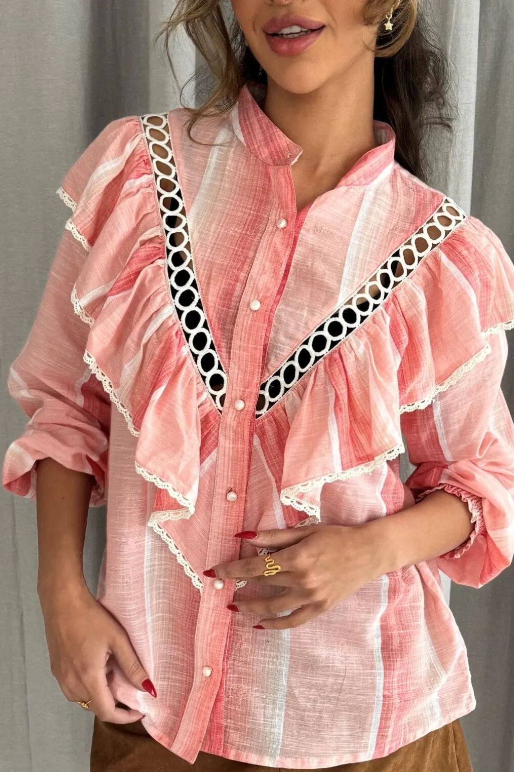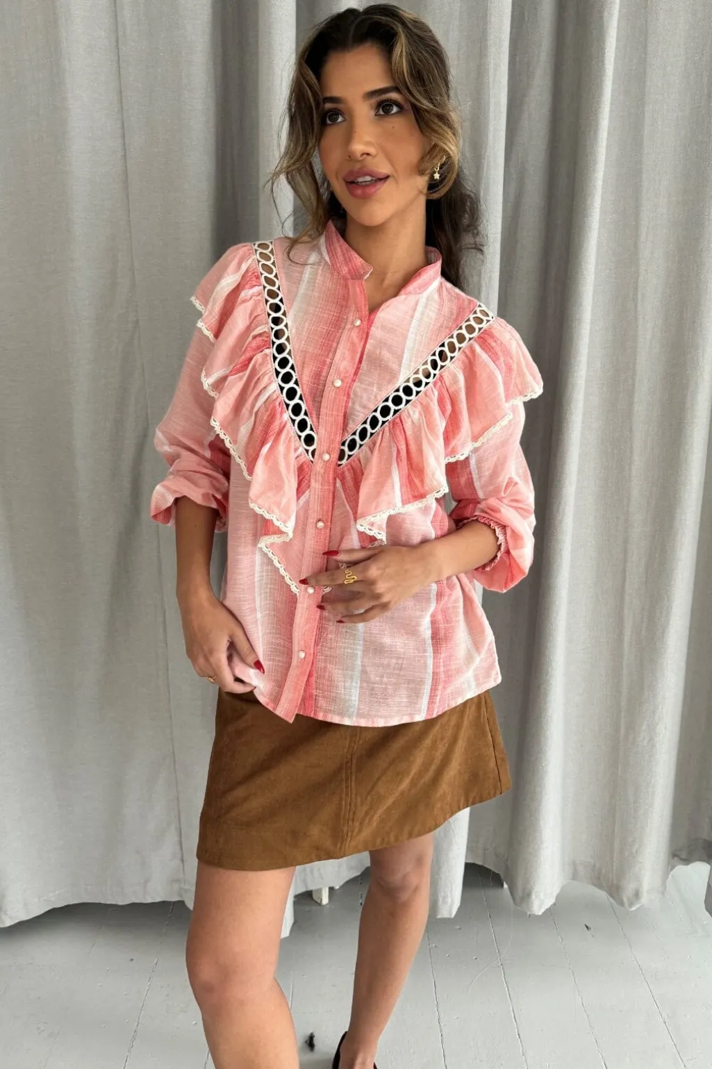 Pastelpink skjorte fra Continue med striber og volanger. Skjorten har en skjortekrave og 3/4-ærmer med flæser. Det sorte og hvide cirkulære mønster langs volangerne skaber en fin kontrast.