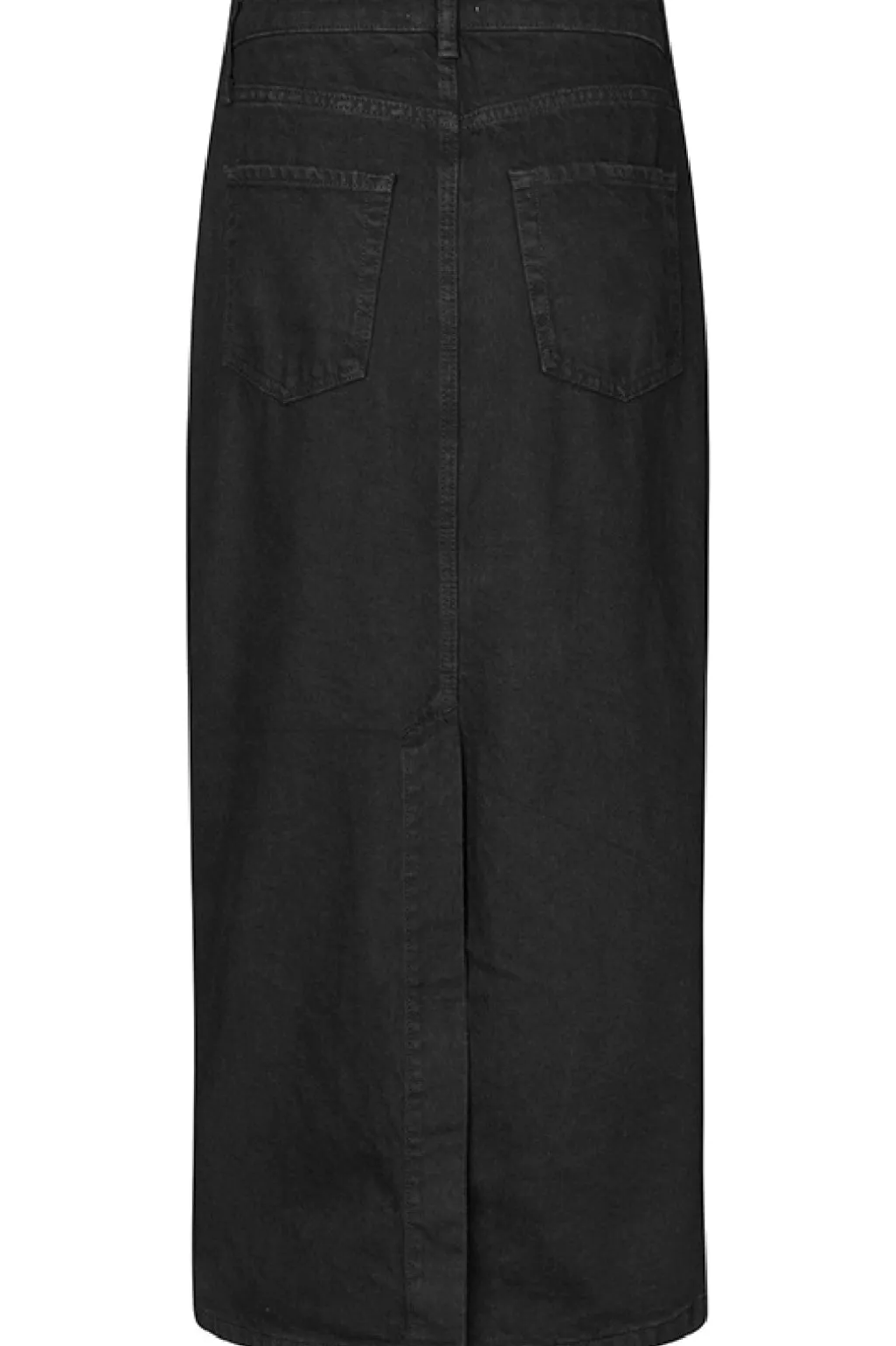 Sort denimnederdel i læglængde fra Global Funk. Nederdelen har en lige silhuet med løs pasform og praktisk lukning med både knapper og lynlås foran.