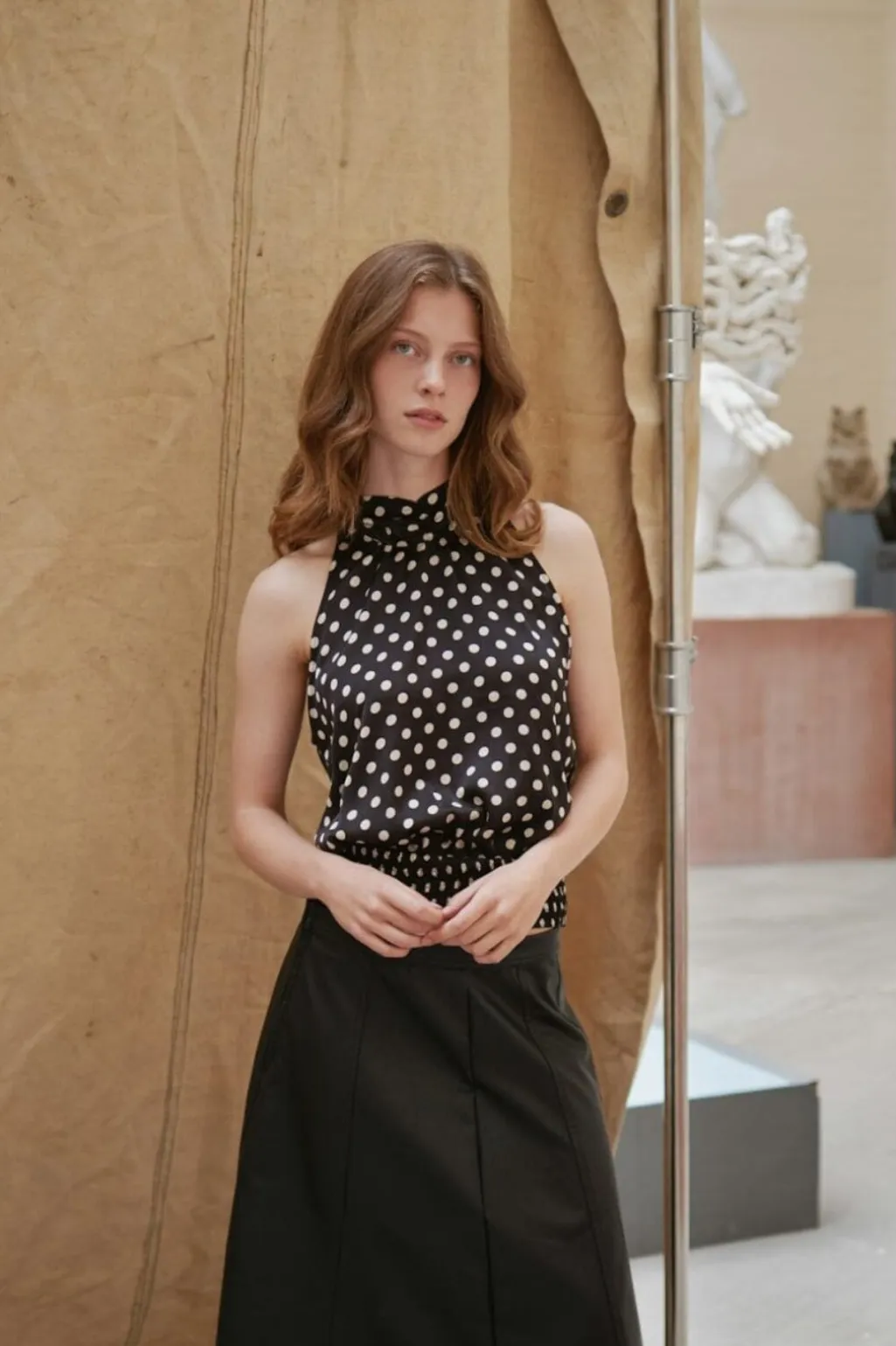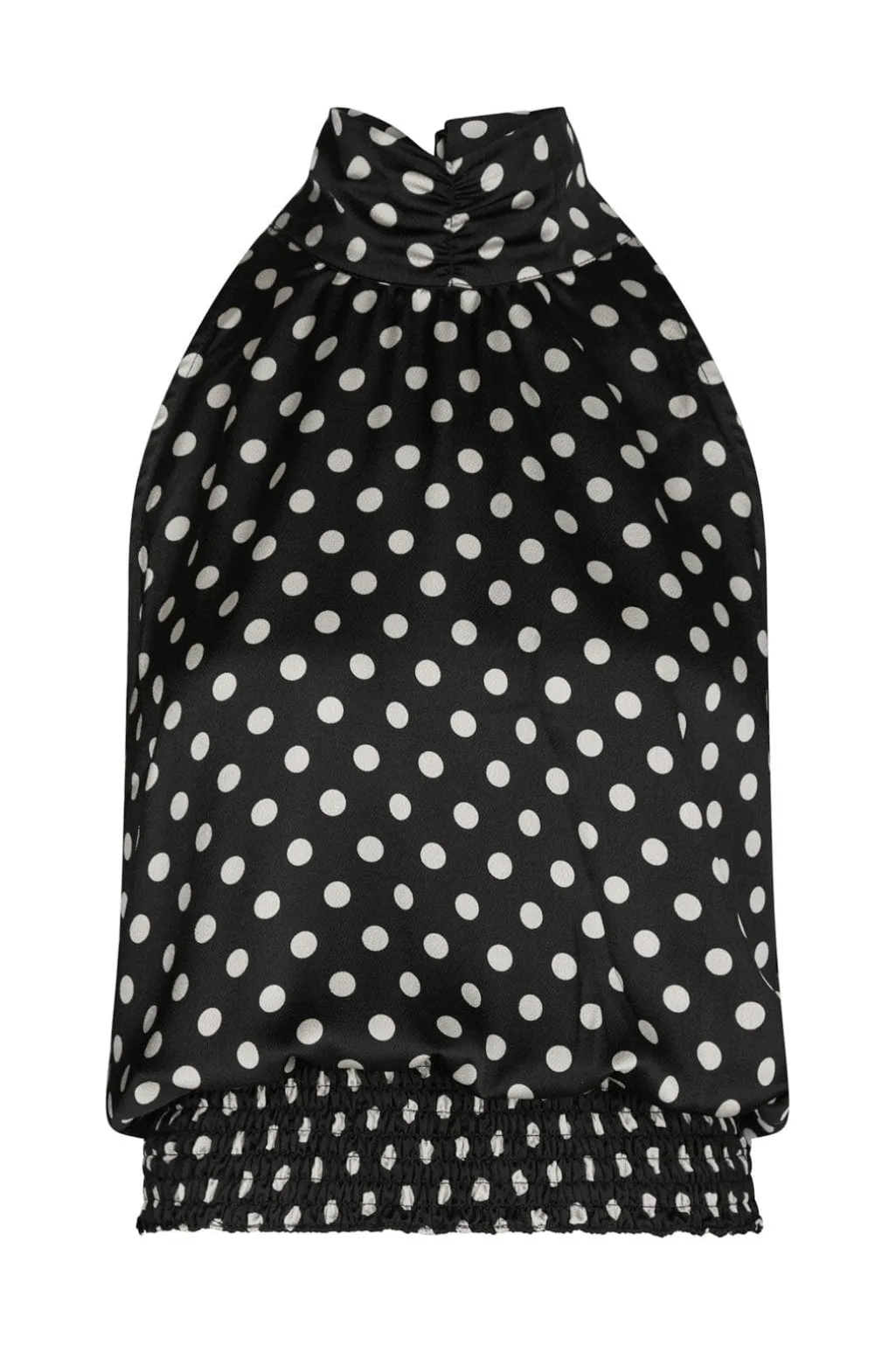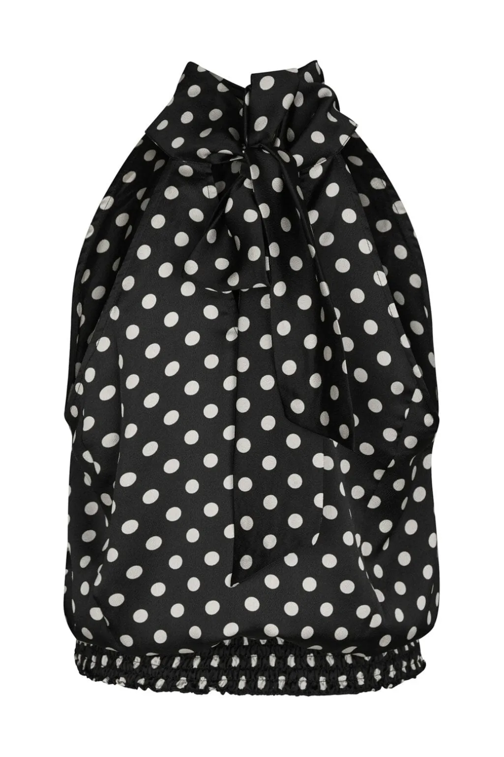 Sort top fra Neo Noir med hvide polkaprikker. Toppen har høj halsudskæring og halterneck-design med bindebånd. Smockdetaljer ved bunden giver en god pasform.