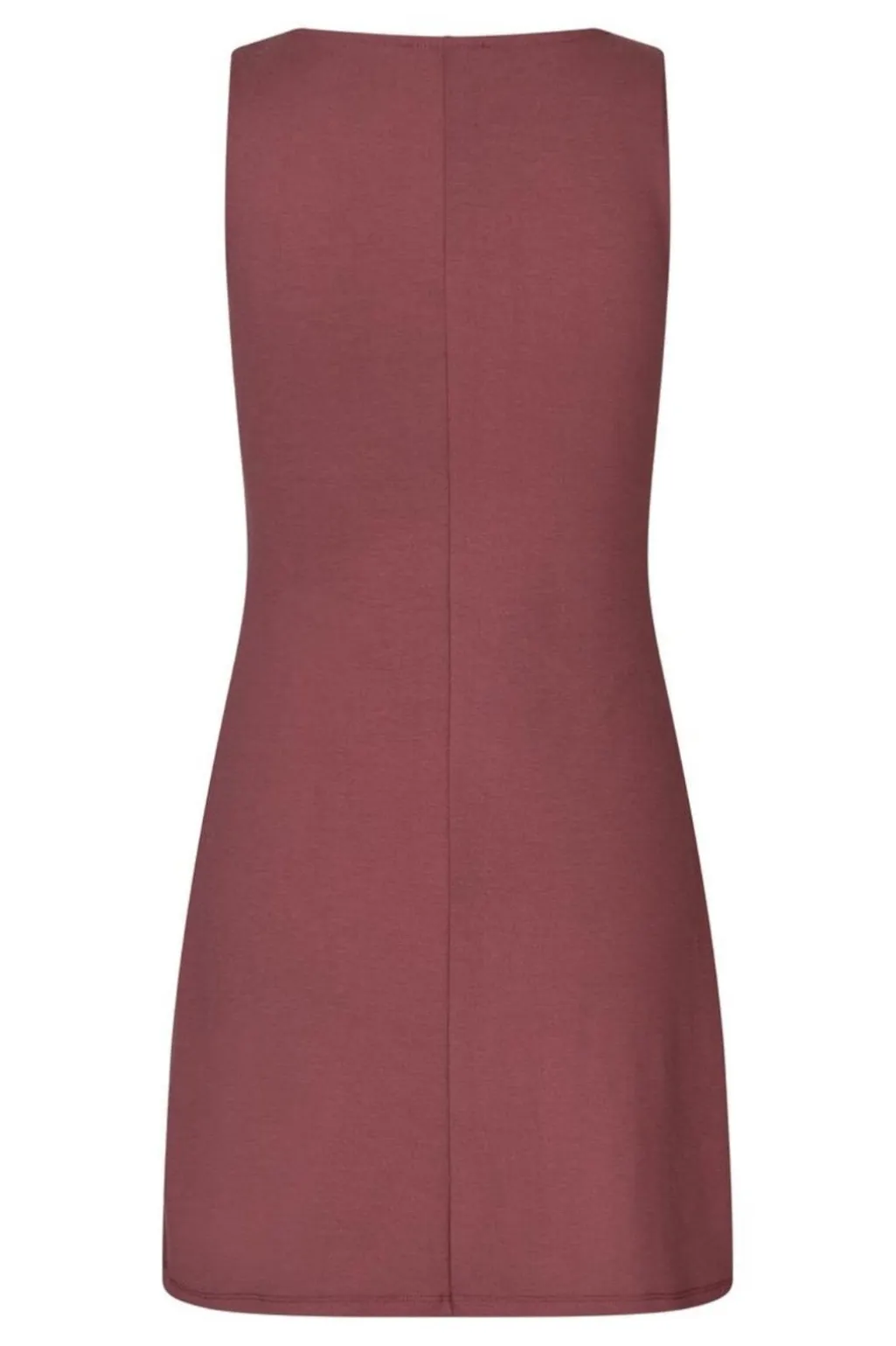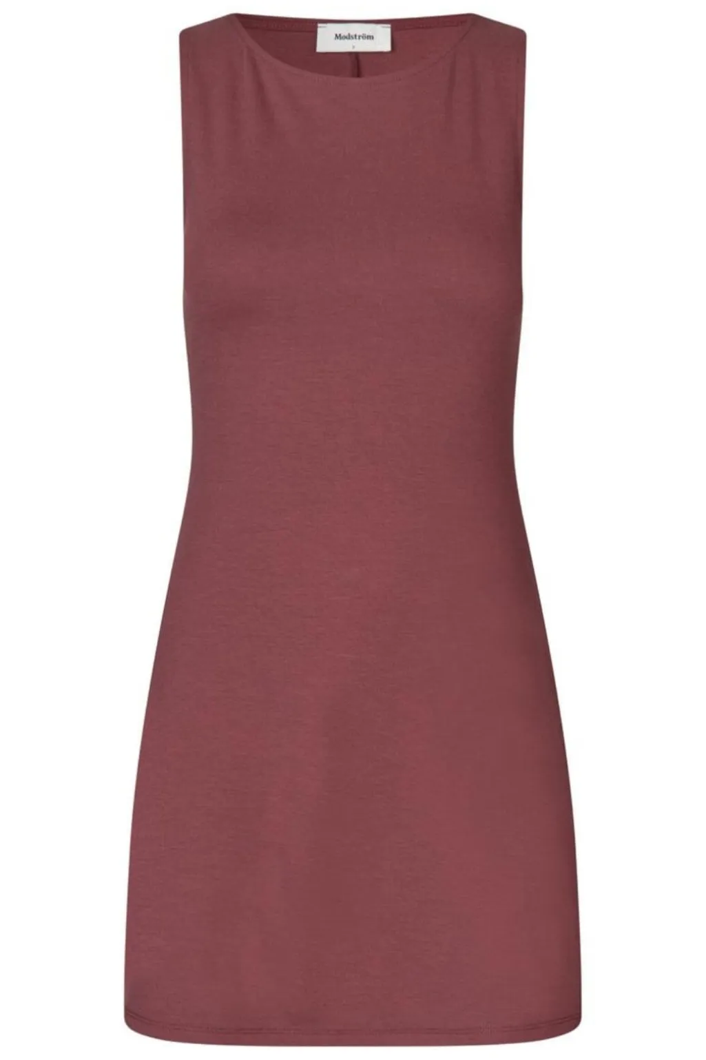 Ærmeløs kjole fra Modström i en dyb burgunderfarve. Kjolen har en A-facon med rund hals og er syet i et strækbart materiale med en god pasform.