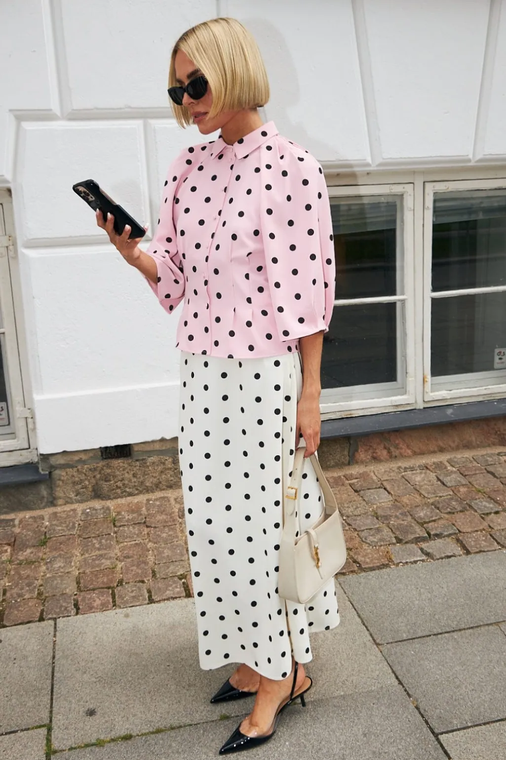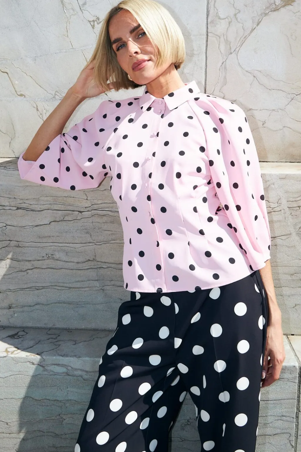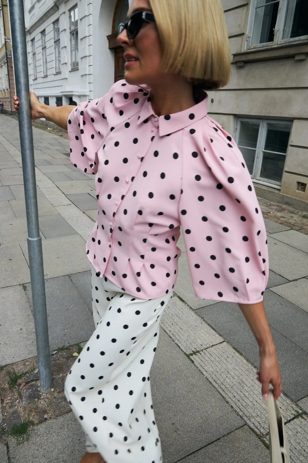 Skjorte med brede ærmer og tætsiddende krop. Dekoreret med stofbetrukne knapper.• Brede ærmer • Tætsiddende krop • Stofbetrukne knapper Modellen er XXX cm høj og bærer en størrelse 36.Materiale: 100% polyester