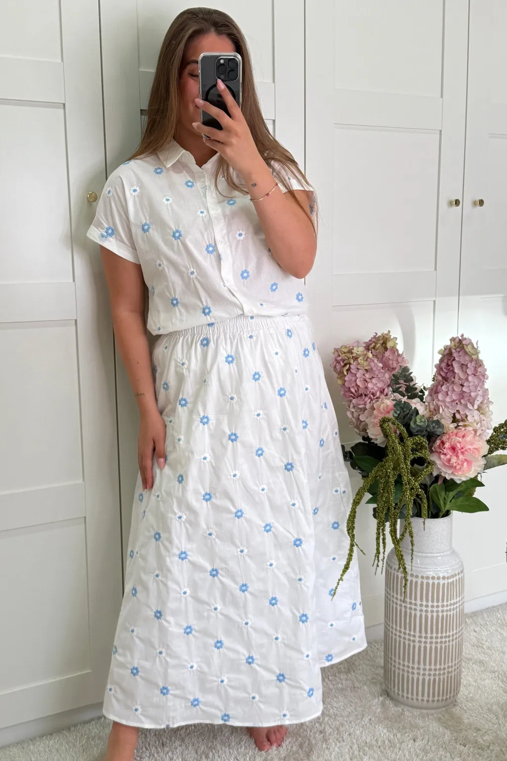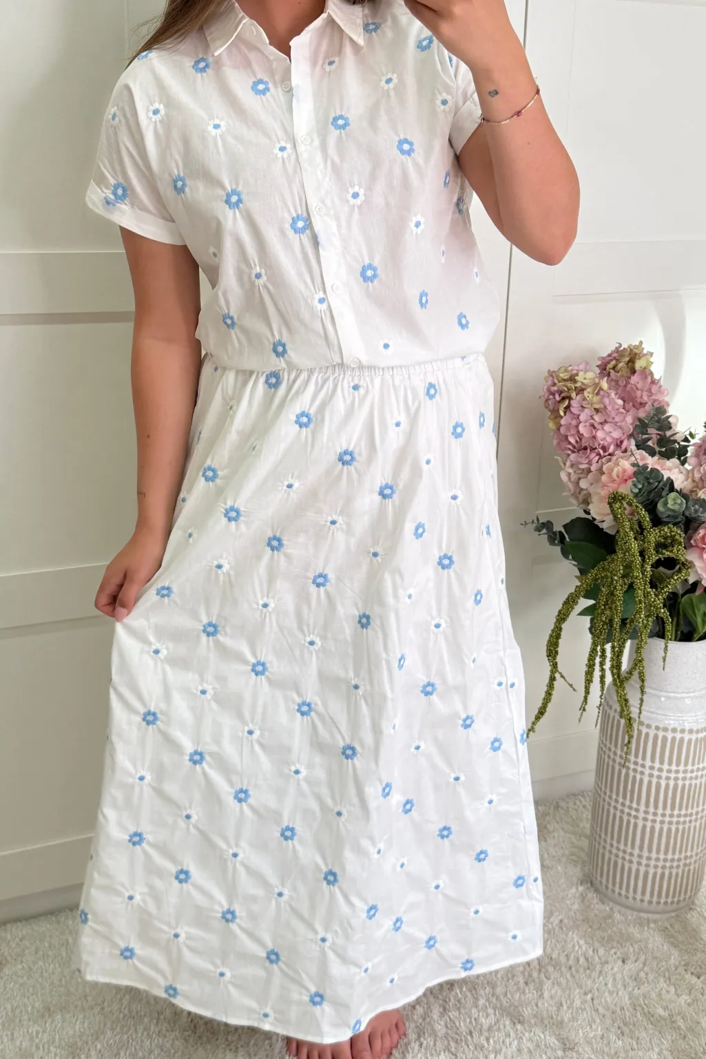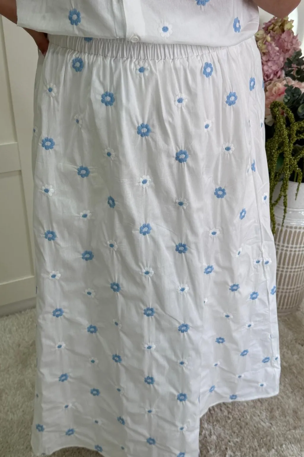 Hvid nederdel fra A-bee med blå blomsterbroderi. Nederdelen har knaplukning foran og en elastisk talje, der giver en behagelig pasform.