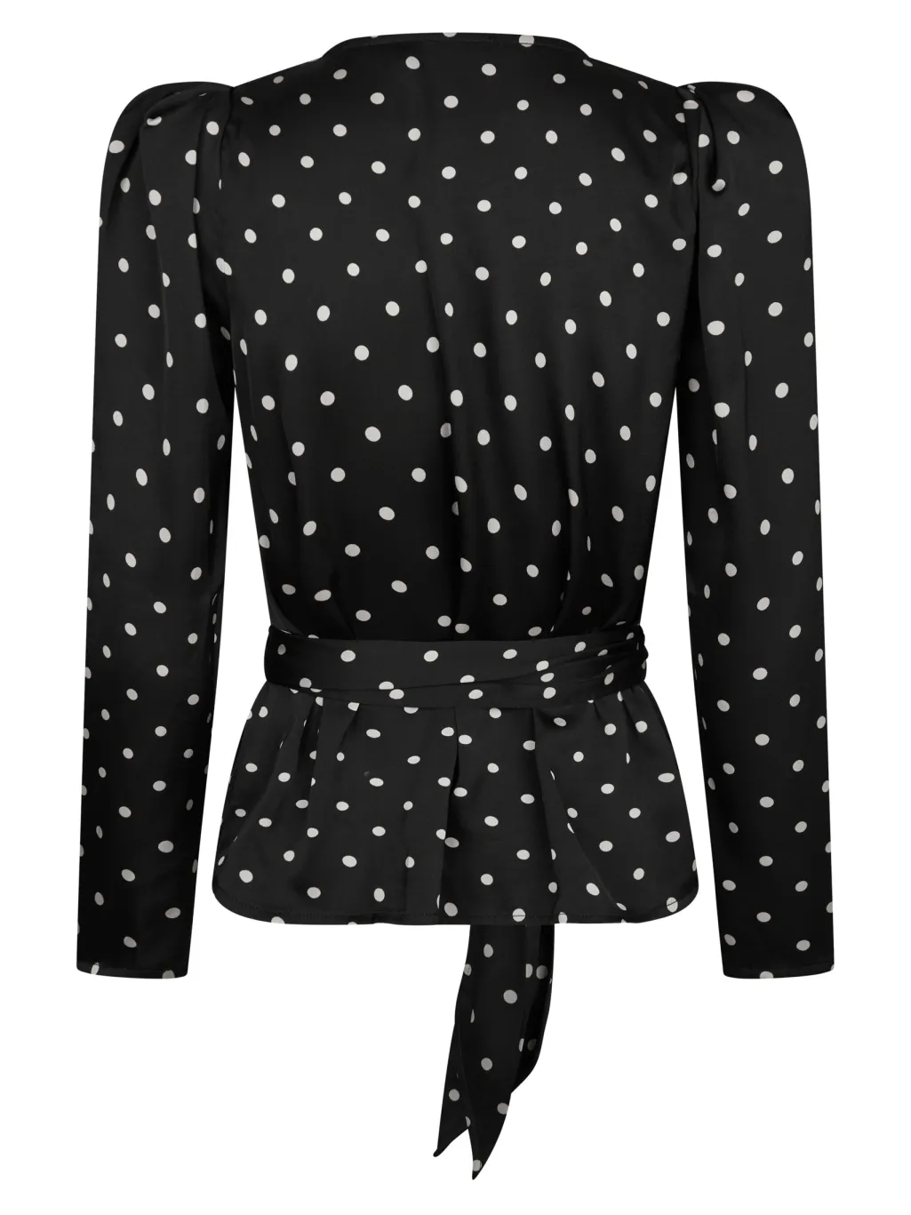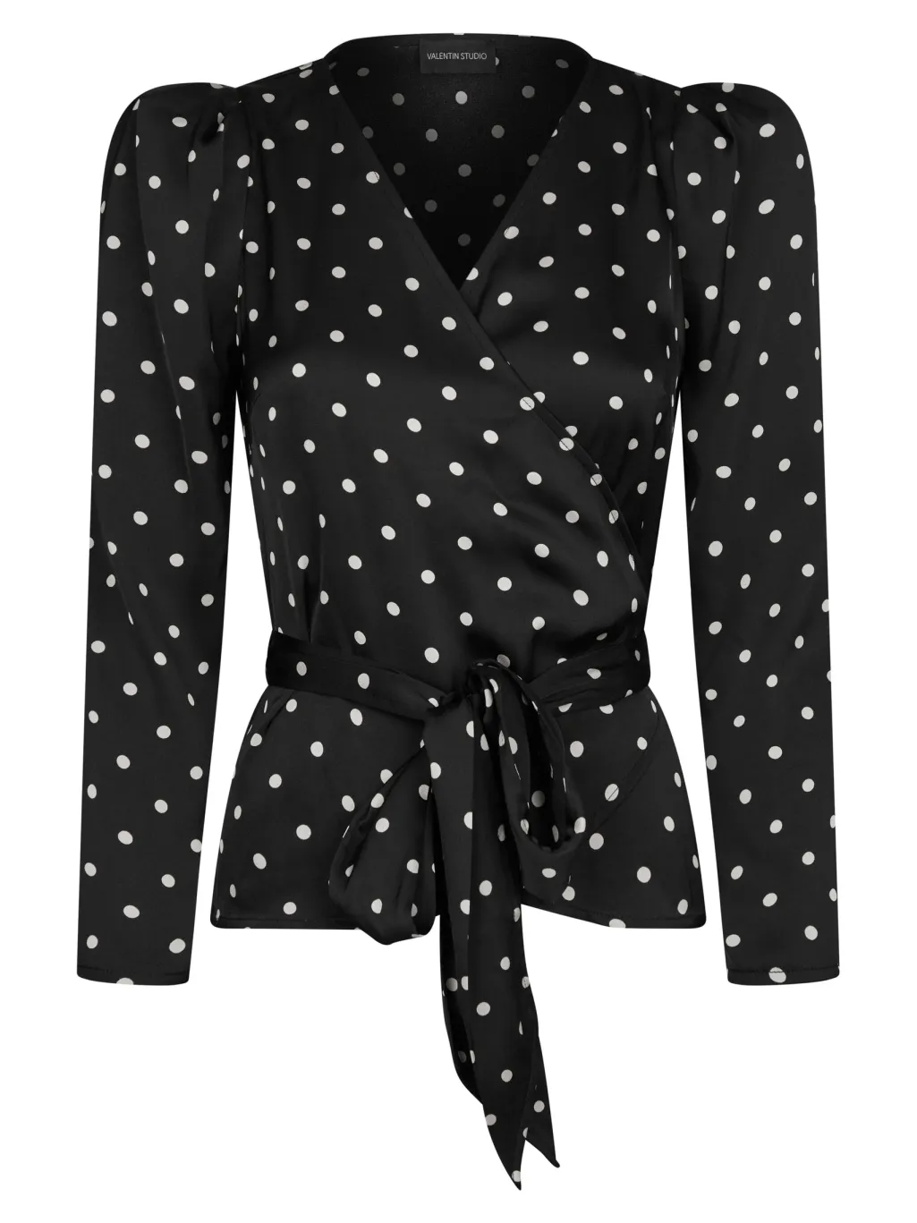 Sort slå-om-bluse fra Valentin Studio med hvide prikker. Blusen har en V-hals, lange ærmer og bindingsdetaljer foran.