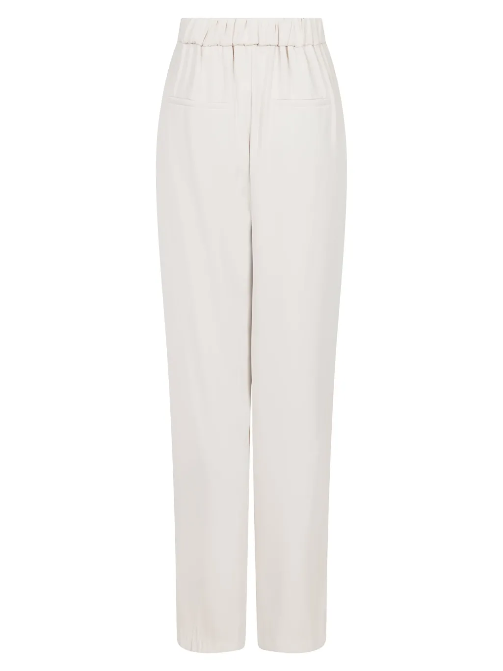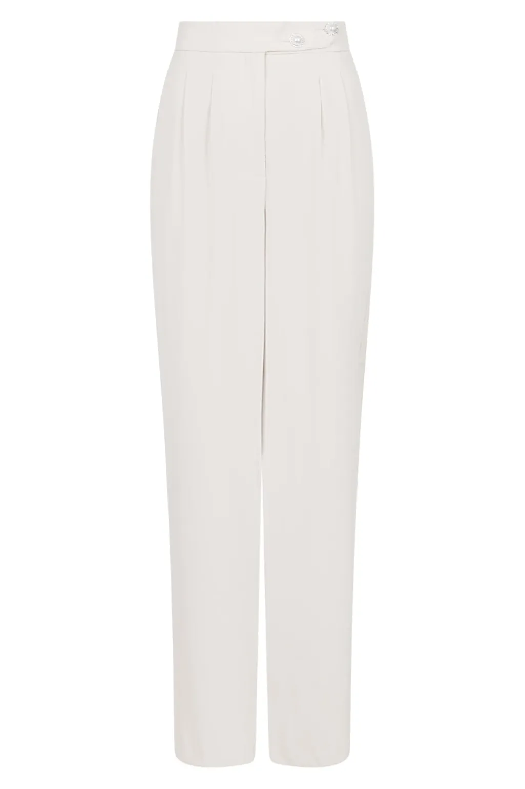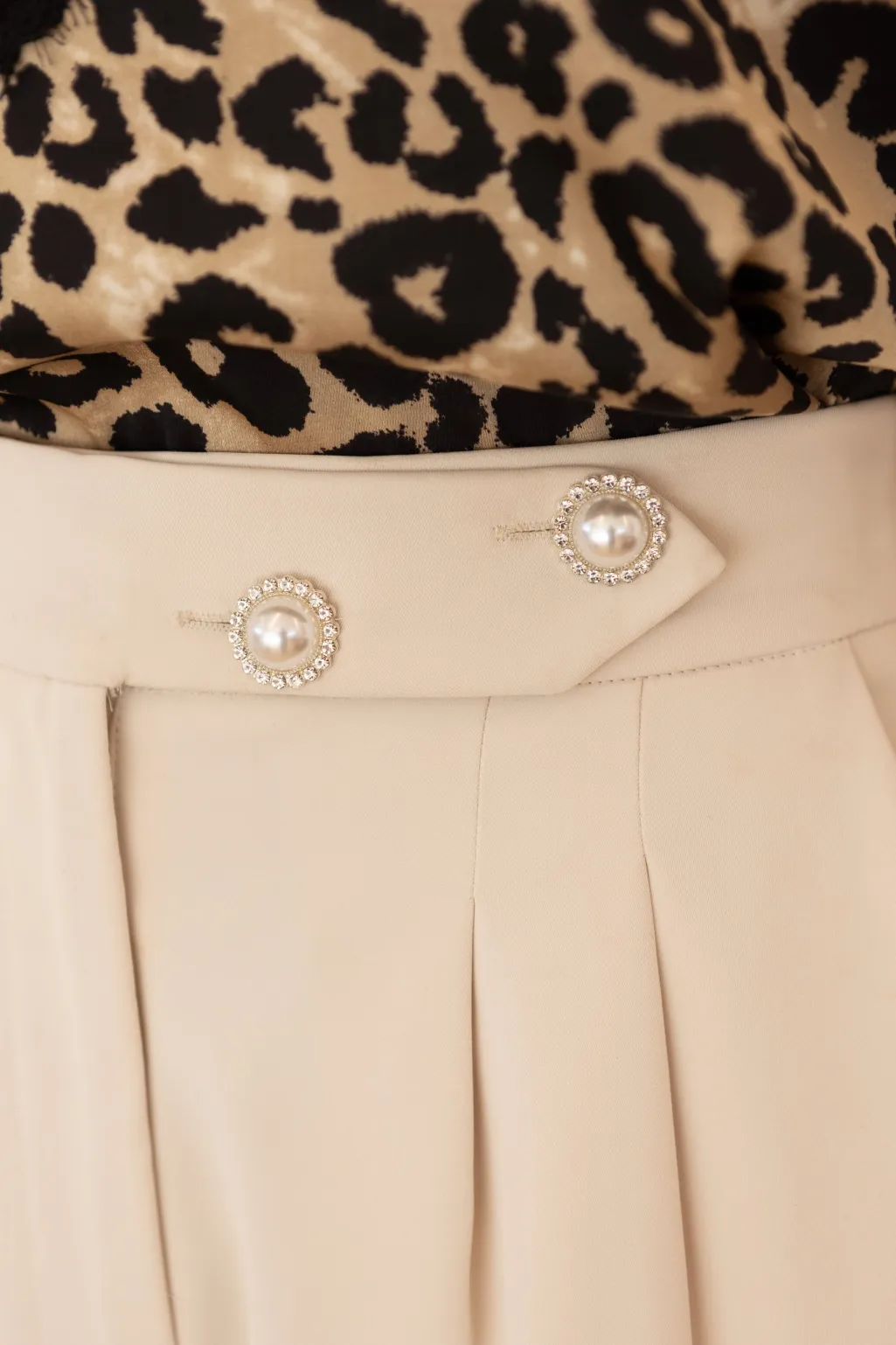 Cremefarvede bukser fra Valentin Studio med høj talje og plisseringer foran. Bukserne har en løs pasform med lommer og dekorative perleknapper ved taljen.